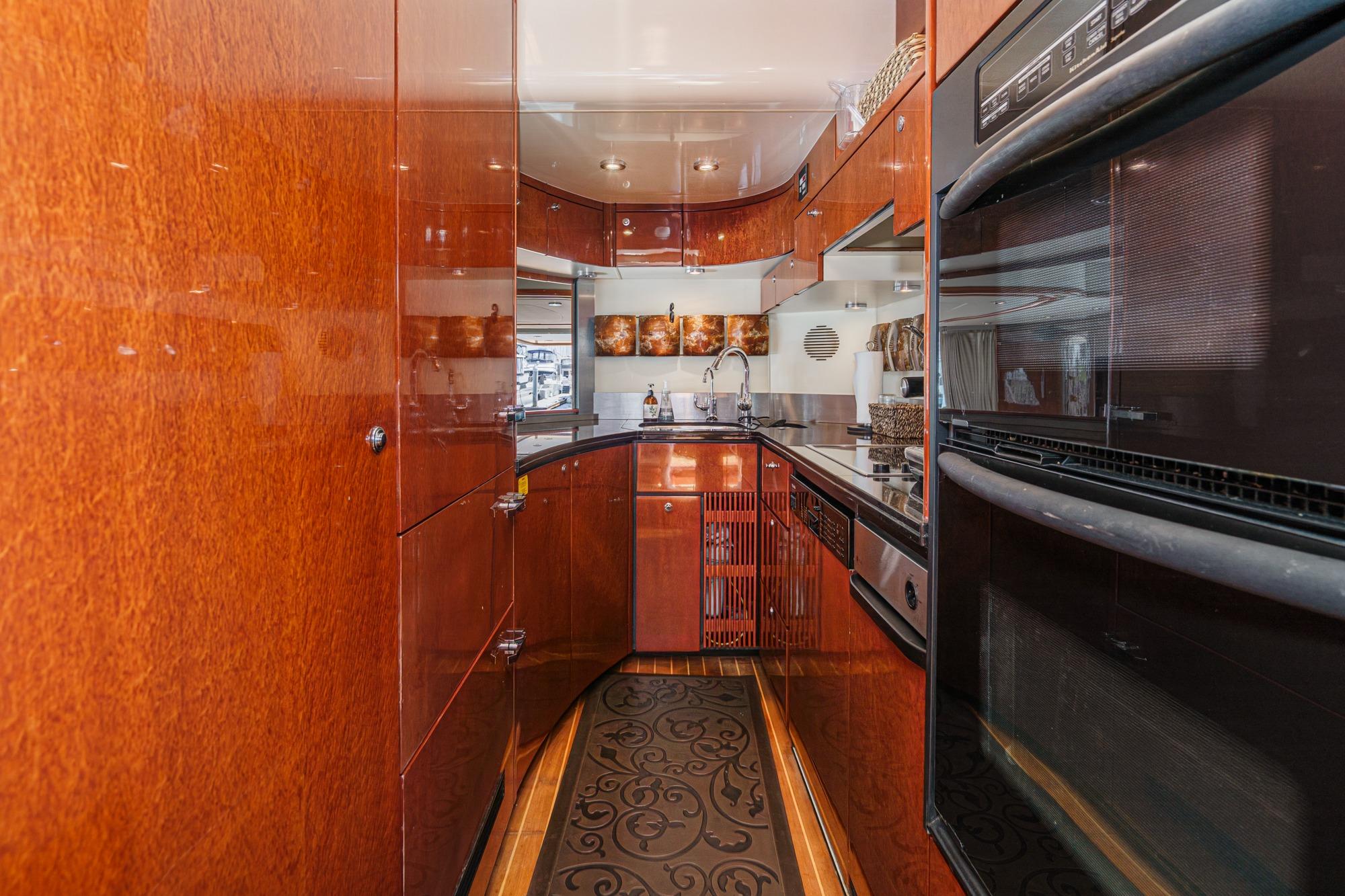 - Open plan galley with powered window screen for saloon privacy