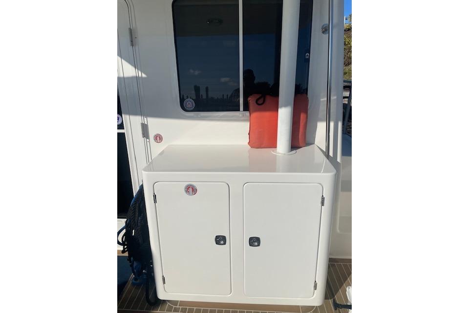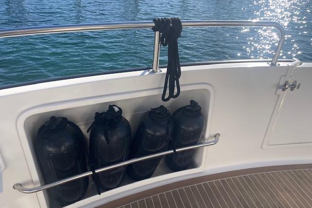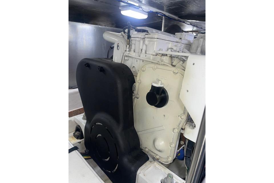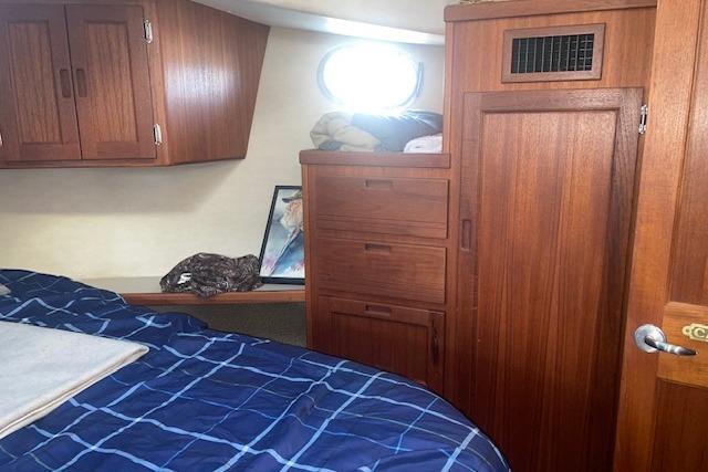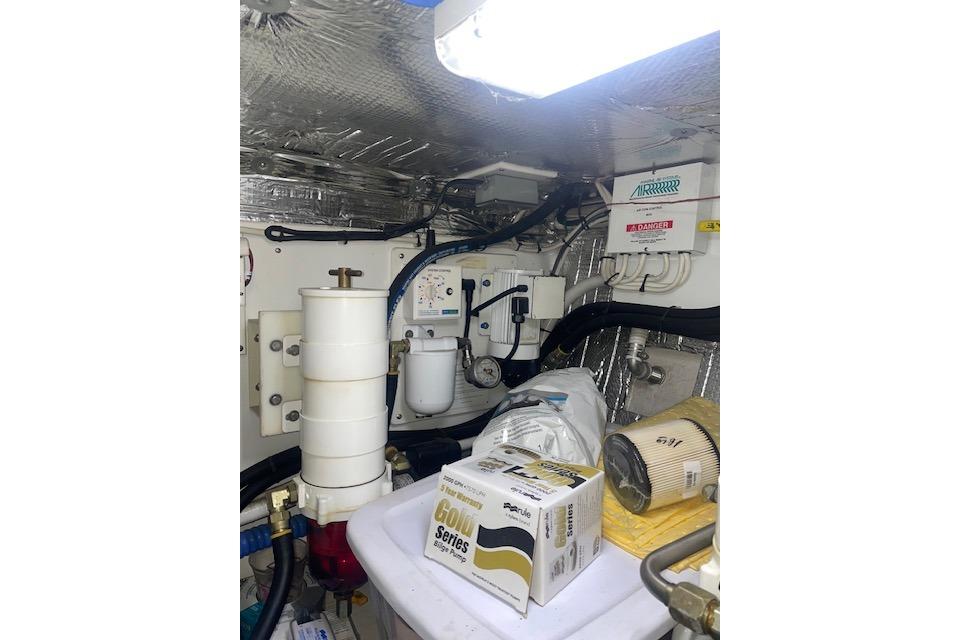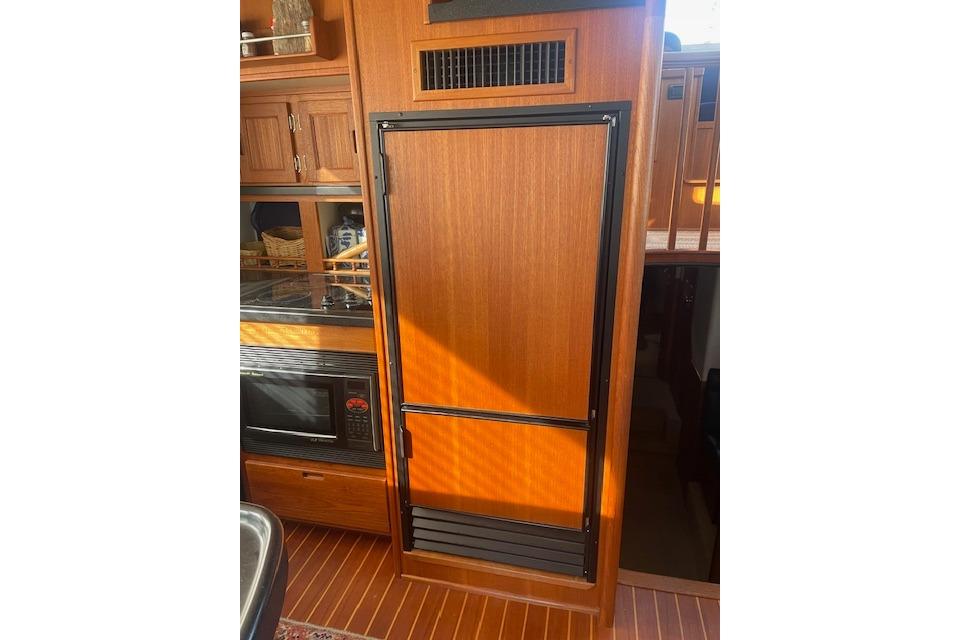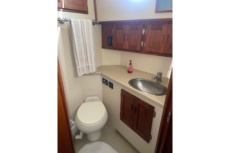 The master stateroom is located forward and features a queen size walk around berth, (2) bulkhead mounted reading lights, (3) SS portlights and a Bomar overhead deck hatch, storage cabinetry along the hull sides, his and hers hanging lockers with automatic lights and an ensuite head with Corian counter top. There is abundant storage under the berth and under the cabin sole.