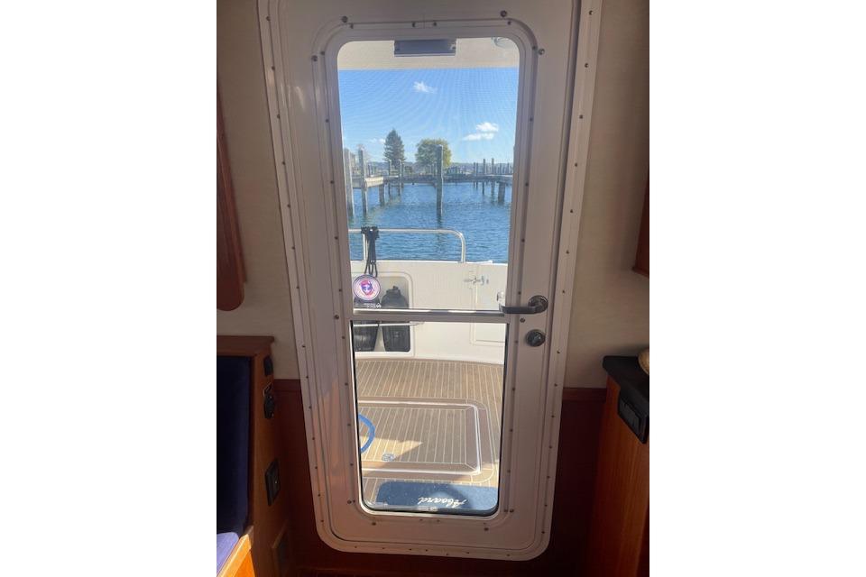 “Marla D” is a clean Fresh Water Nordic Tug and has been well cared for. The Nordic 42 features a roomy layout and a large ship-style helm. The bridge also features a large chart table, 360 degree view and convenient access directly to the deck. The Nordic 42's top speed is 18 knots, cruise 14 knots, or slow her down to 9 knots and burn under 3 gals / hour. Built to take the roughest passage with confidence, the hard chine semi-displacement hull gives this tug a stable quiet ride. The hull is hand laid fiberglass construction with full keel to protect the rudder and propeller.