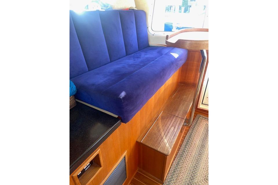 Up (4) steps you enter the main salon which features an L-shaped settee on the starboard side that converts to a double berth for the occasional guest. A chair is to port facing aft to the entertainment center. All tinted windows feature day / night shades, (2) opening side windows with screens. The main salon door features a double hung window.