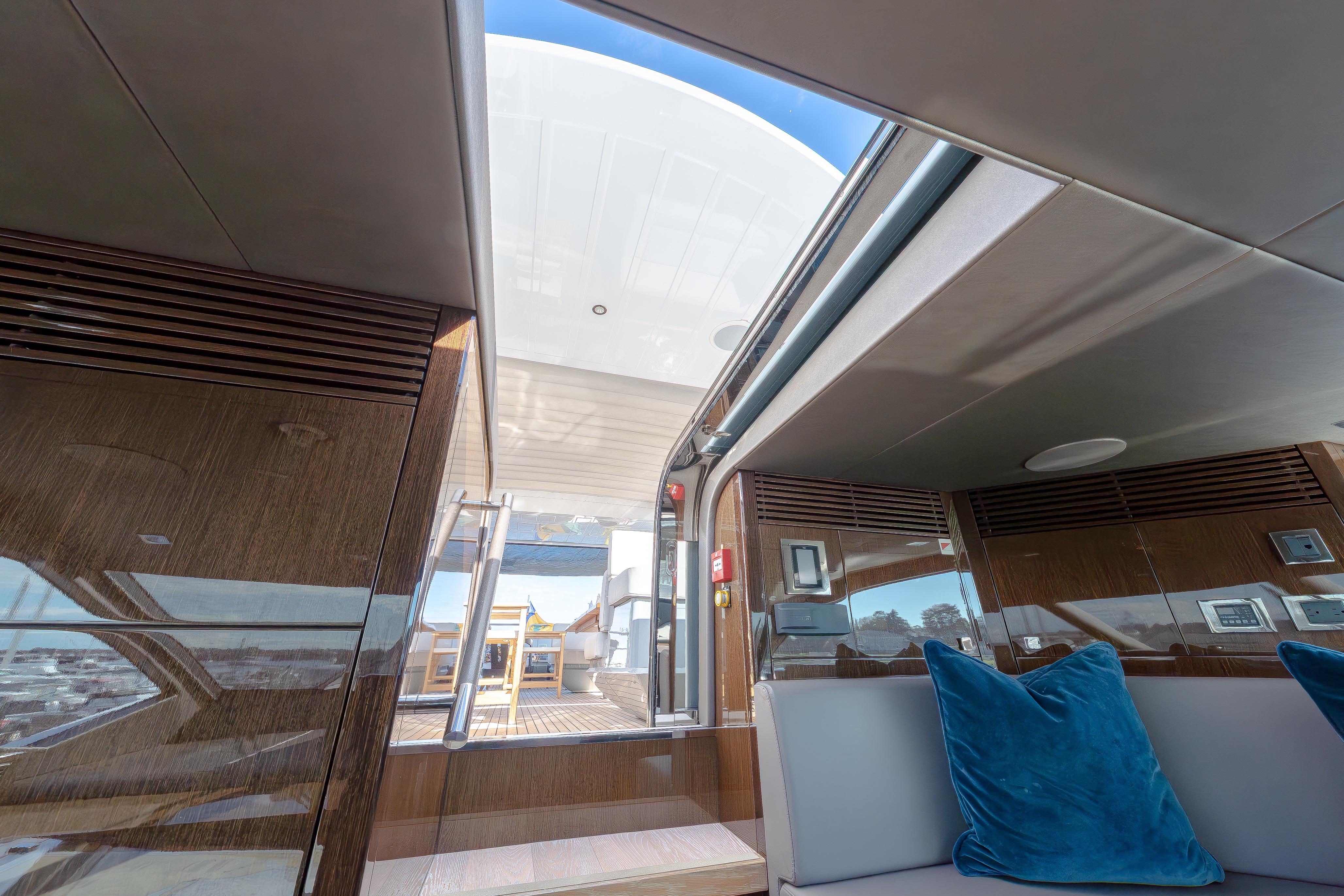 Above deck, the flybridge serves as the yacht's social hub, featuring expansive areas for dining and lounging. A custom wet bar is outfitted with premium amenities, including a refrigerator, ice maker, and grill, ideal for hosting gatherings. Additionally, the aft deck lounge with a coffee table offers a more intimate space for relaxation. The hardtop sunroof and retractable sunshade canopy provide the flexibility to enjoy open skies or cool shade, creating the perfect setting for entertaining or unwinding while taking in sweeping, panoramic views.