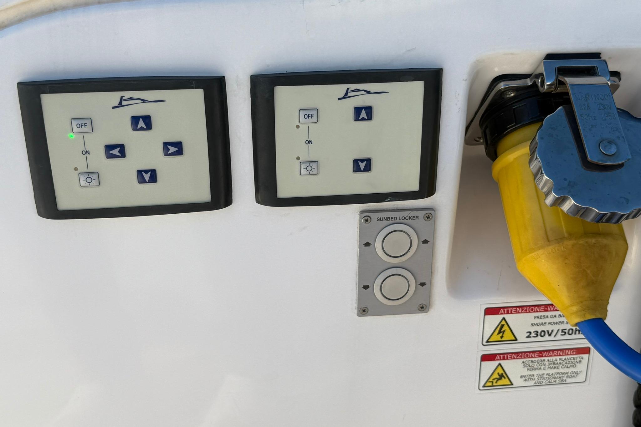 Espaces à Vivre : Table de cockpit électrique convertible en bain de soleil. Deux frigos intégrés dans la banquette arrière.