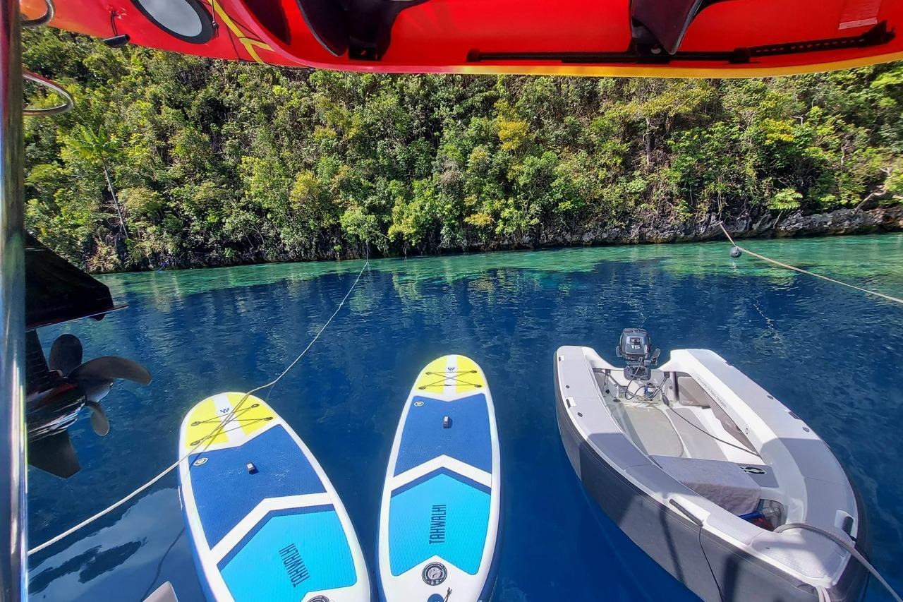 The spacious two-stateroom layout, each with its own head and shower provide ample comfort for all guests. Key features include the 100HP Yanmar Diesel engine, electric winches, new Raymarines, bow thruster, generator, super water maker, washing machine and the dual autopilot systems.