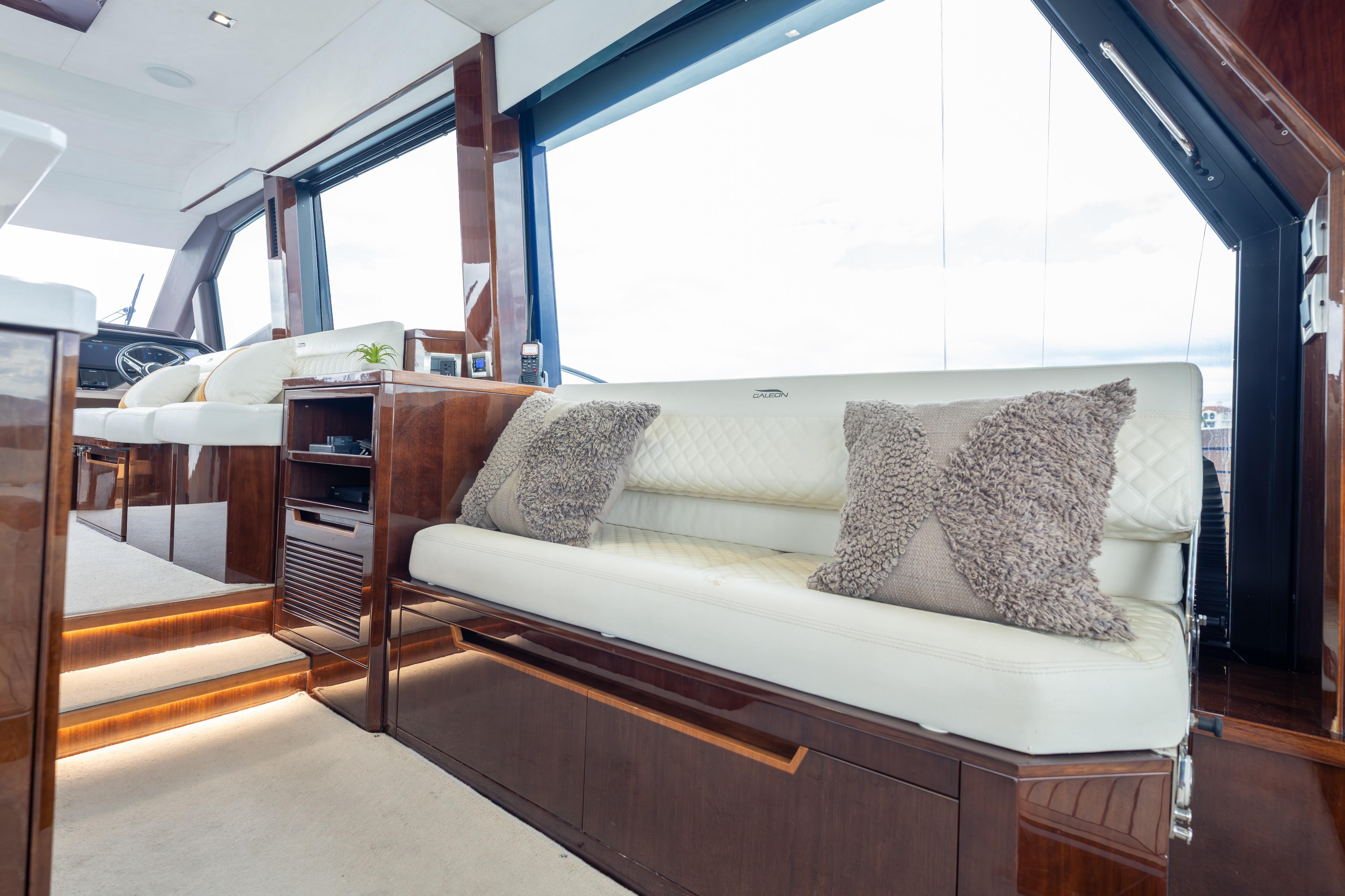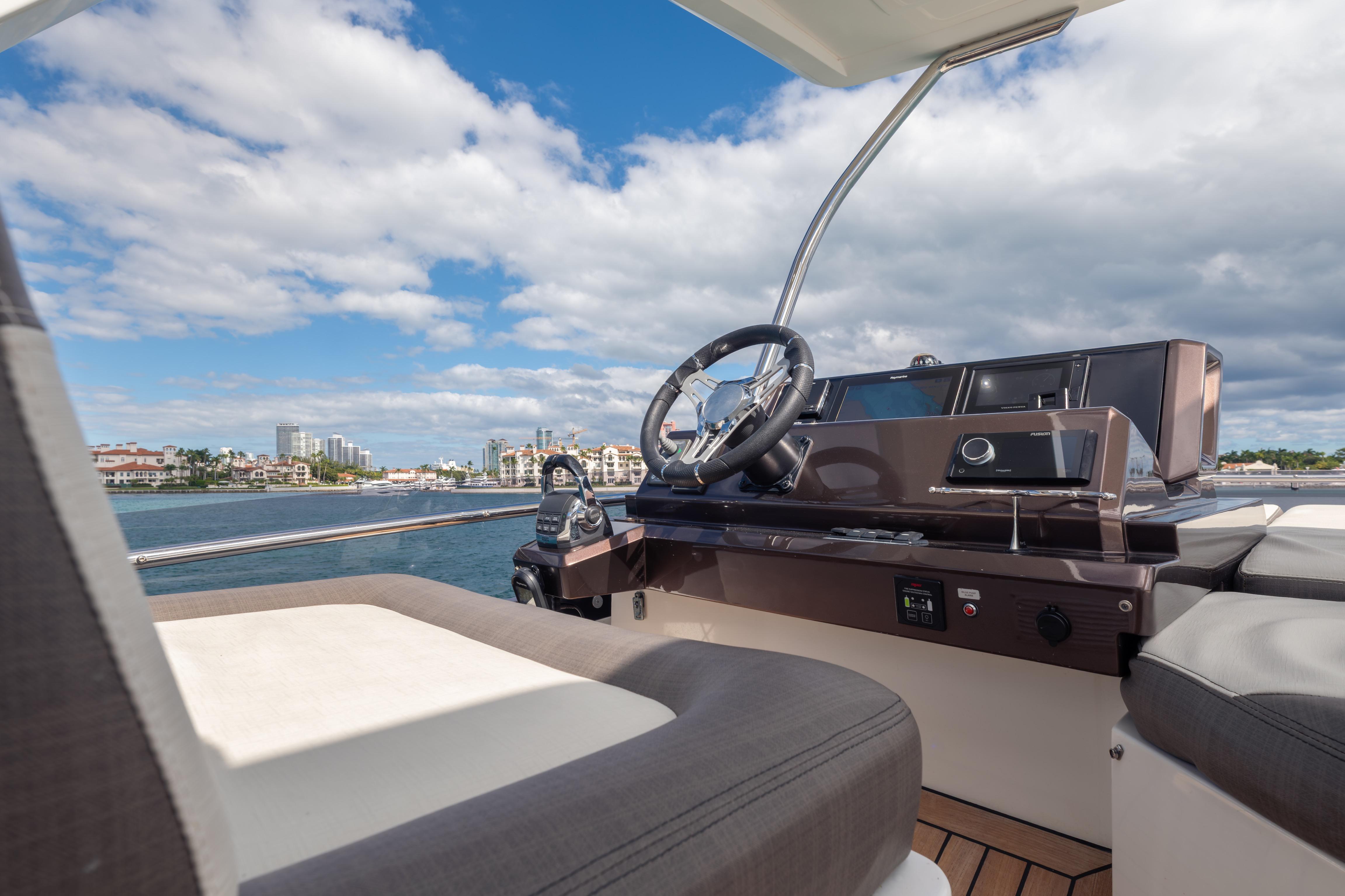 Helm station: Compass, cupholders, doublewide helm seat, USB outlets, 7" Volvo EVC Panel, switches, fire system monitor, engine ignition panel, trim tab control, dual lever control, Galeon steering wheel, Fusion 12V AM/FM stereo with Bluetooth