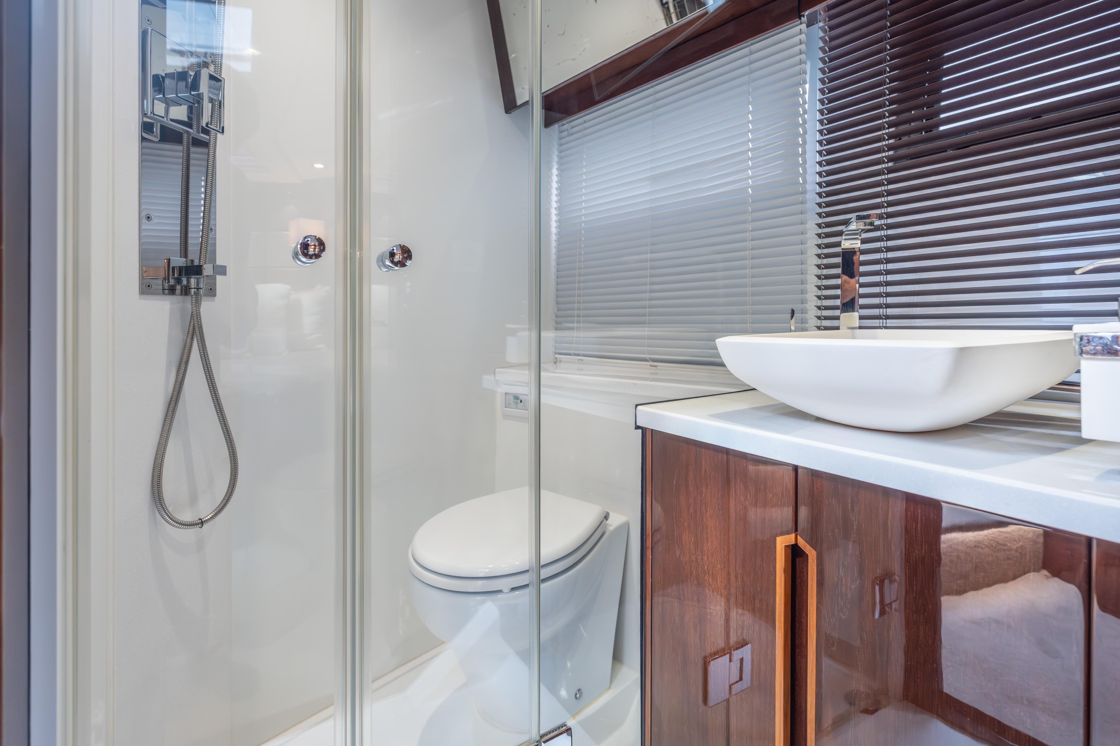 Separate toilet and shower area with hinged plexiglass door, Corian panel, chrome shower system with spray wand, toilet with electric pump & macerator