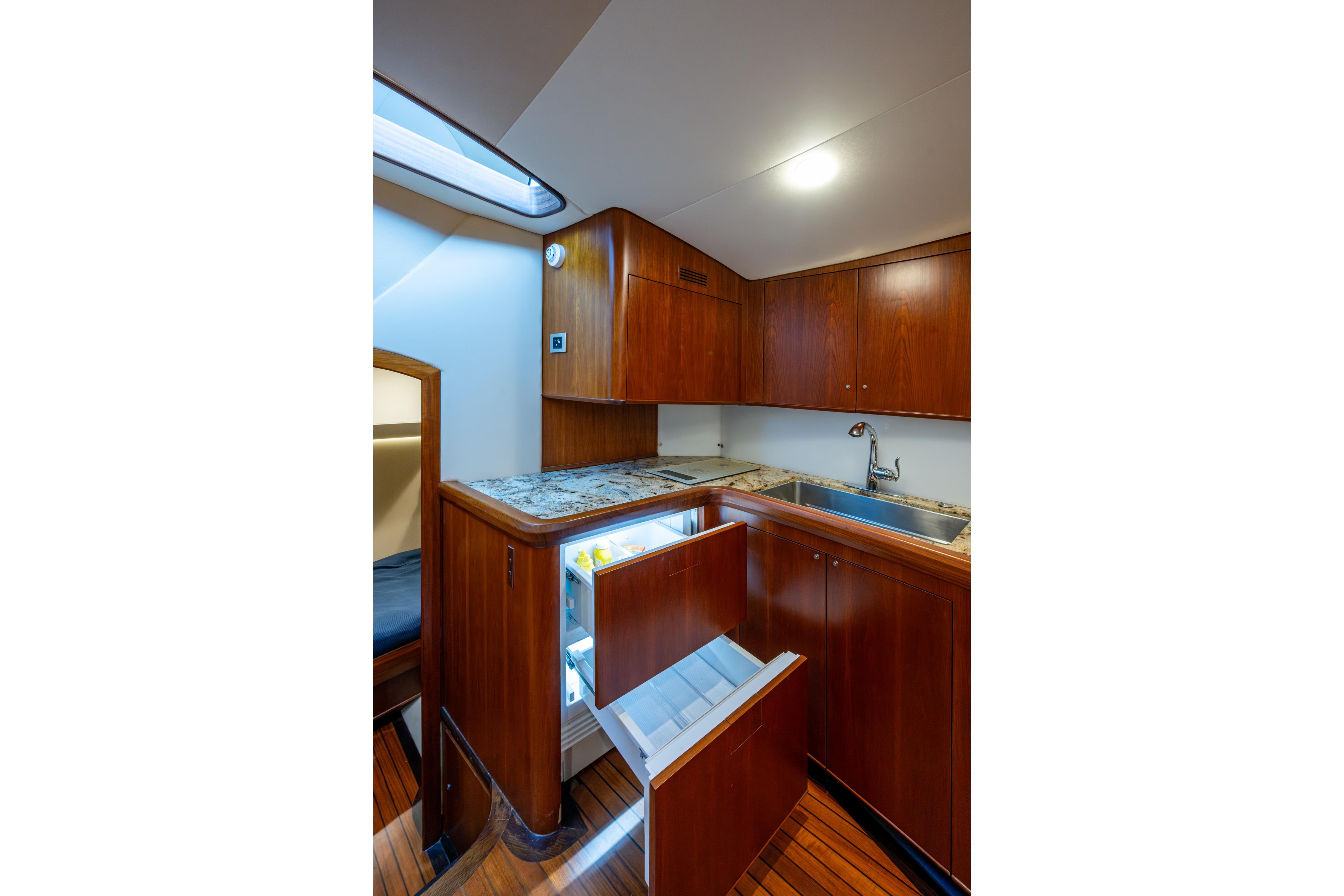 Entering into the large helm area through an electric faux finished door, you notice the well thought out helm with abundant seating that offers incredible visibility whether cruising or fishing. The helm offers some of the same creature comforts of down below featuring a Subzero refrigerator/freezer, ice maker, and 43" LG TV, custom u-shaped lounge seating with electric hi-low teak table that lowers and converts to additional berth, down 3 steps into the main cabin you will notice the head located to starboard and aft, the galley is to port, a large couch is to starboard, you access the VIP stateroom aft to port and features 2 large over/under berths. The master stateroom is located all the way forward with a centerline queen berth.