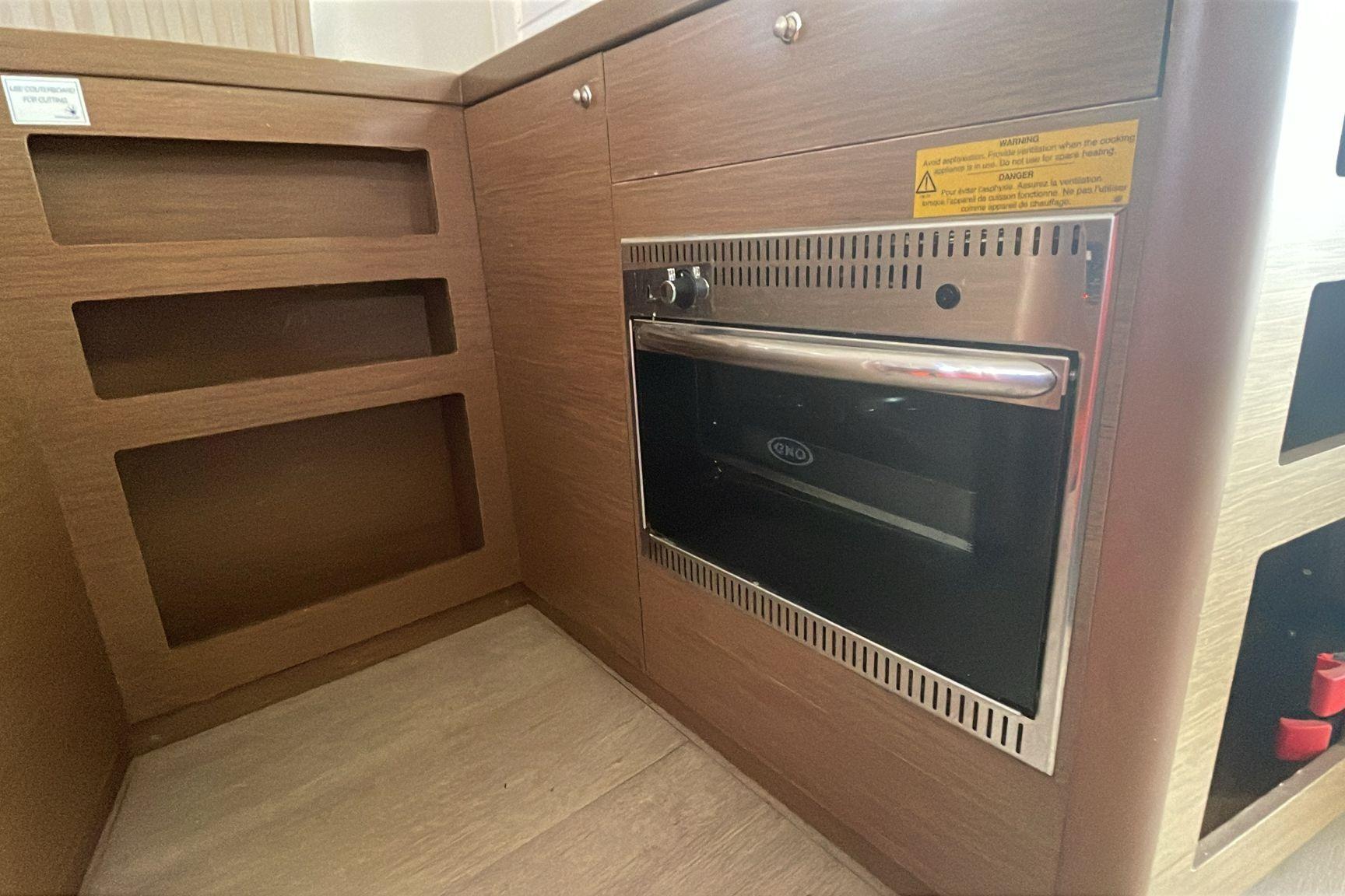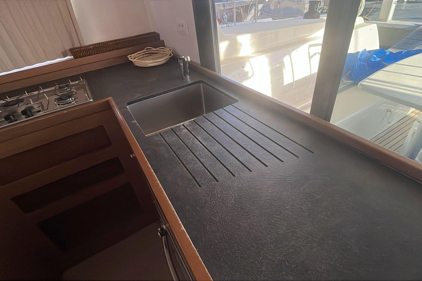 Just two steps separate the swim platform and the cockpit. The ergonomic design guarantees space and fluid movement on board. Sheltered and well ventilated, the cockpit is an open invitation to relax. Accommodations this boat is offered in the four cabin four head layout. The Lagoon 42 offers sleeping accommodation for up to 12 people, with a double berths fore and aft in the port hull and aft in the starboard hull. There are four heads amidships, two in the port hull and two in the starboard hull. The main salon has a U-shaped settee, plus there is a U-shaped settee in the cockpit. The galley is located on the port side of the salon. The galley is L-shaped and is equipped with a stove, a double stainless steel sink and oven.
