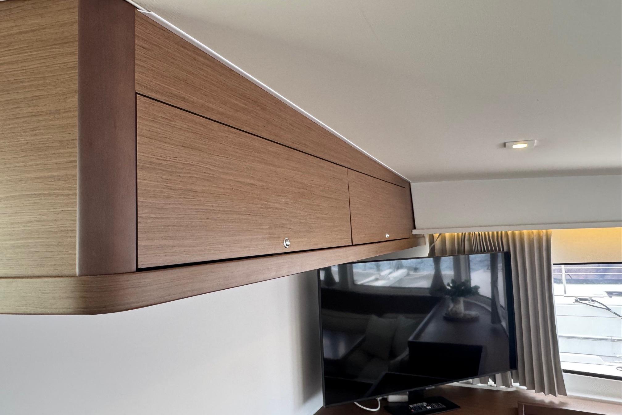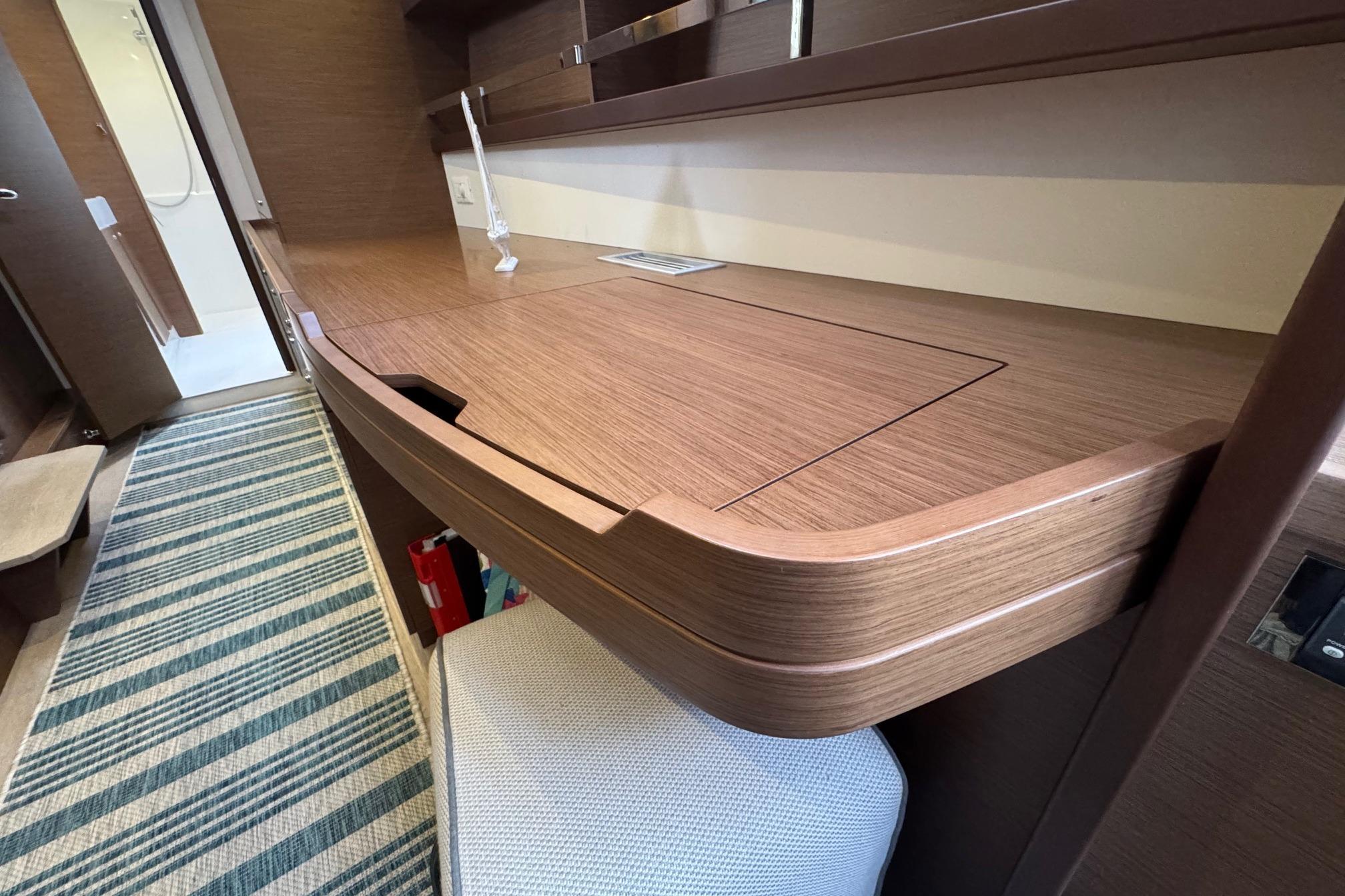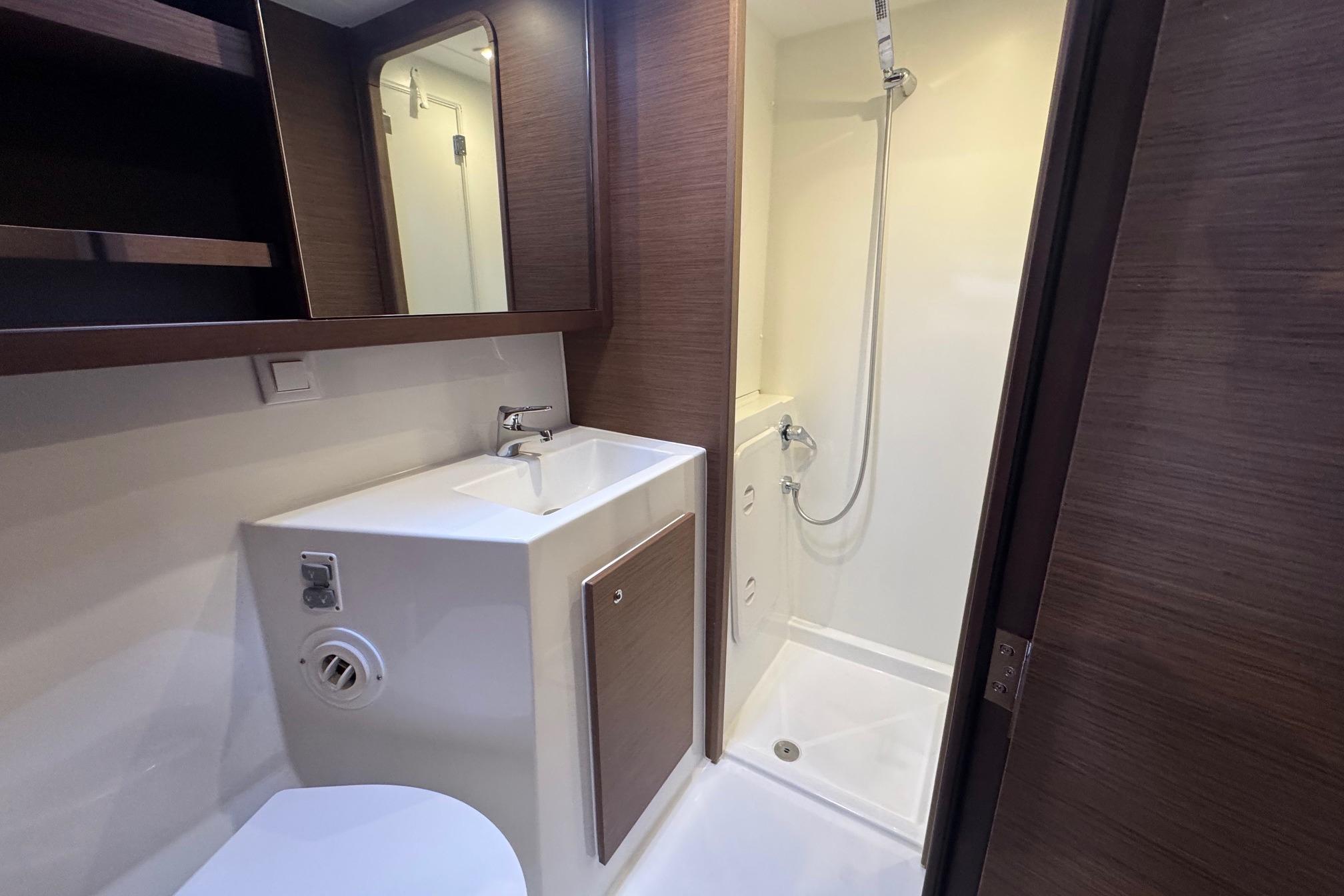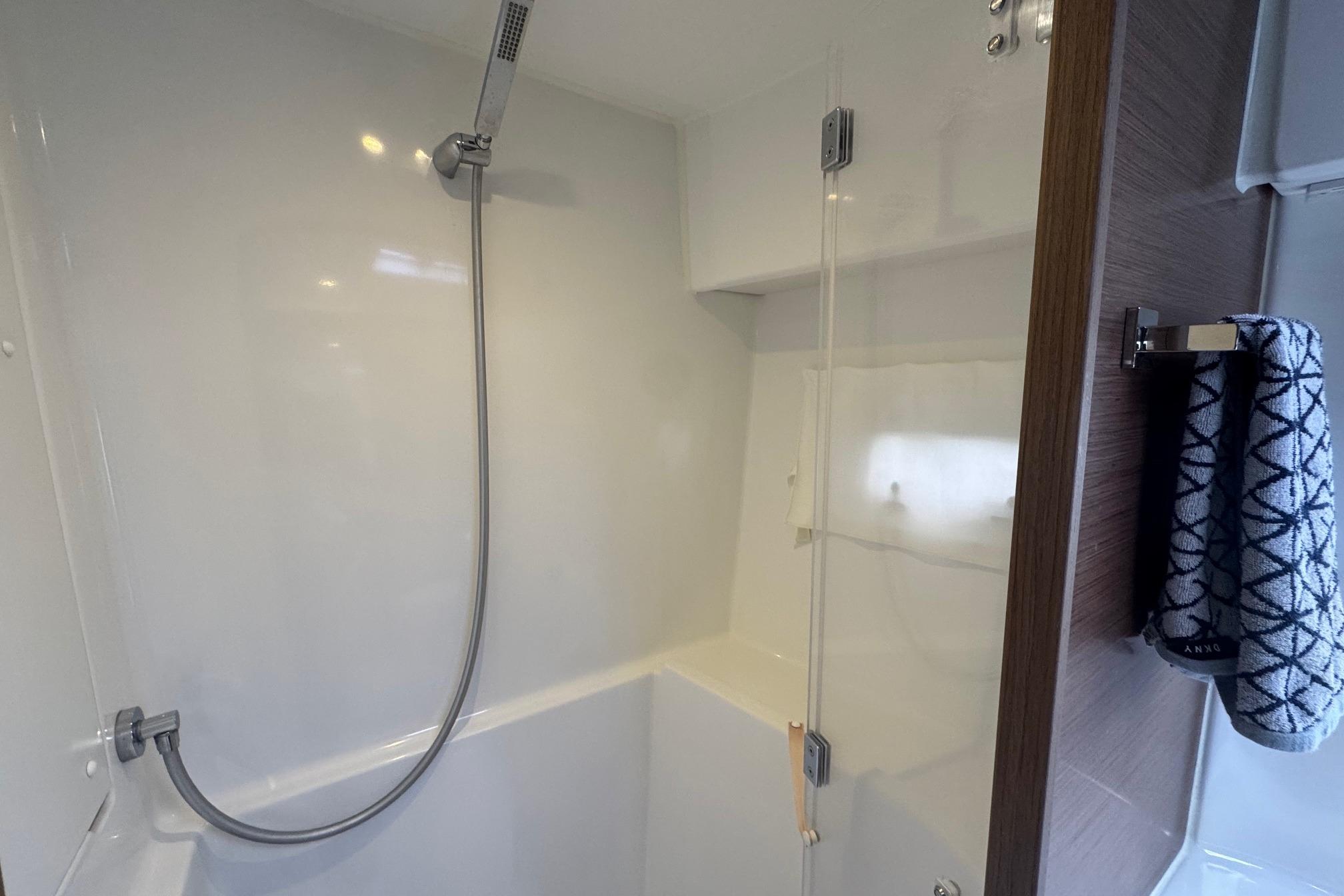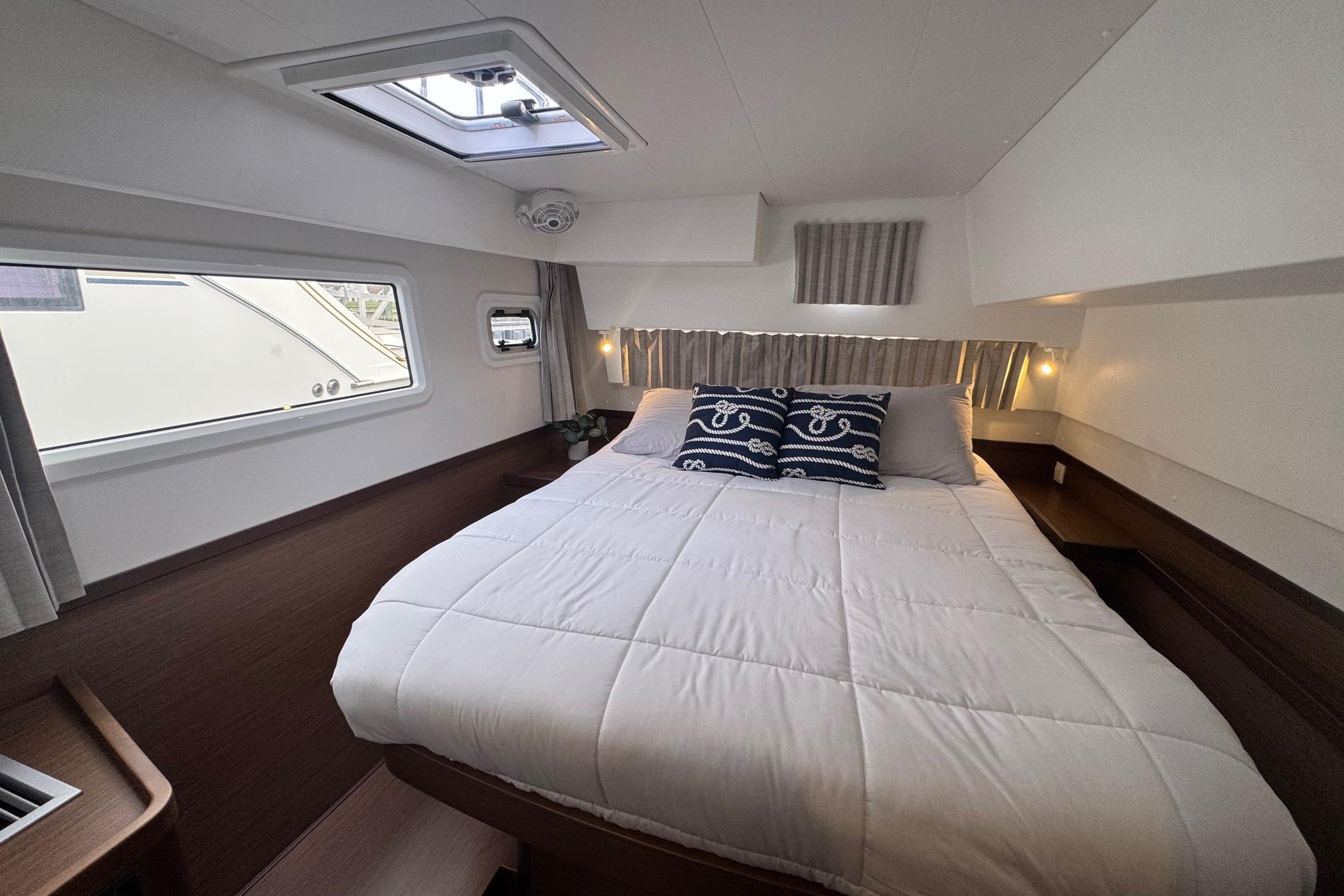 The Owner’s Version configuration dedicates the entire starboard hull to a spacious owner’s suite with an oversized head and separate shower. The port hull features two well-appointed guest cabins, each with its own en-suite head, offering excellent comfort and privacy for family or guests.