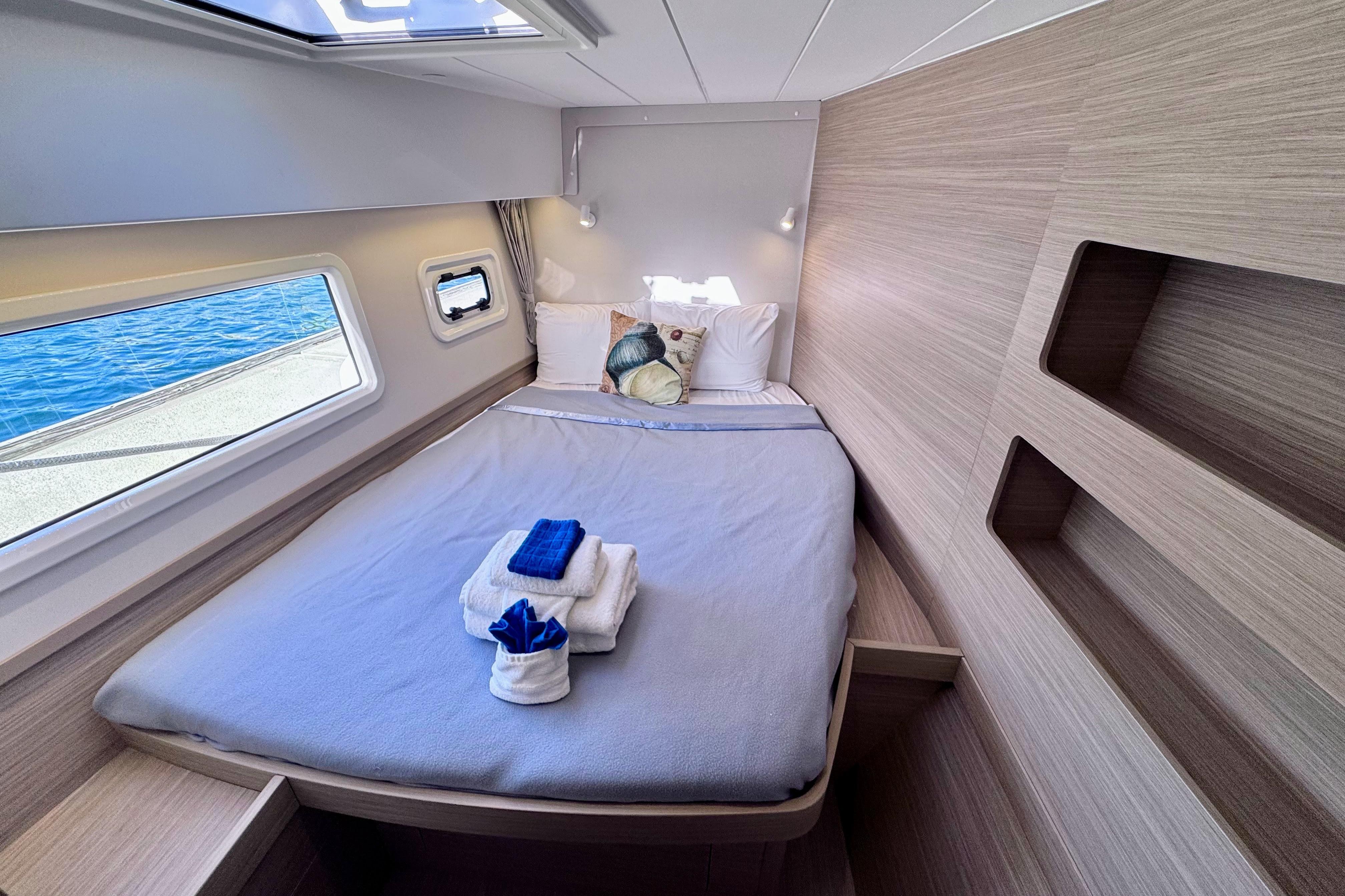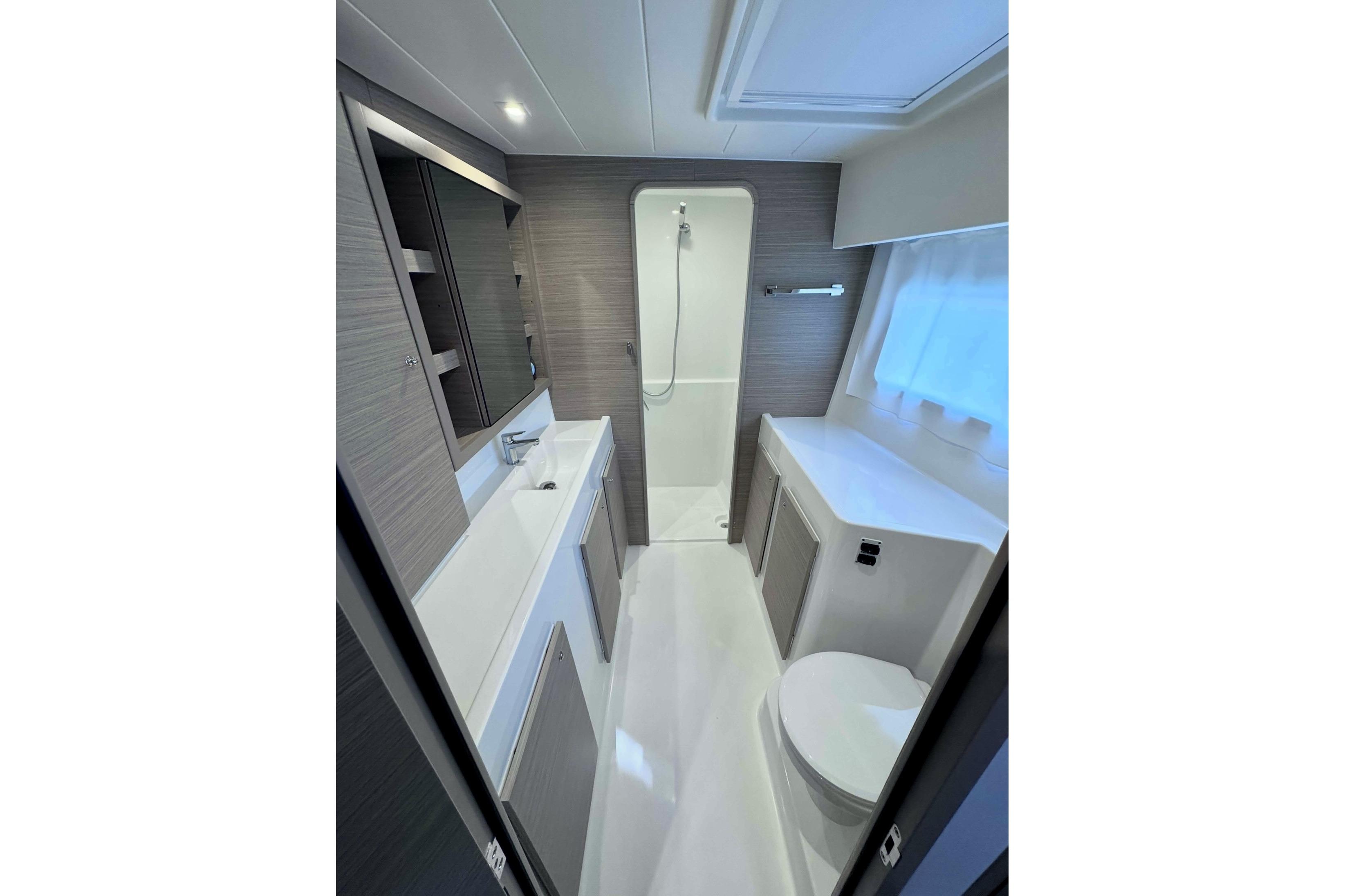 This vessel features the sought-after Owner’s Version layout, providing a spacious master suite with private head and shower, plus two beautifully appointed guest cabins. The interior is bright and airy, showcasing Lagoon’s signature modern finishes and excellent visibility from every angle.