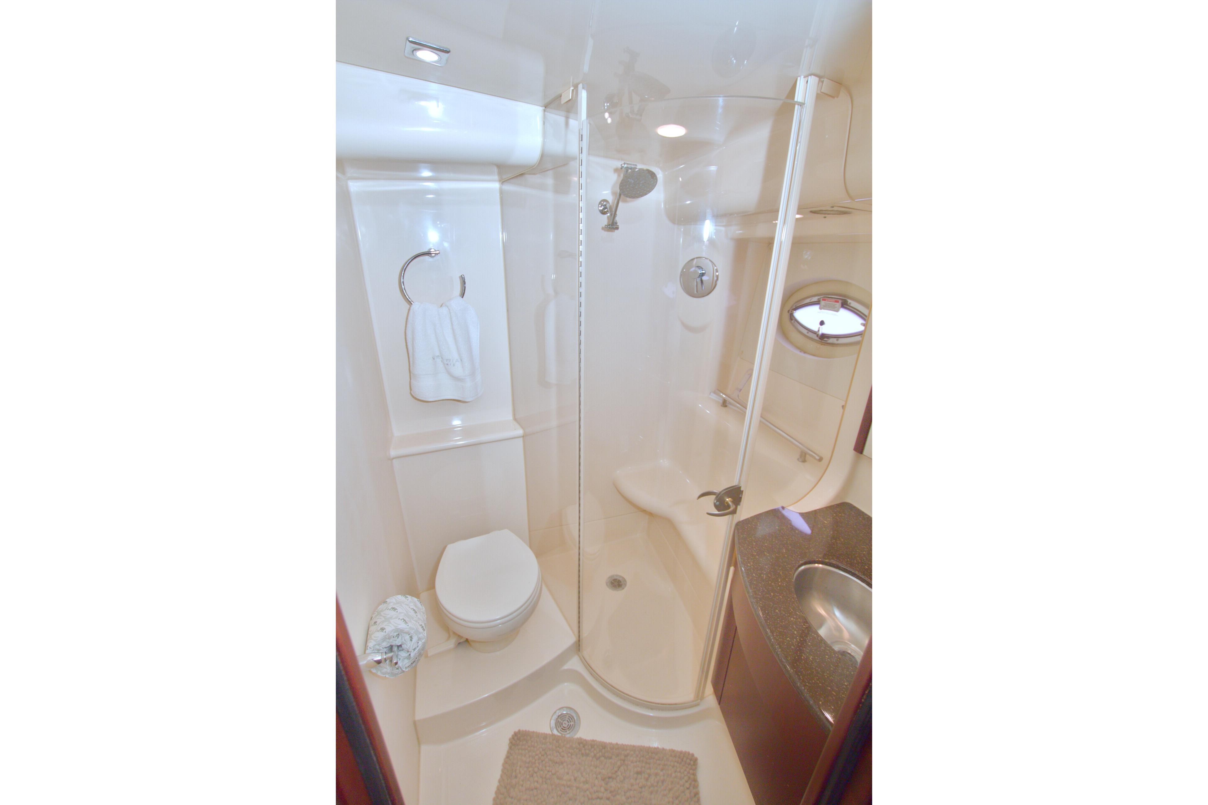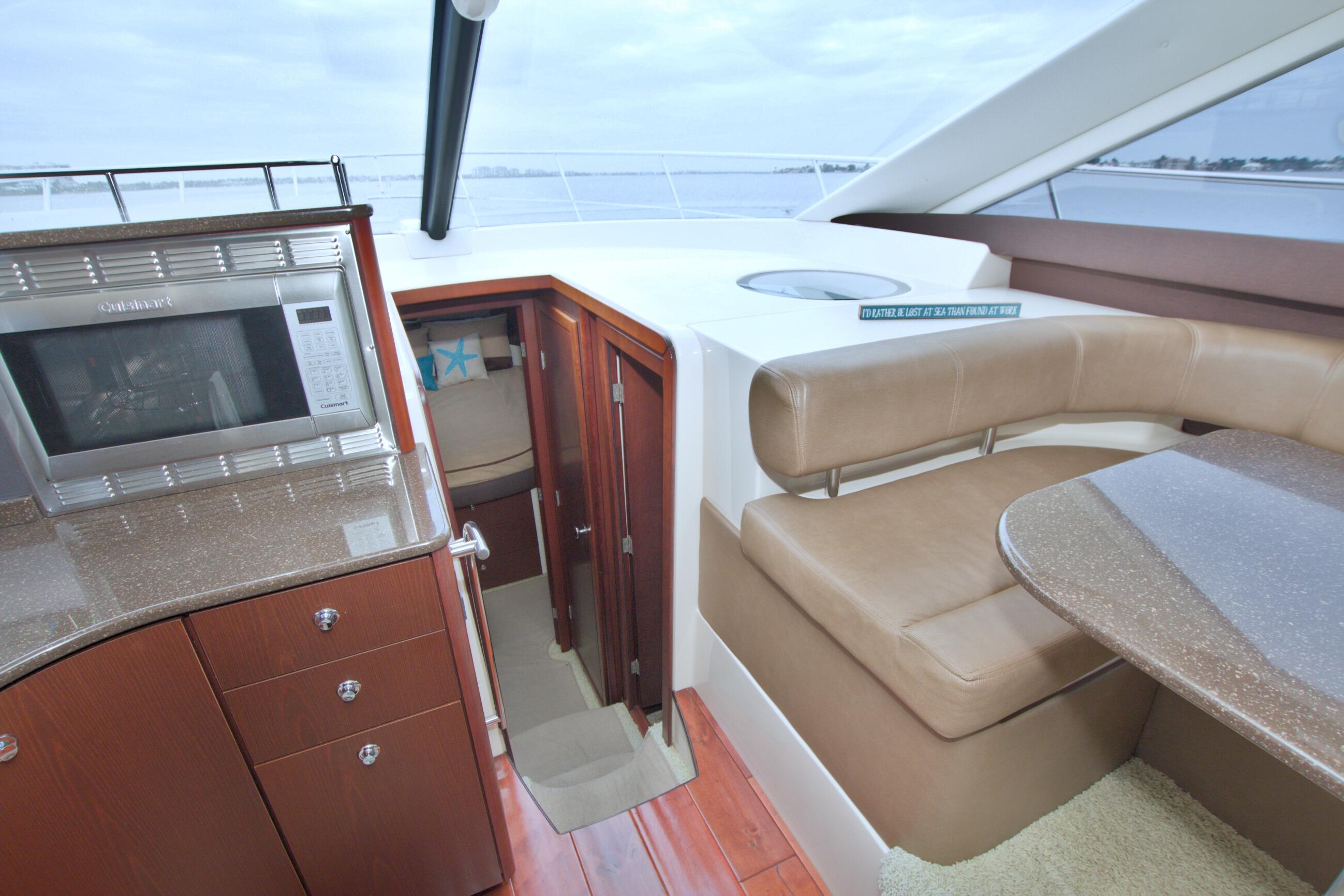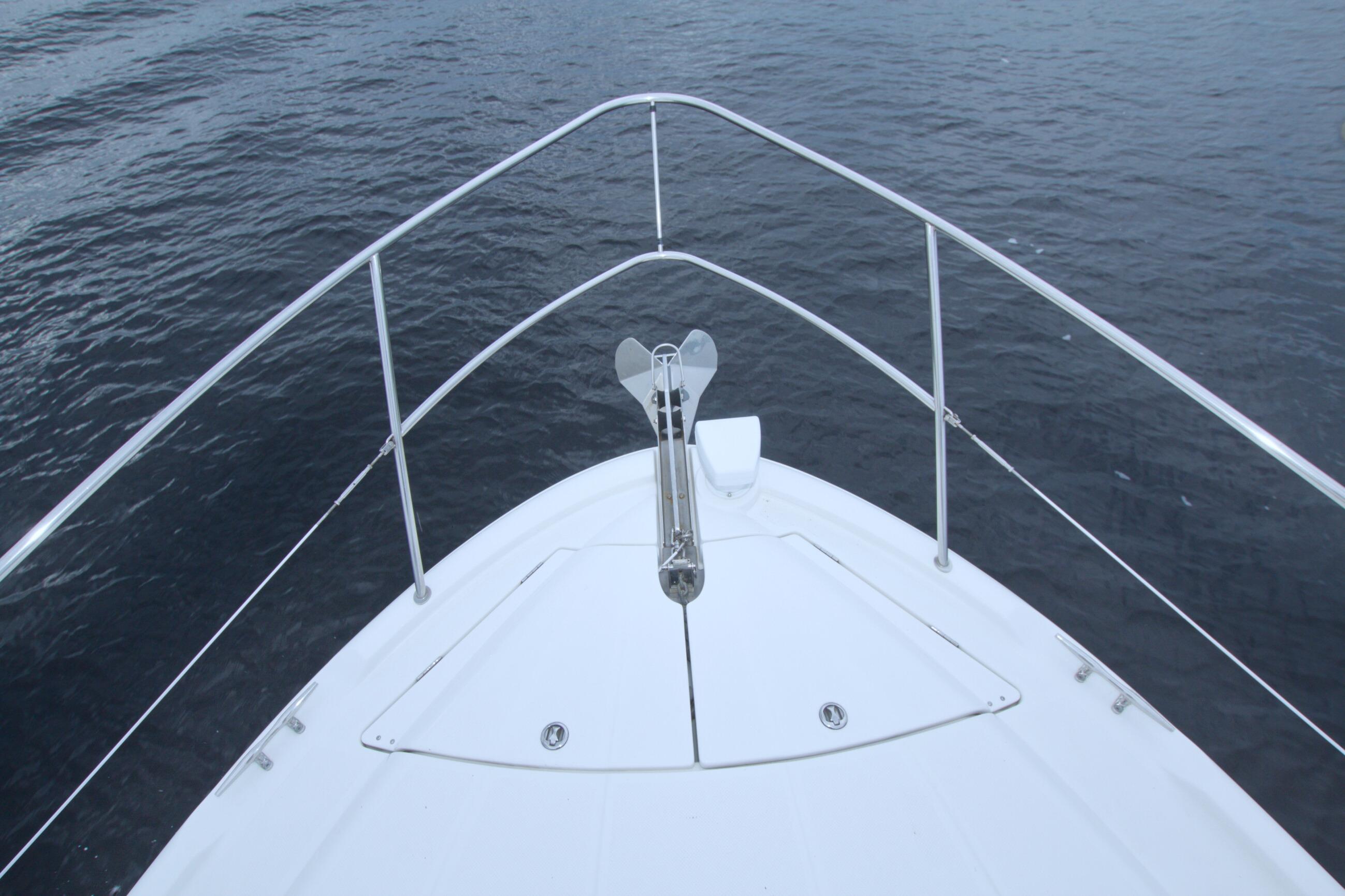 The 441 Sedan features an open, light-filled salon with 360° visibility, a raised galley and dinette, and a large flybridge with air conditioning and hardtop enclosure. Below, a two-stateroom, two-head layout includes a private forward master suite and a spacious full-beam VIP guest stateroom midship.