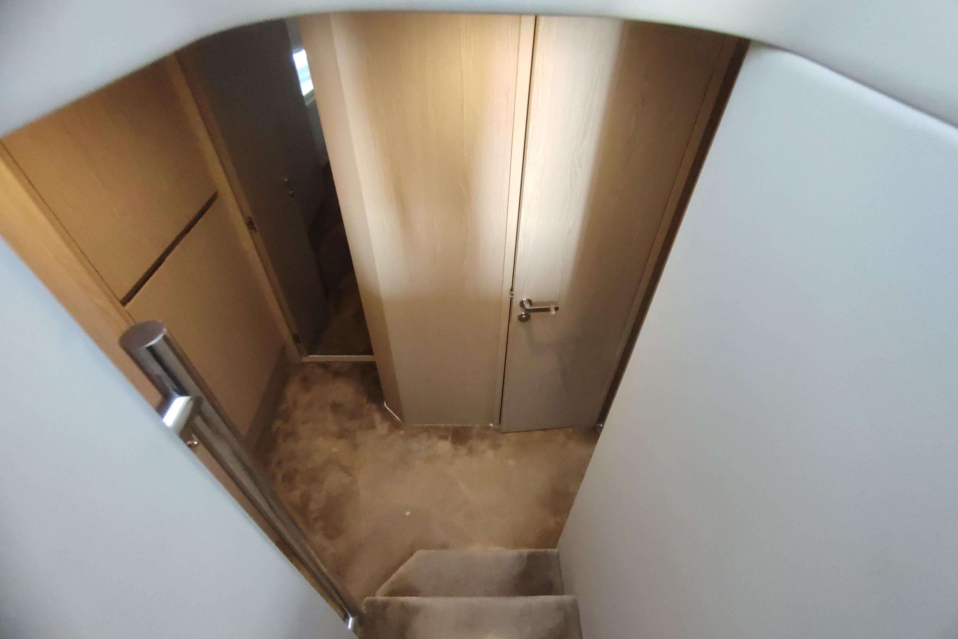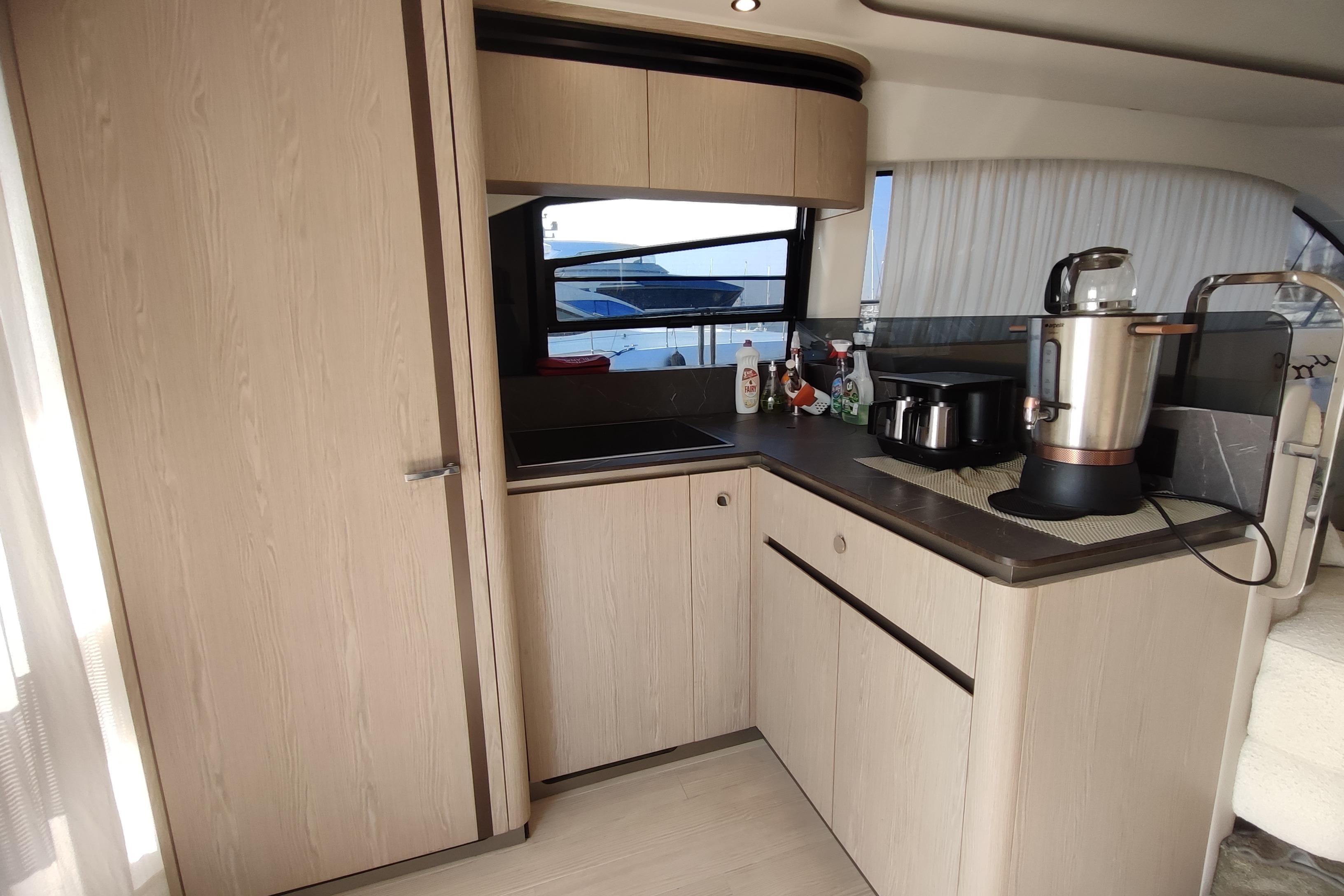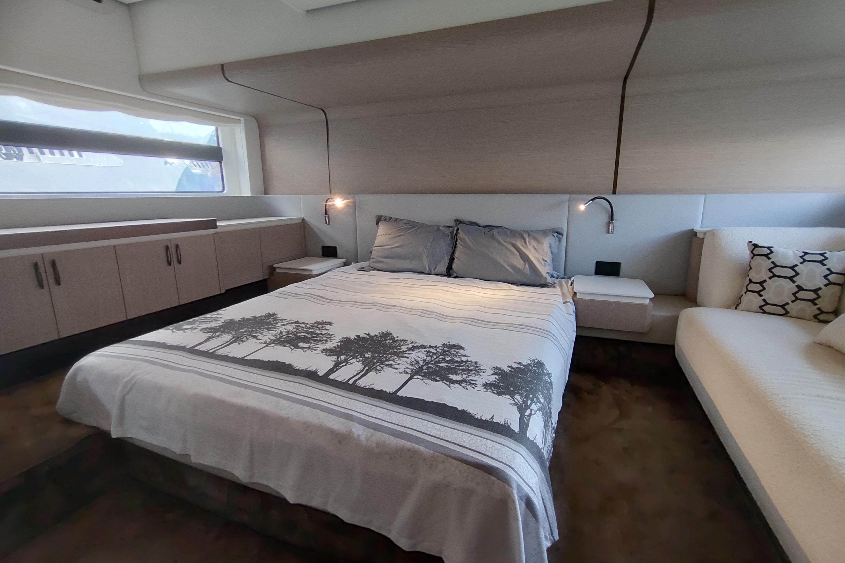 The interior showcases Azimut’s signature craftsmanship — elegant finishes, natural light, and thoughtful layout. The bright salon features large panoramic windows, adjustable dining table, dimmable lighting, and Besana Moon carpeting. The galley is equipped with Miele appliances, dishwasher, wine cooler, home-style refrigerator, and washer-dryer combo, making her ideal for extended stays at sea.