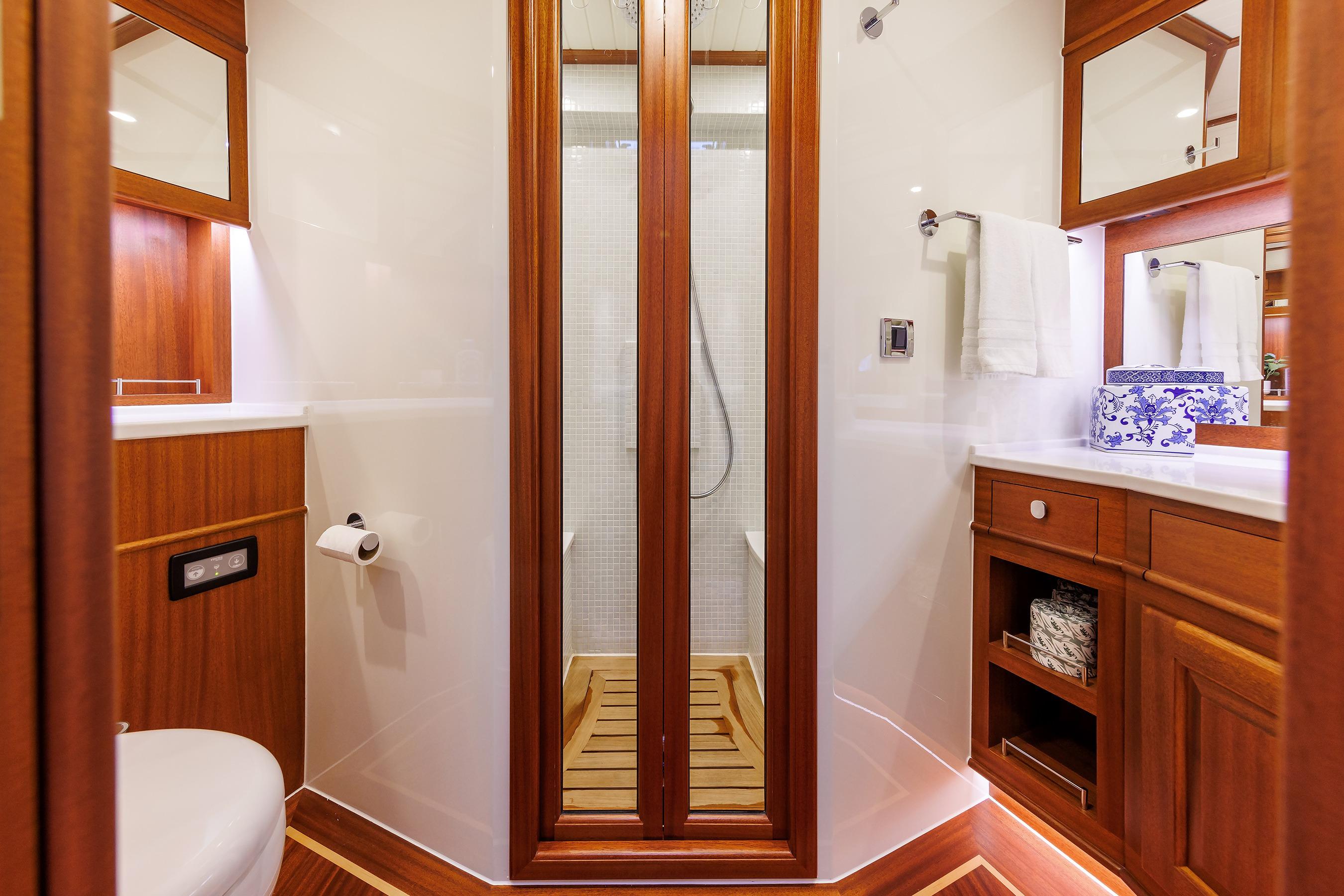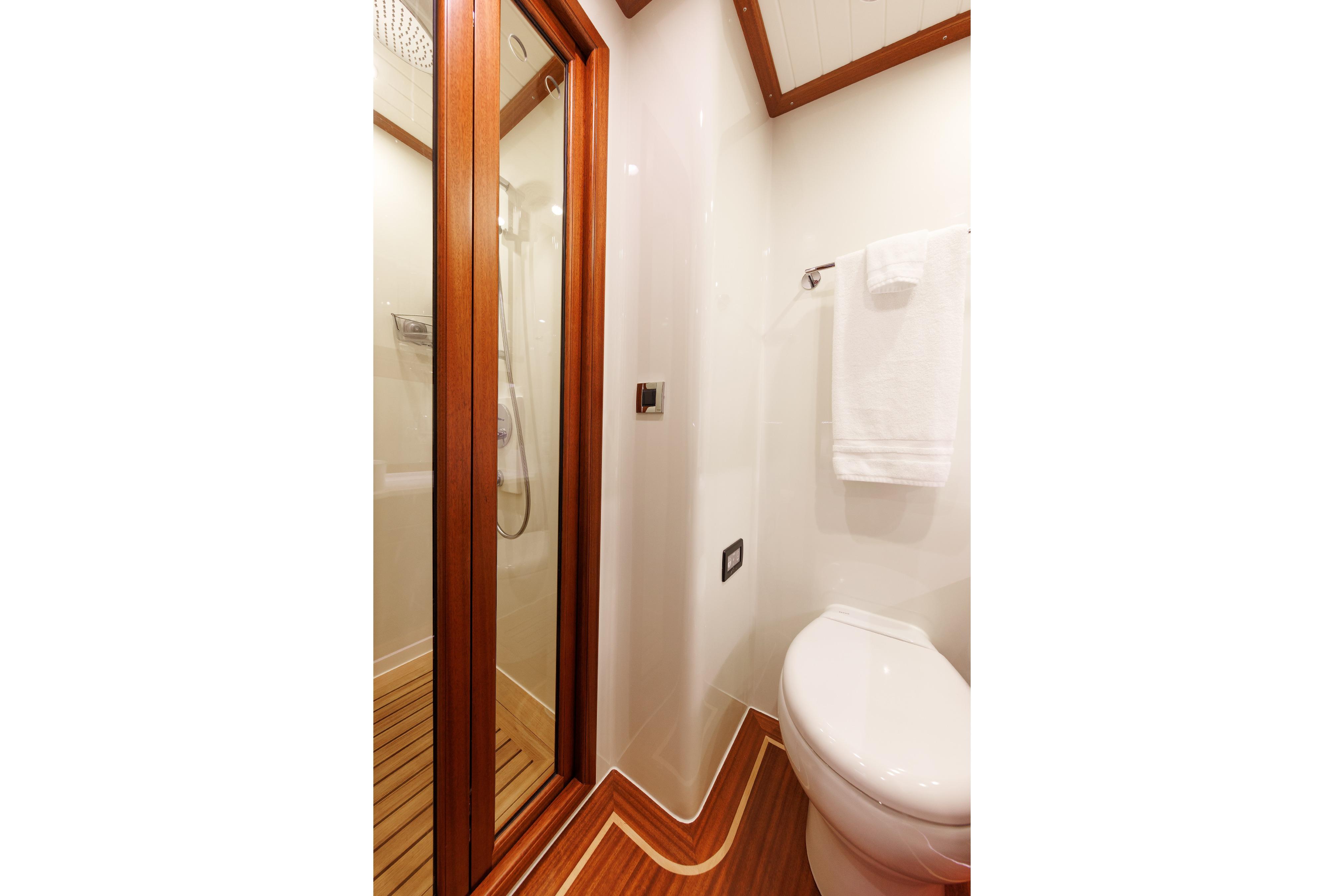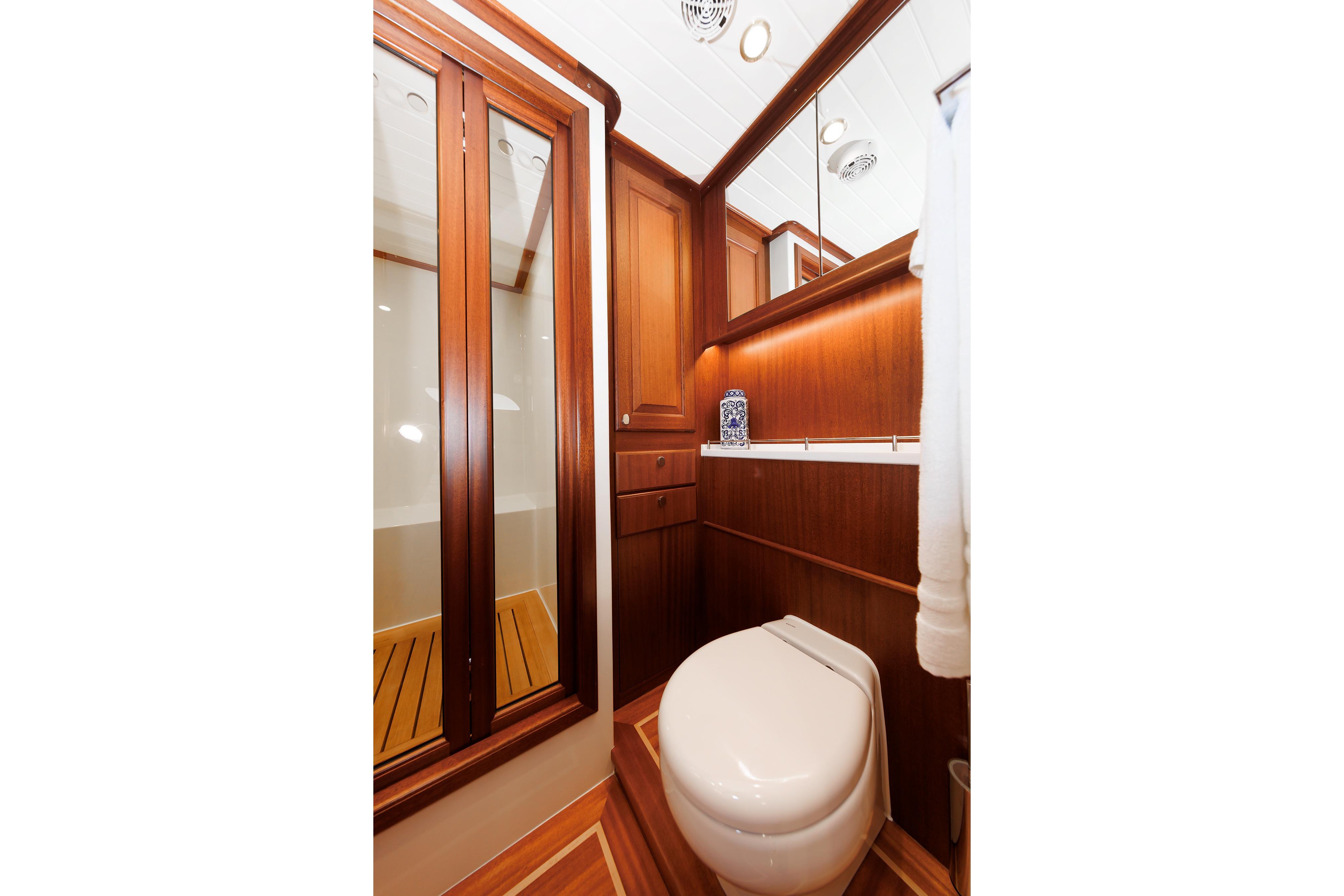 Guest cabin is aft and down a few steps. Outfitted with both a double berth and a single pullman, this cabin makes is perfect for captain and crew as well as children or adult guest. A private head with separate stall shower makes this space complete.