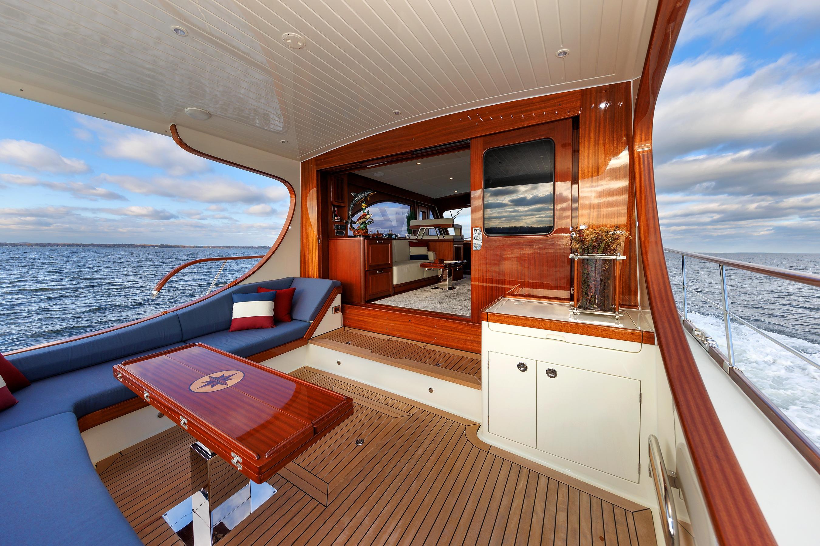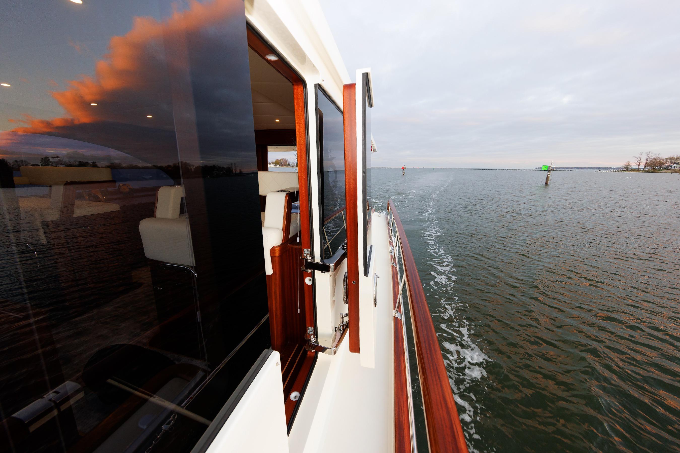 Triple mahogany and glass doors slide to starboard opening up the cockpit to the salon and galley giving twice the entertaining space by being able to utilize the open design between the cockpit and salon