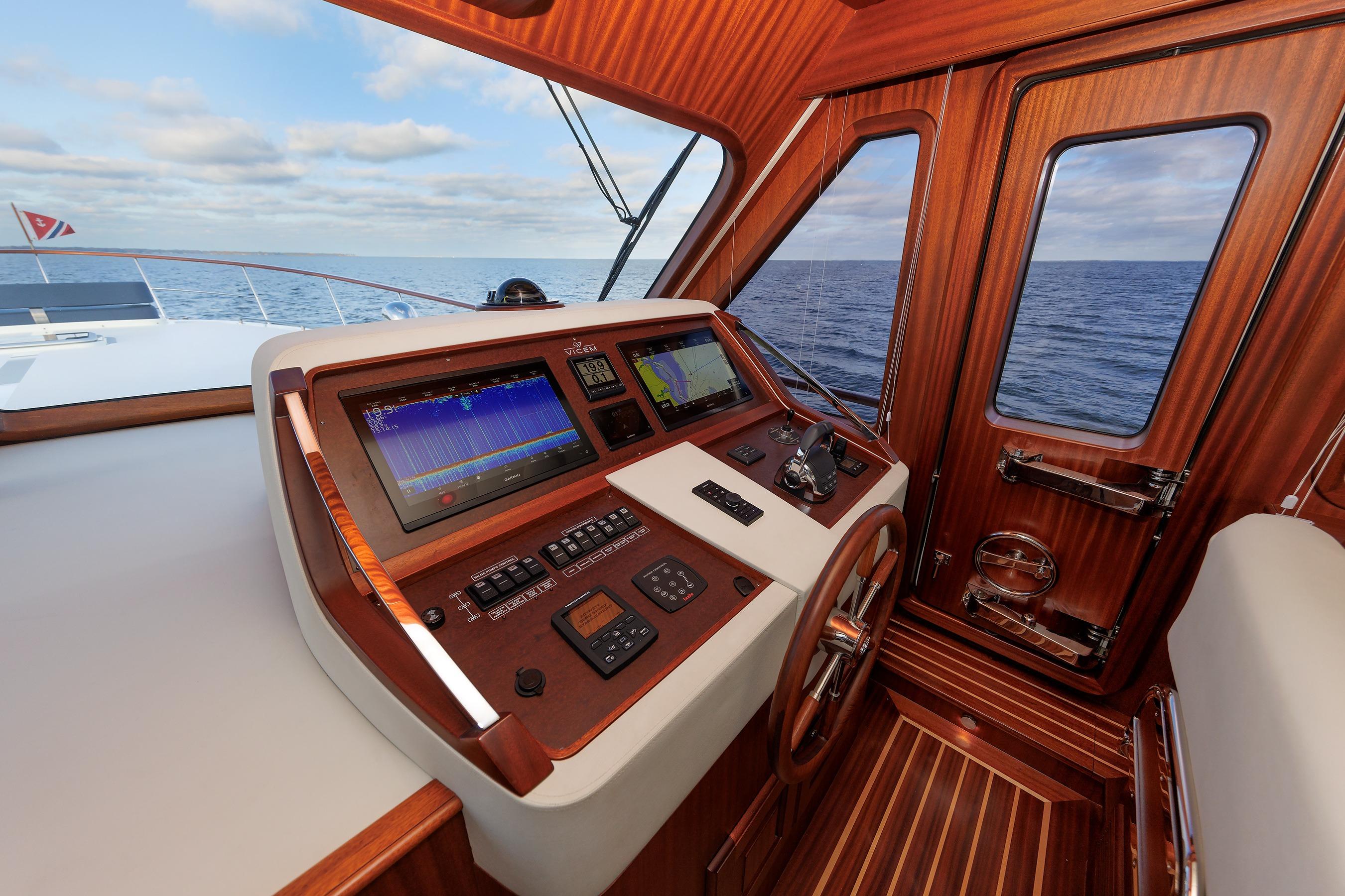 Starboard side is the in line galley, with mahogany covers for the countertop, sink and double electric cooktop with pop-up extractor vent. A second refrigerator freezer drawer set, stainless steel Bosch convection microwave oven and a dishwasher round out the galley appliances. Forward of the galley, starboard side, is the double helm seat with ice-maker beneath. Opposite is the matching navigators seat outfitted with a wine cooler. Docking is easy with the port and starboard doors giving easy access to the side decks. The captain will appreciate the modern helm and 360 degree view.