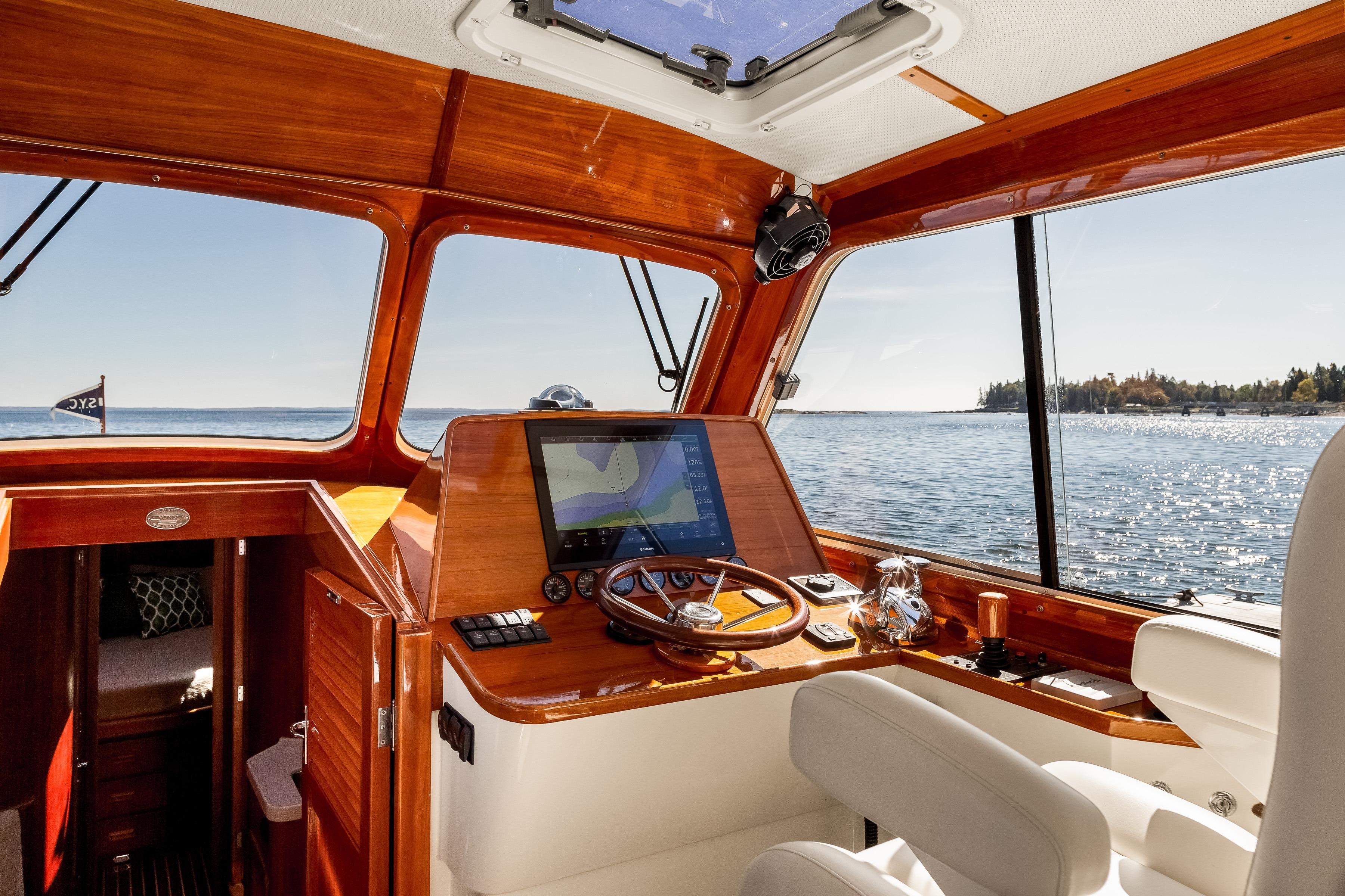 Patented Hinckley JetStick® Gen3 control system integrates forward, aft, and sideways motion of the boat along with steering and the 10" electric bow thruster.