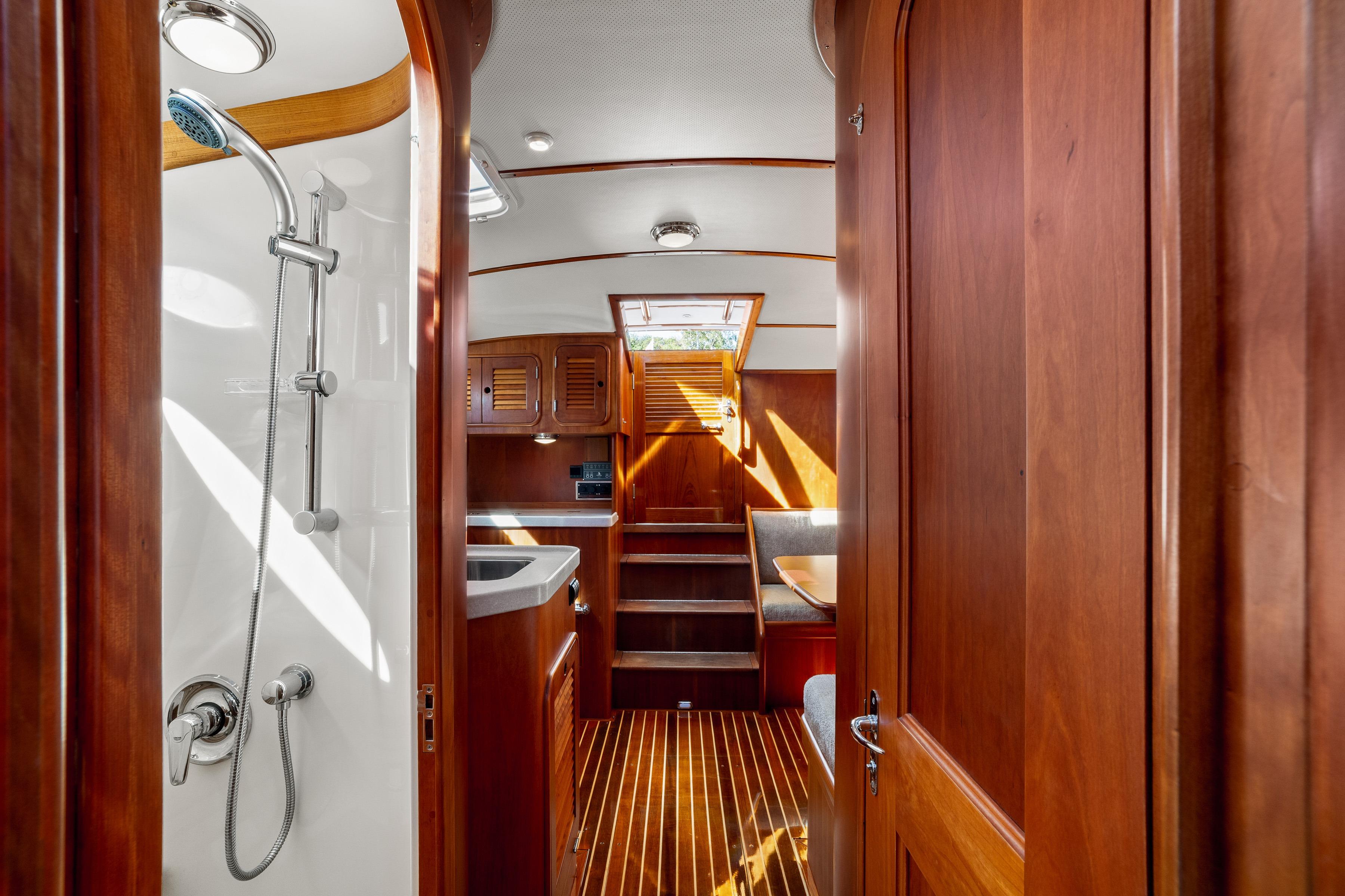 - Hanging lockers port and starboard have louvered doors and cedar lining and dome lights.
