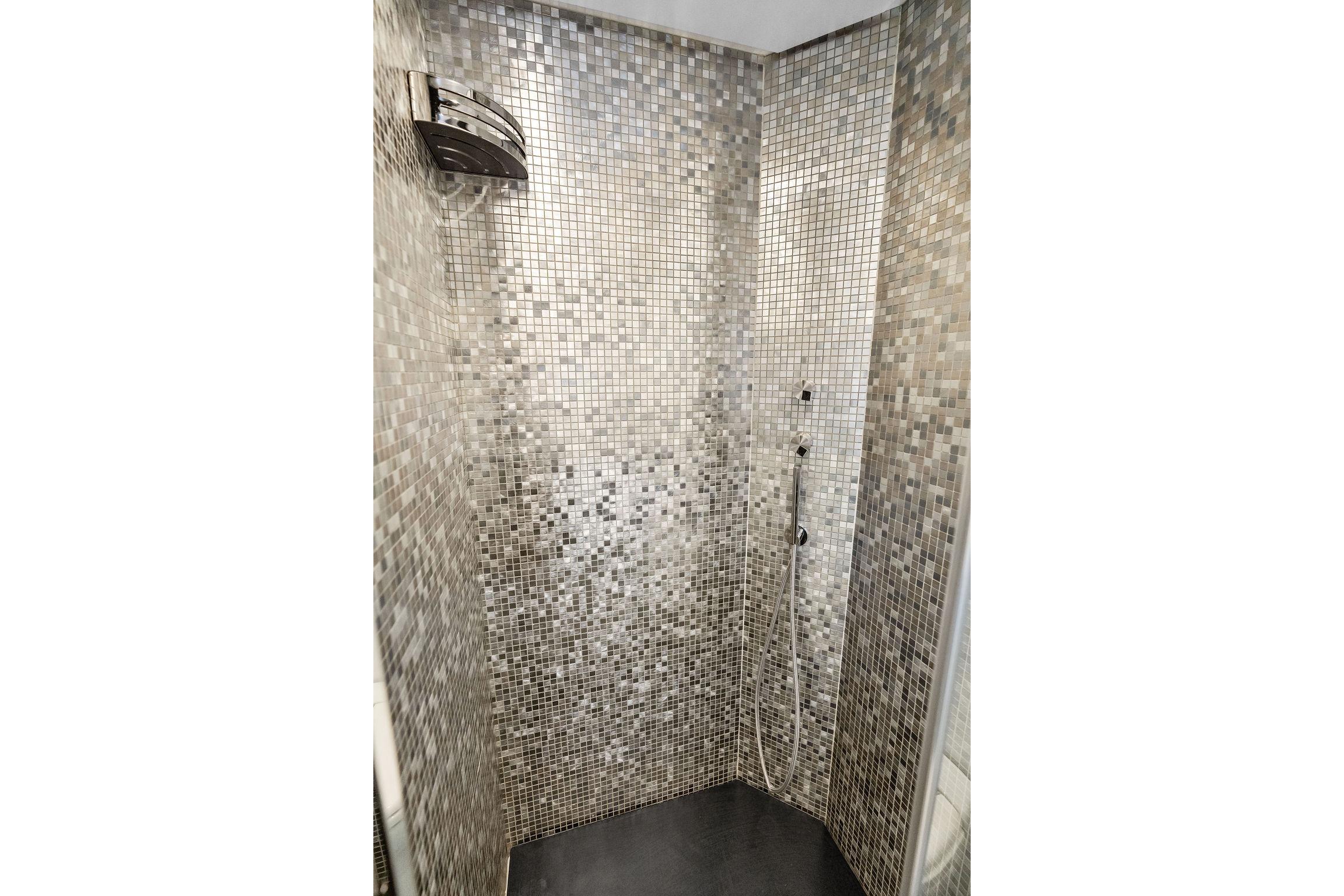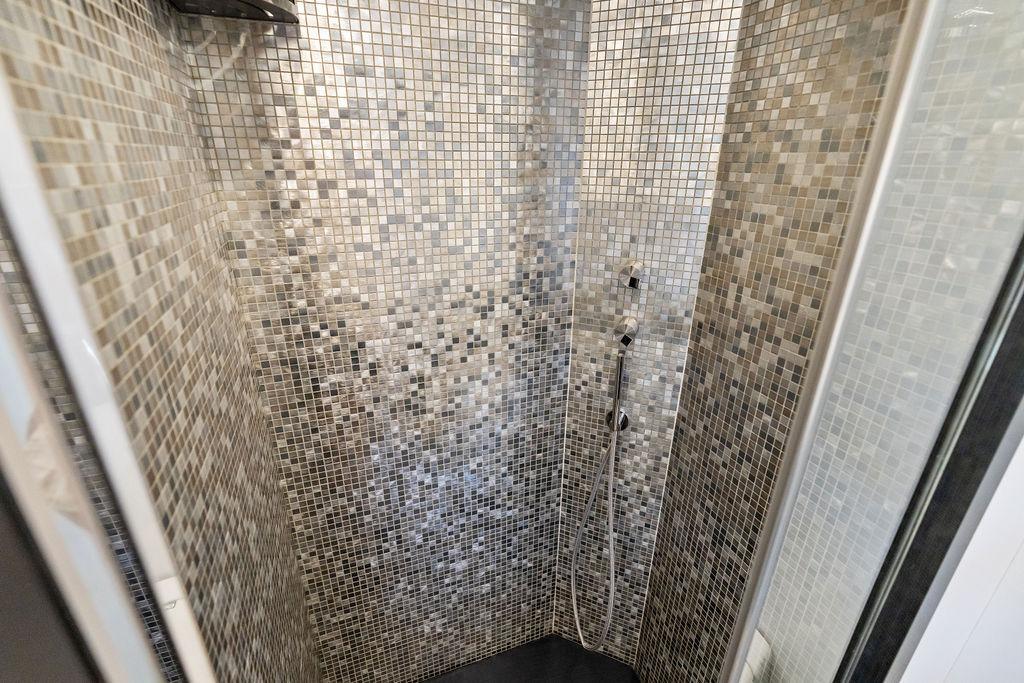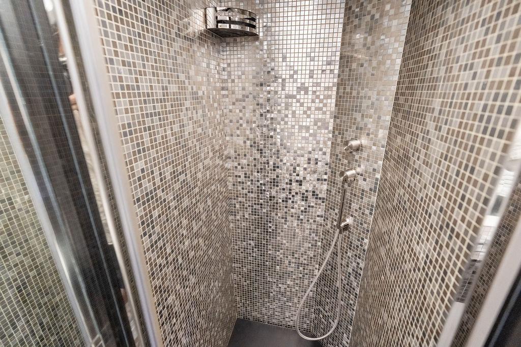 - Walk-in Shower with tempered glass door and beautiful Mosiac floors and walls