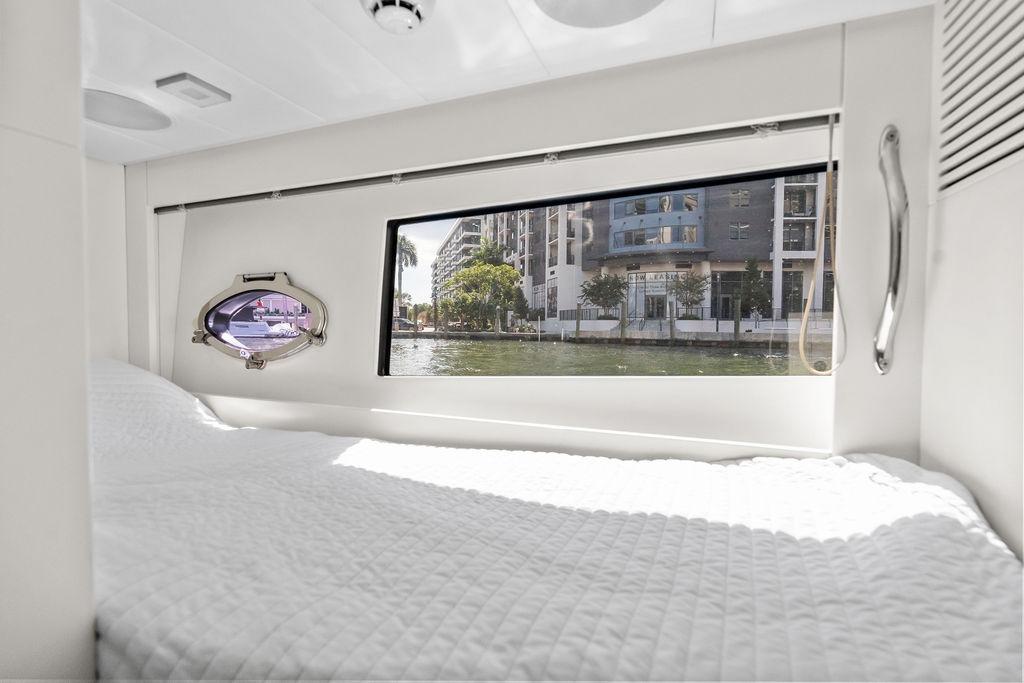 The interior of the 9X is sophisticated and inviting, featuring large windows that flood the salon with natural light, enhancing the sleek interiors finished in leather, carbon fiber, and polished metals. The full-beam master suite and three beautifully appointed guest cabins offer unparalleled comfort, while the cutting-edge helm station ensures that total control is always at your fingertips.
