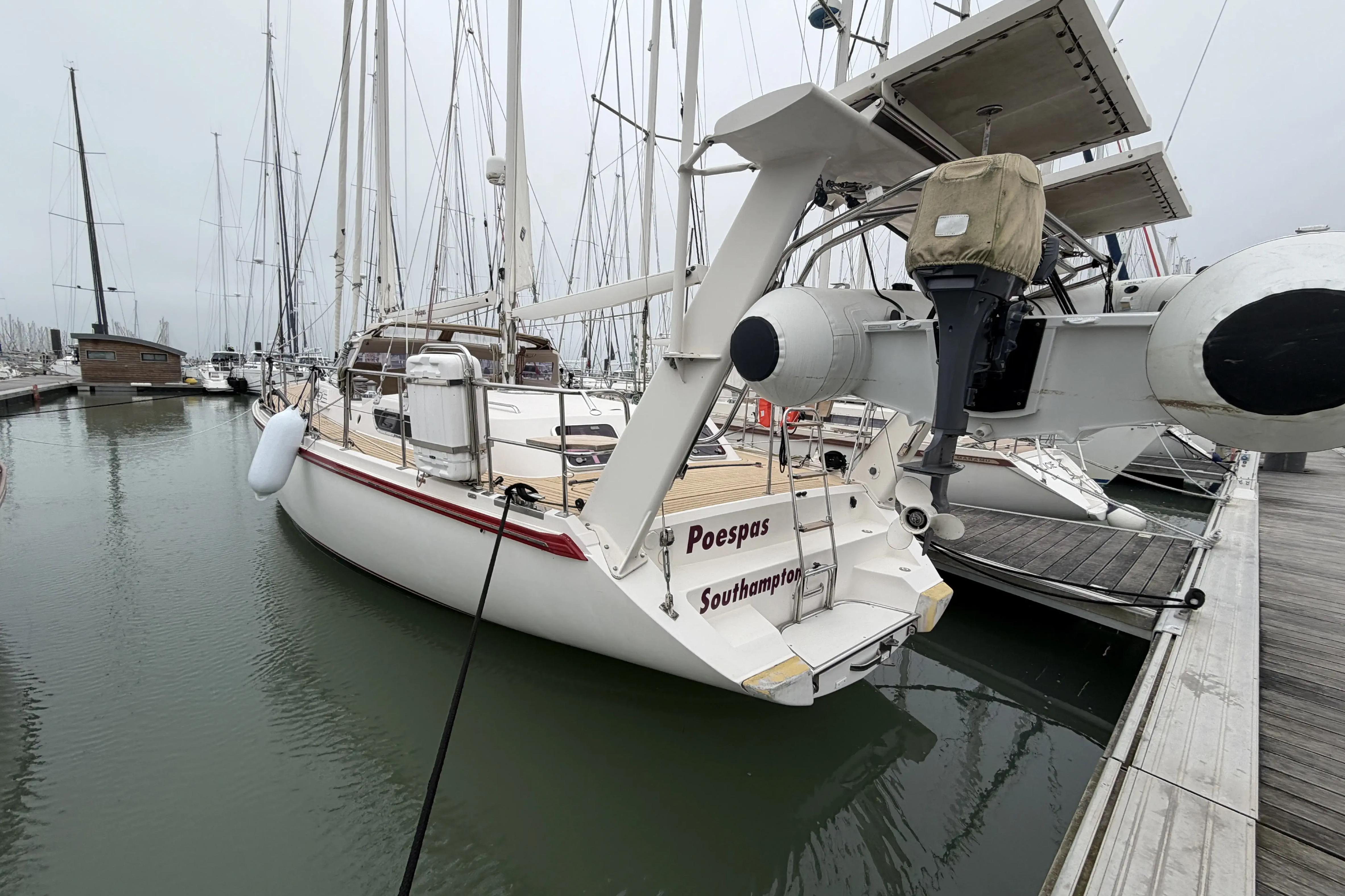 - Divers : Douche de pont, passerelle manuel laqué blanc, housses pour les défenses, taud vertical de 2008, taud de soleil neuf, taud capote de roof, échelle de bain inox, chaise du moteur HB, table de cockpit,