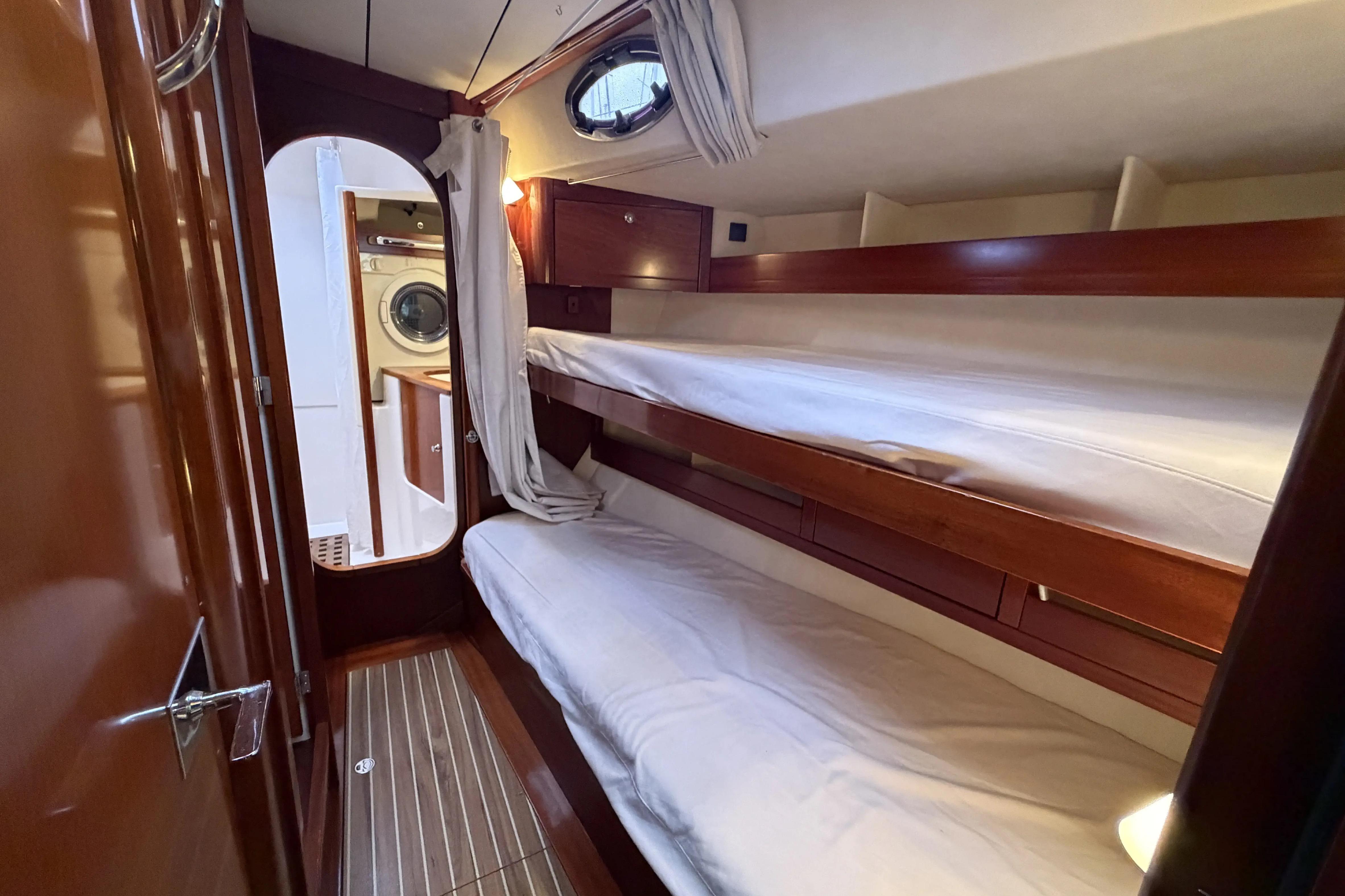 - Cabine arrière : Cabine propriétaire avec couchette double en ilot (2mx1.60m), coffre-fort, bureau/coiffeuse, penderie