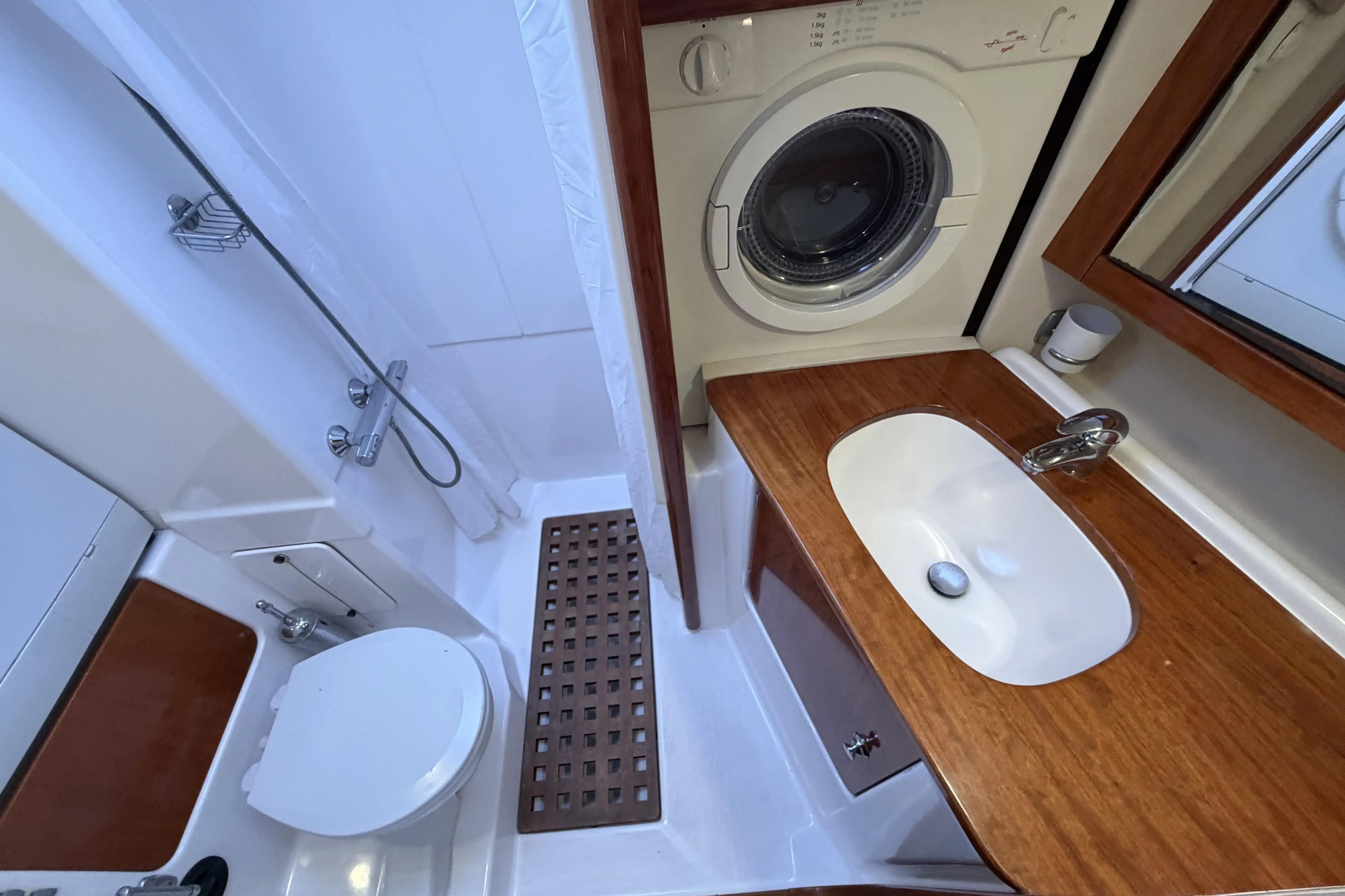 - Salle d’eau avant : Machine à laver Bosch et machine à sécher le linge Minea, WC électrique, douche, lavabo et réservoir à eaux noires