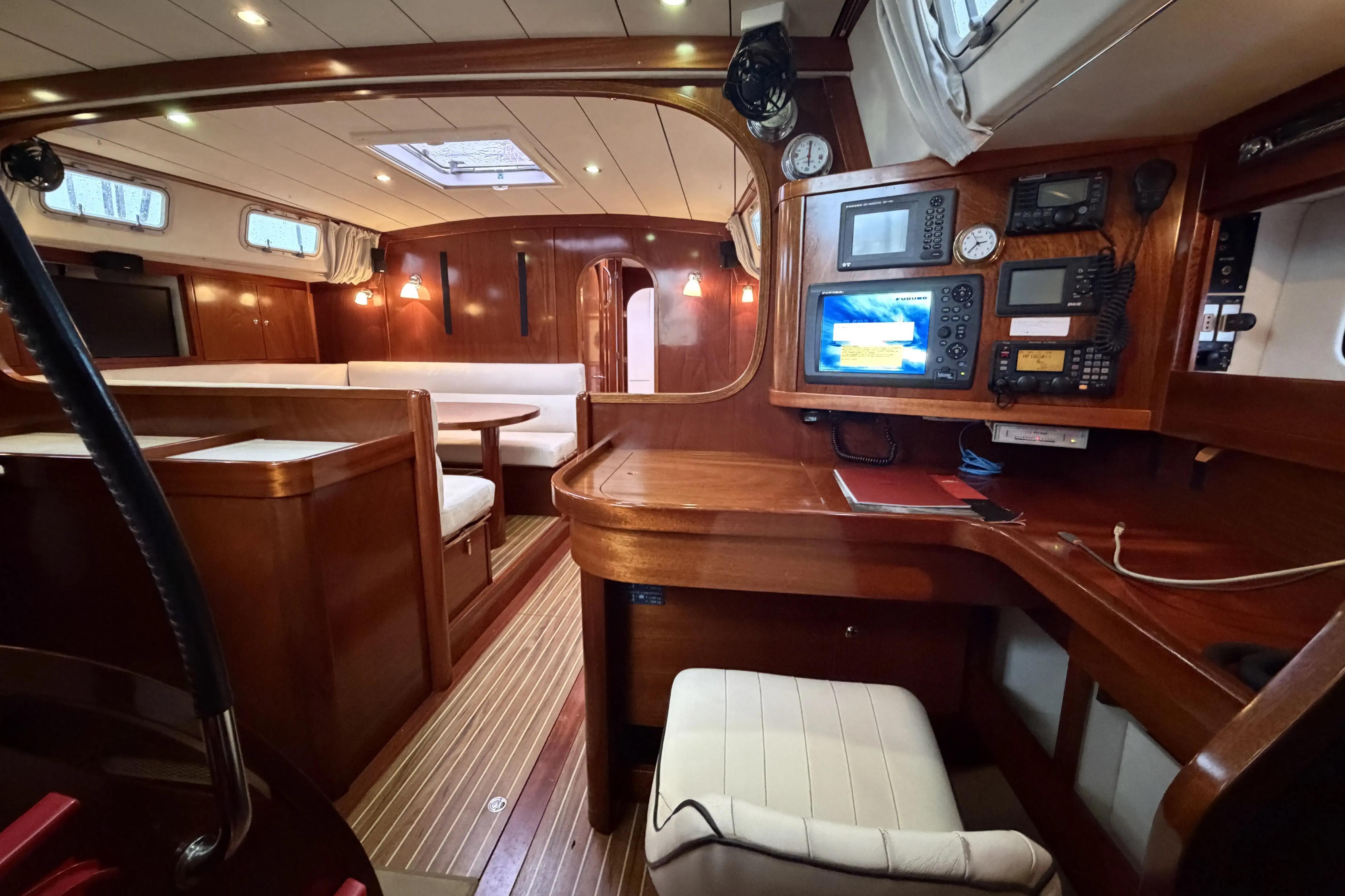 - Table à cartes : écran Furuno Navnet3D MDF12, Furuno Transpondeur Navnet FA50, Furuno GPS Navigator GP 150, HYDRA 3000 B&G Multi display, Radio/CD JVC, VHF icom, radio BLU SSB Icom IC-M801E avec accordeur d’antenne automatique, modem Pactor, Sailor Fleet Broadband 150 téléphone et terminal d'accès internet at haut débit de 2013
