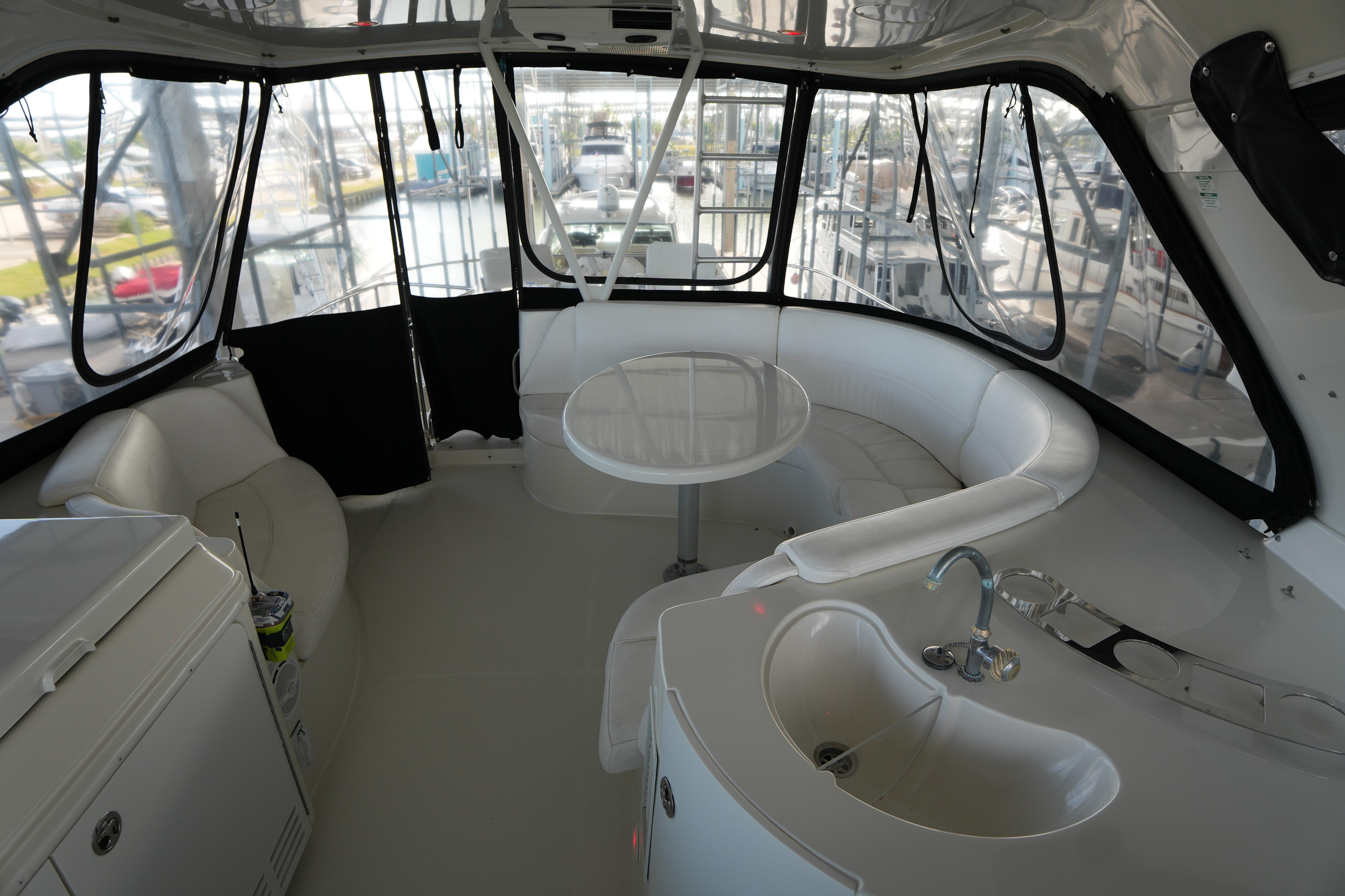 Enclosed air conditioned flybridge with summer kitchen, ice maker, and lounge seating