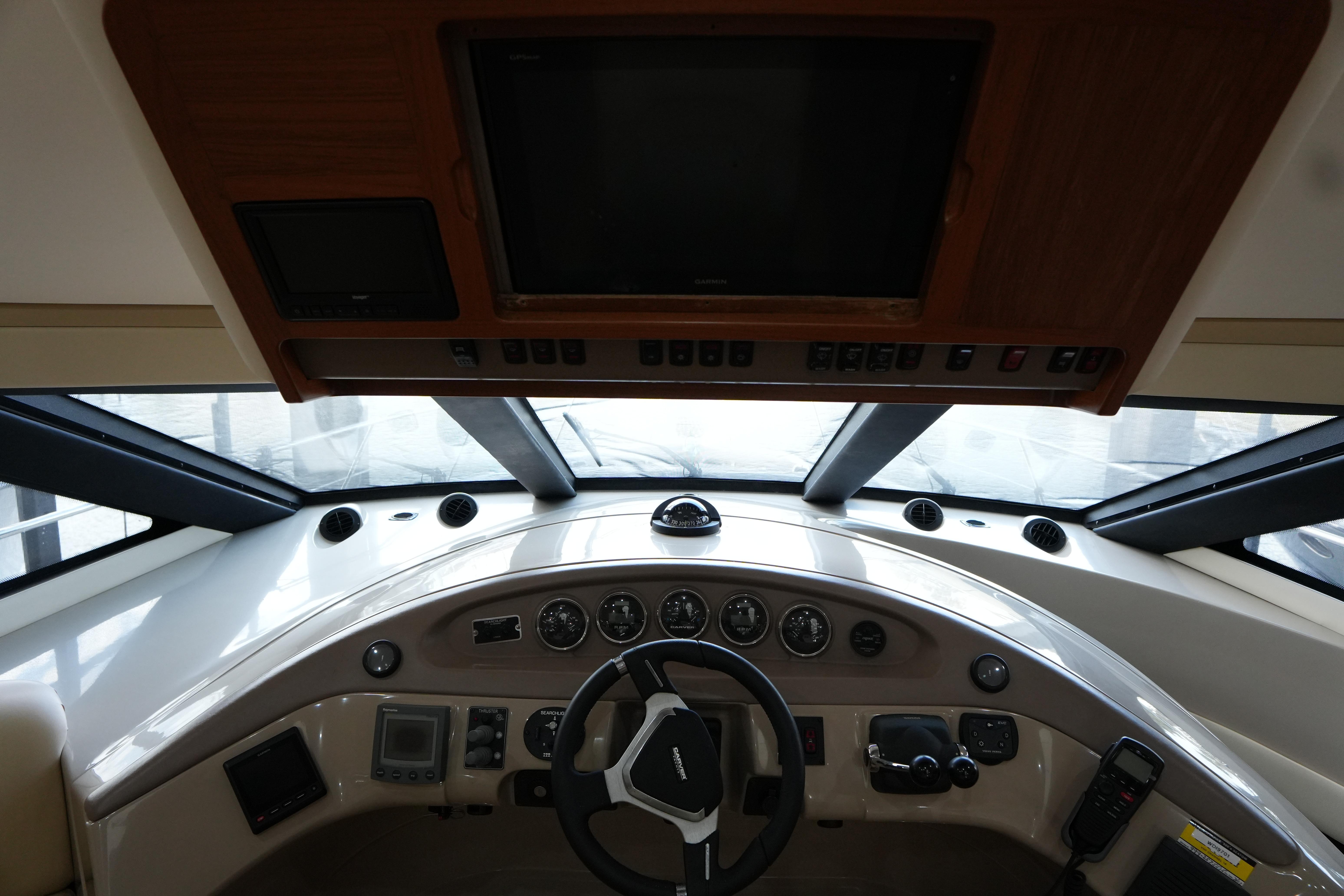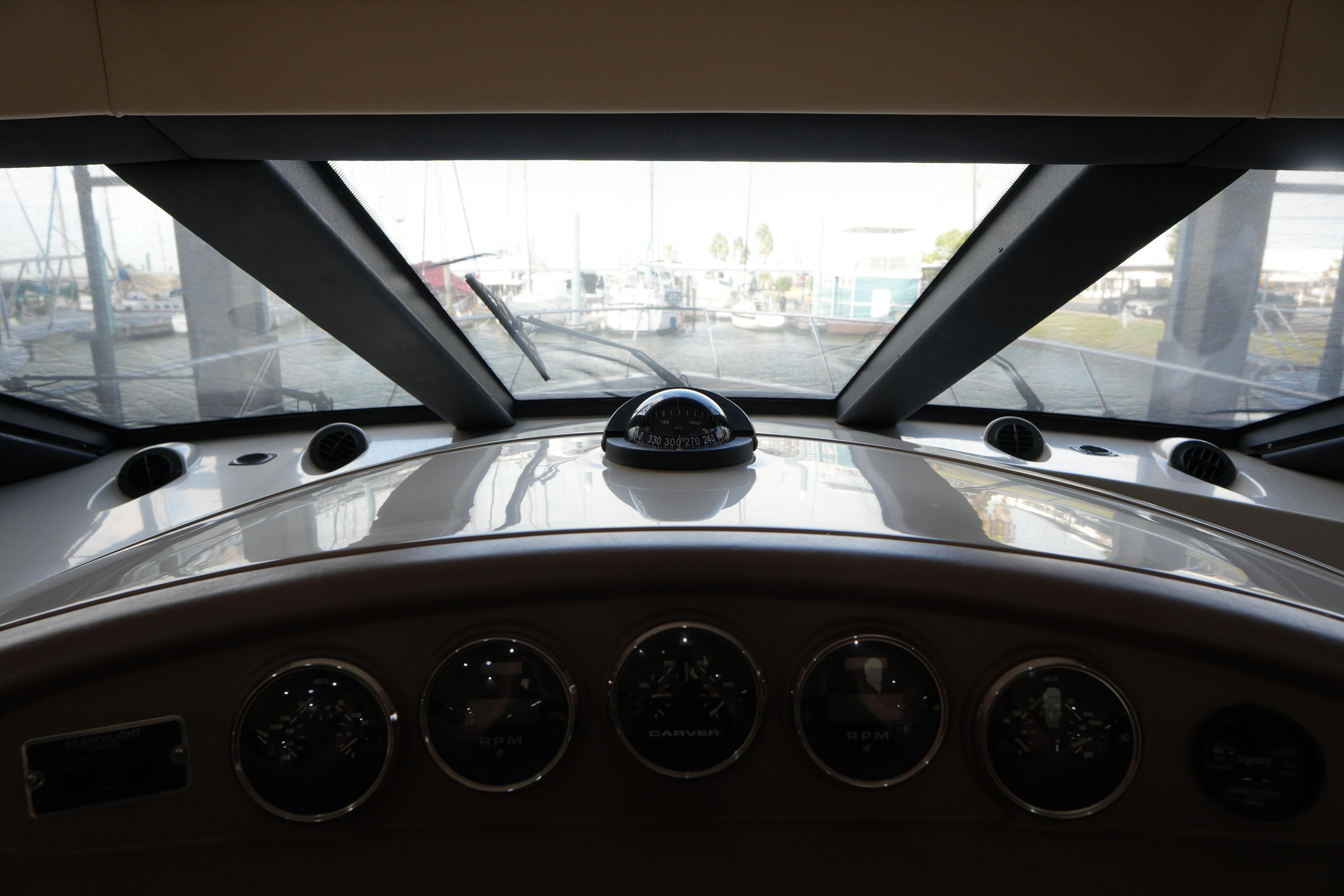 - Helm station with large seat, Carver Yachts wheel, throttle, and Ritchie compass