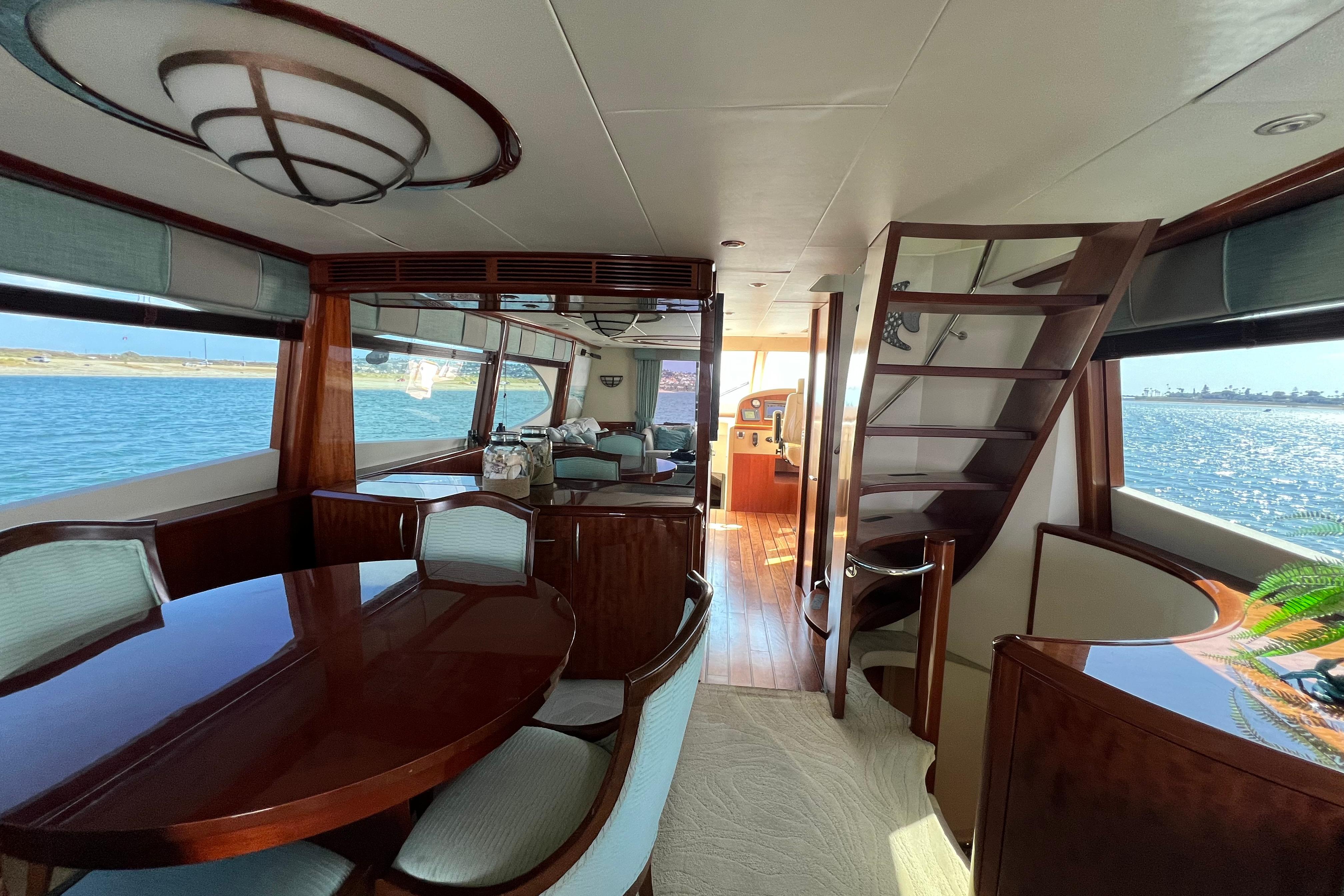 The country kitchen is well lit with an abundance of windows. Located forward on the main deck, this area offers a black granite topped island (with stainless sink, dishwasher, and storage) that is surrounded by full sized, upscale appliances and an abundance of cabinetry and a pantry. The adjacent dinette that is perfect for spontaneous family gatherings in the galley and a TV is strategically mounted so it is both visible from the dinette and galley. This area also contains a small lower helm next to the door leading to the side deck. This lower helm offers excellent visibility while not taking up much space in the country kitchen.