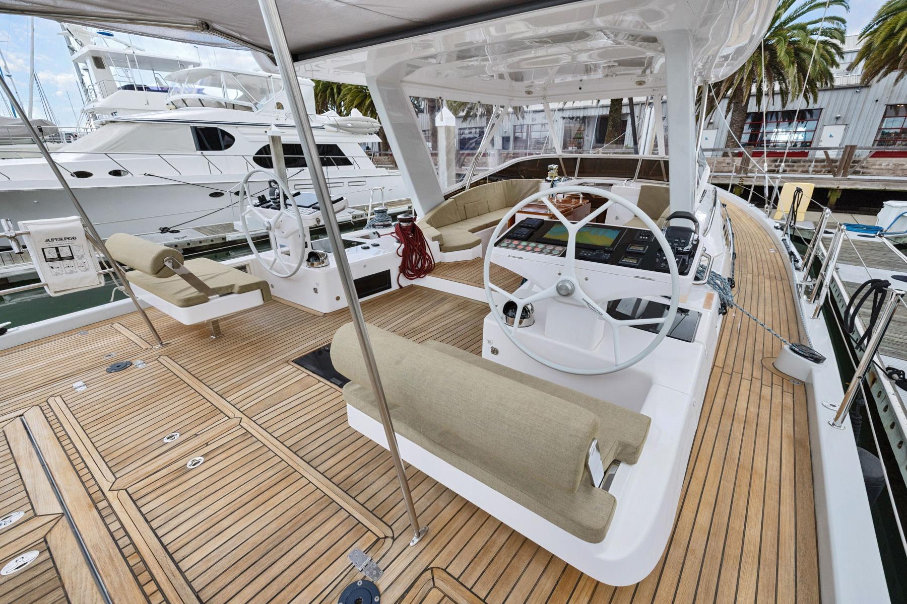 - Subwoofer and speakers in cockpit; cockpit and helm cushions; canvas covers for helms, wheels, winches, pushpit seats, and cockpit table