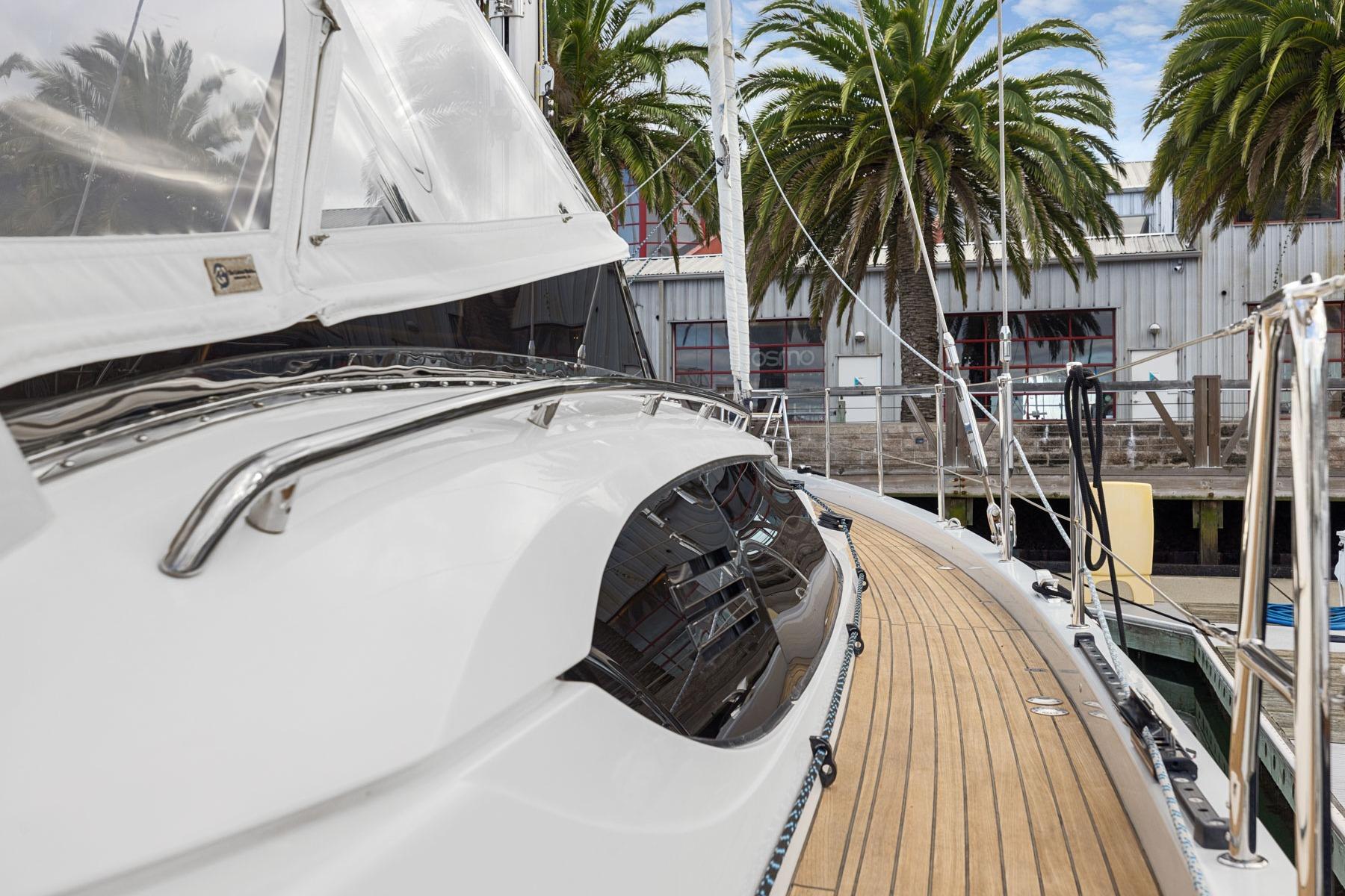 - Large fixed hull windows in salon and cabins, plus deck hatches with Oceanair shades/screens