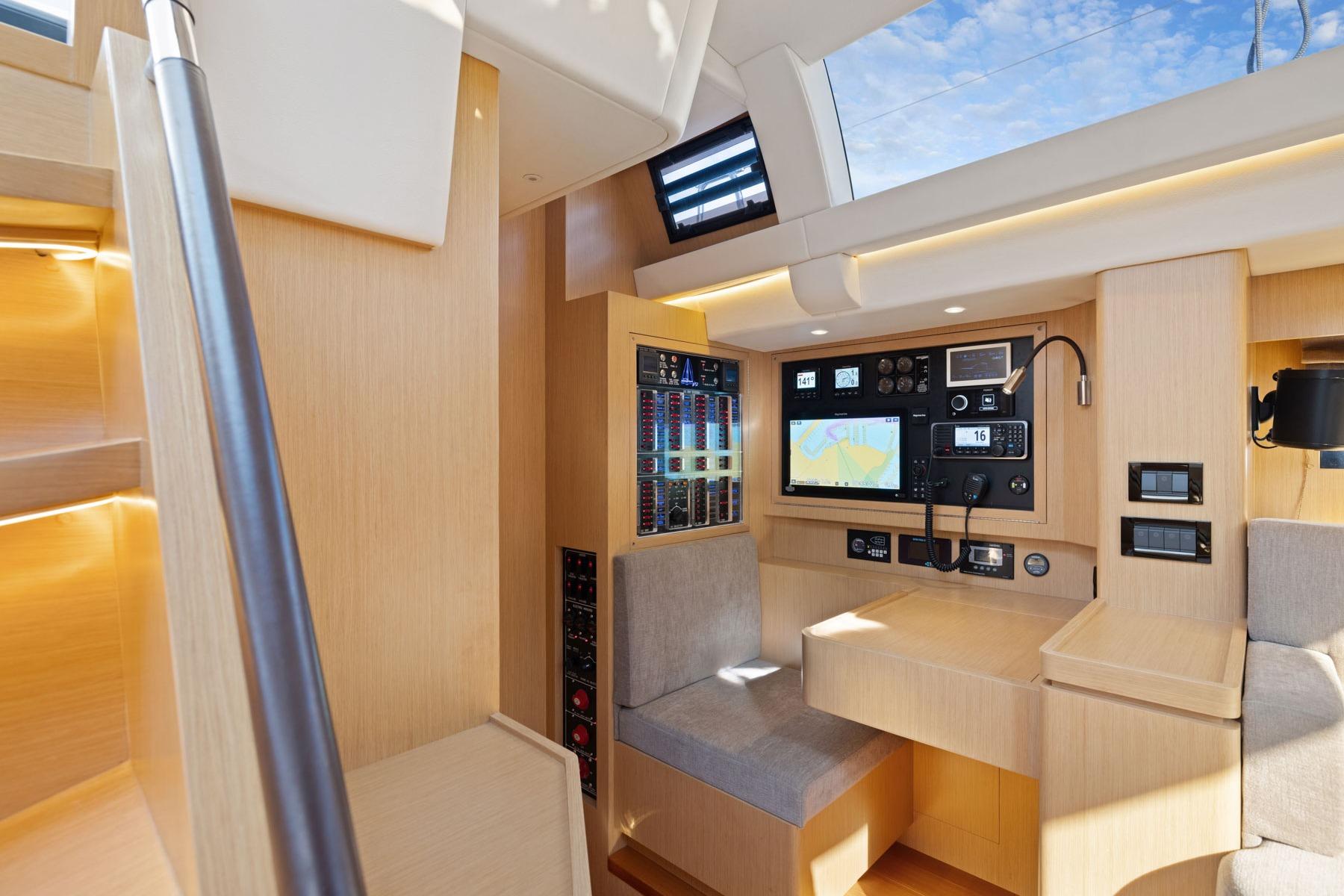 Her deck layout and systems are purpose-built for single-handed sailing – or even easier with an extra deckhand. All working sails are hydraulic furling, and Harken 60 Rewind electric primary winches handle the genoa, self-tacking jib, and mainsheet, allowing push-button sail trim from both the helm or at the winches. Engine and proportional bow/stern thruster controls are at both helms, alongside Raymarine MFDs, P70 autopilot controls, i70 instruments, Raymarine touchpad remotes, augmented-reality cameras, and an ACR spotlight. The capability for two autopilot drive units with a selector switch, with the watertight bulkheads, and a highly developed bilge system add true bluewater redundancy.