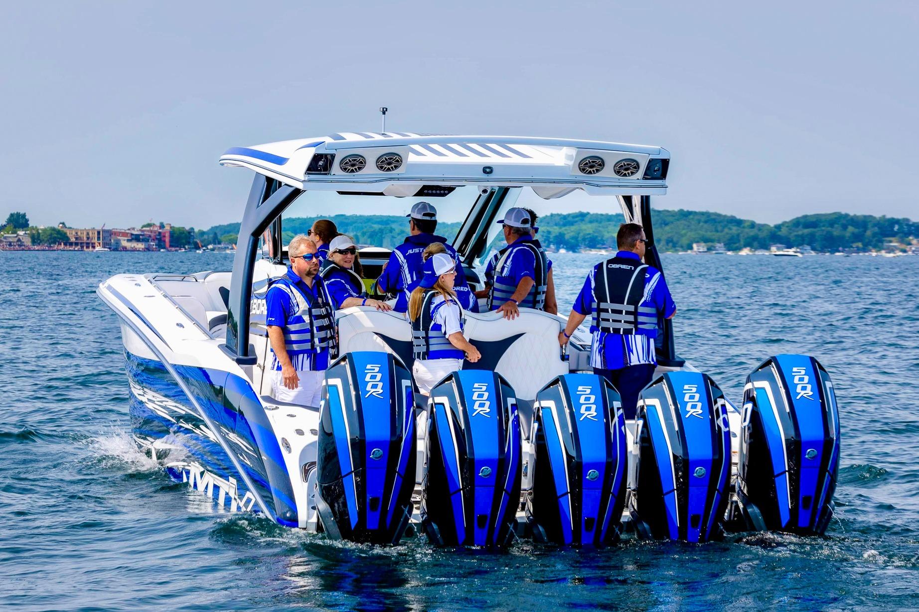 This MTI SV42 is powered by twin Mercury Racing 500Rs with warranty through 8/28/2026 and has approximately 200 hours. It is located in Boca Raton, FL, and viewings are available by appointment.