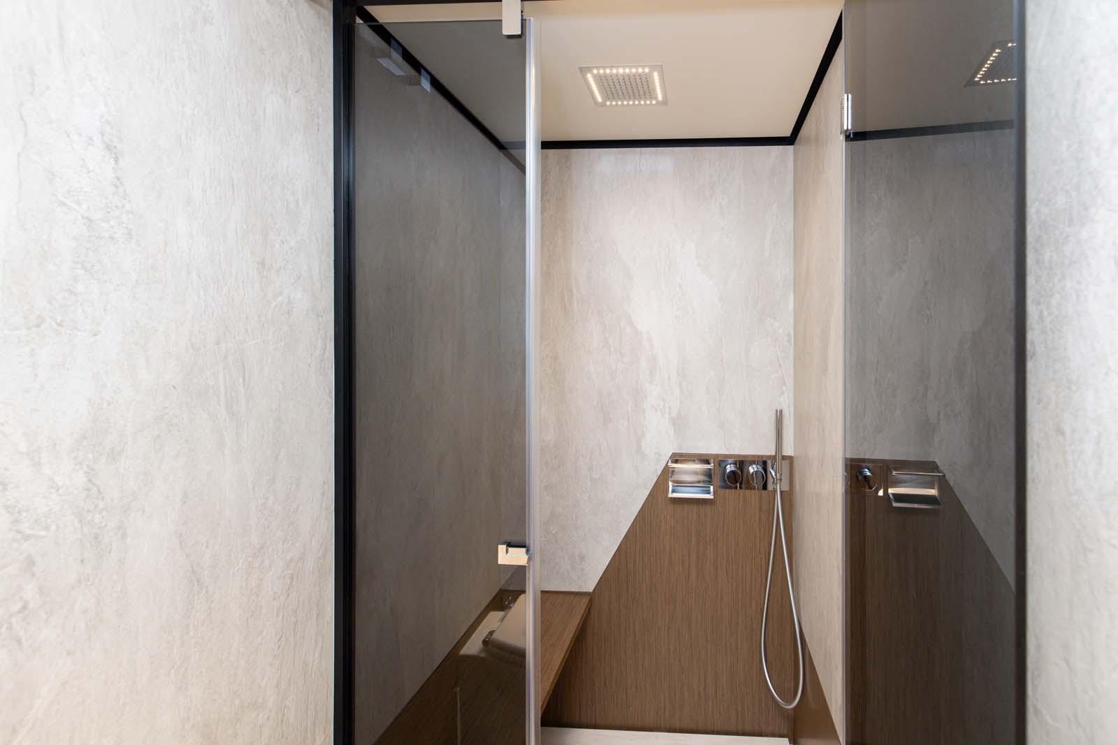 Exterior: The flybridge, equipped with a fixed glass roof, adds a modern and open touch and provides an ideal lounge area for relaxation. The submersible aft platform facilitates access to the sea.