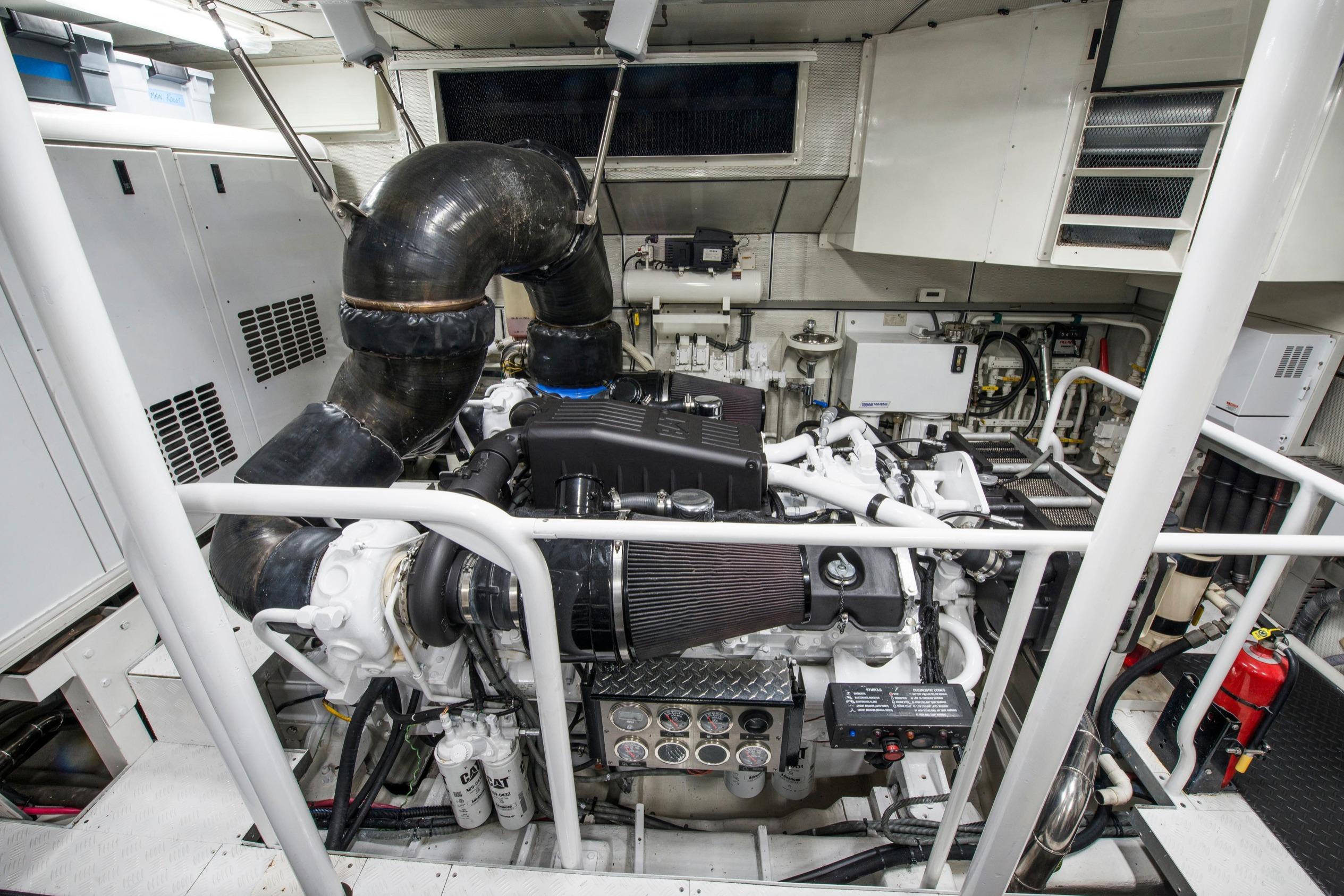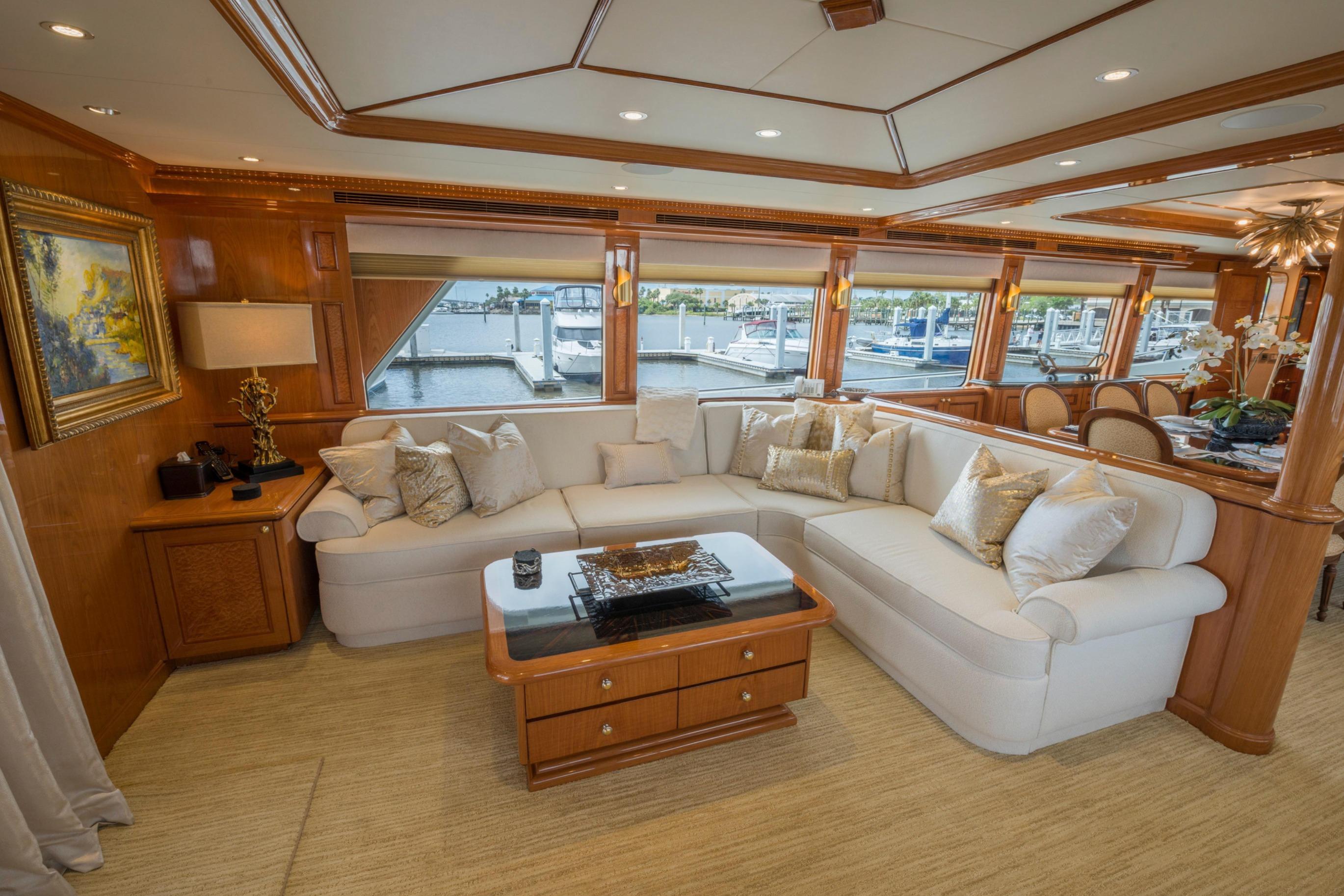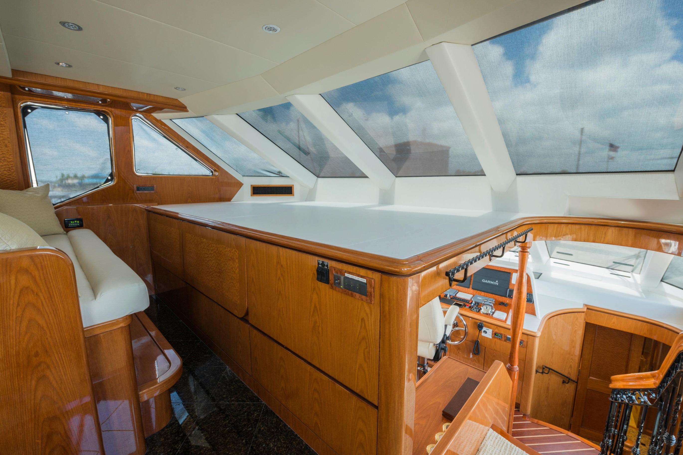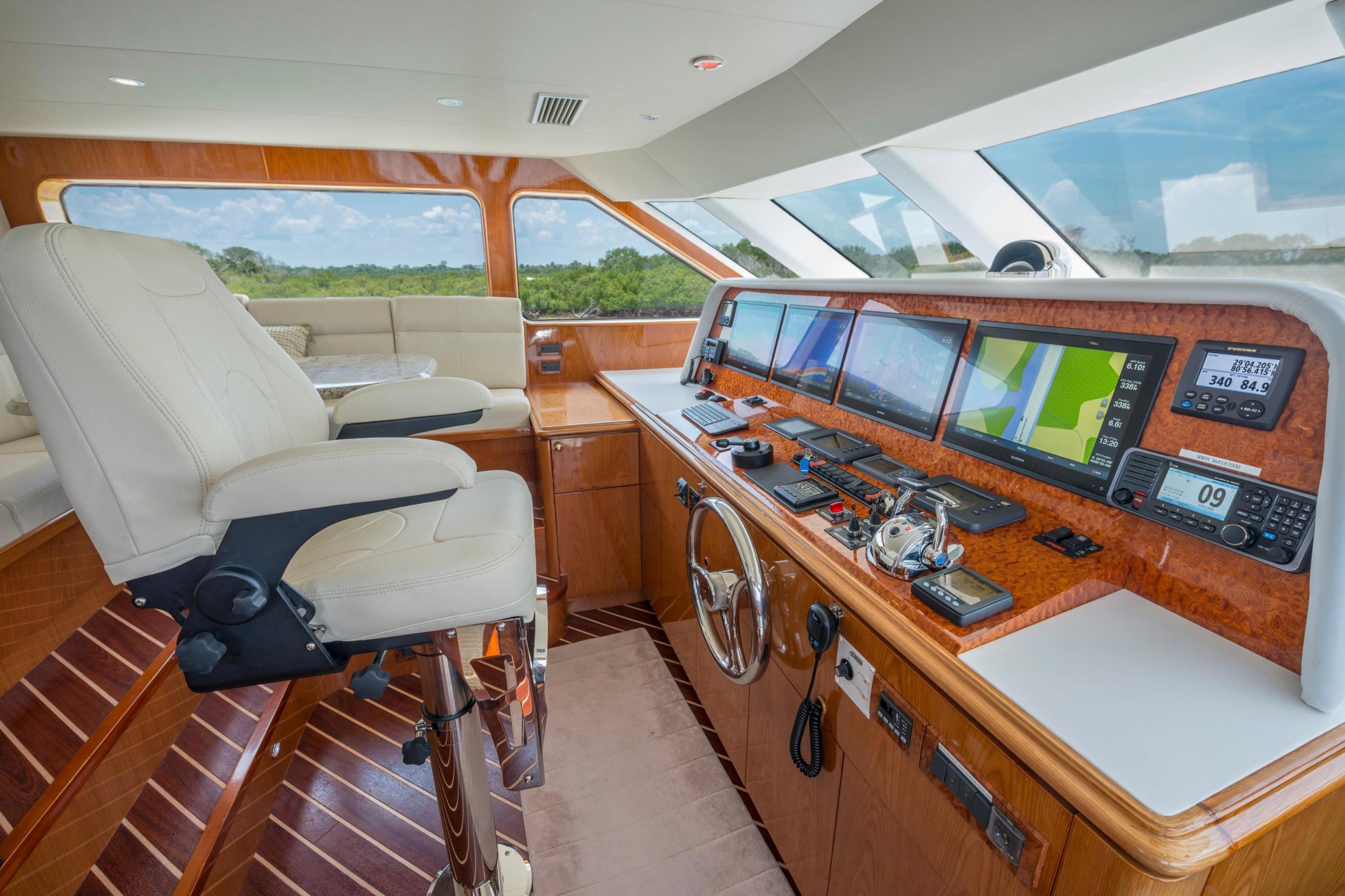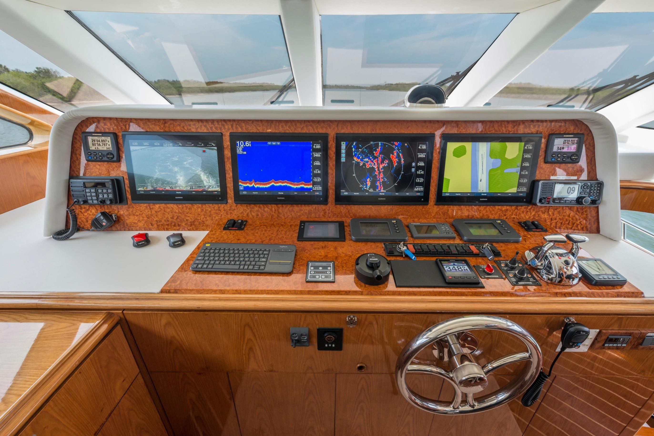 Twin Caterpillar C32 diesels (1,652 HP each, total 3,304 HP) power FOOTLOOSE to a thrilling 26-knot top speed and efficient 18-knot cruise. Her 5,300-gallon fuel tanks yield a 1,267-nm range, ideal for transoceanic runs or island-hopping. Quantum zero-speed stabilizers ensure silky rides and reliability. Upgraded Garmin electronics suite includes Four Garmin 8617's, radar, autopilot, and AIS for effortless command from the raised pilothouse or flybridge helm.