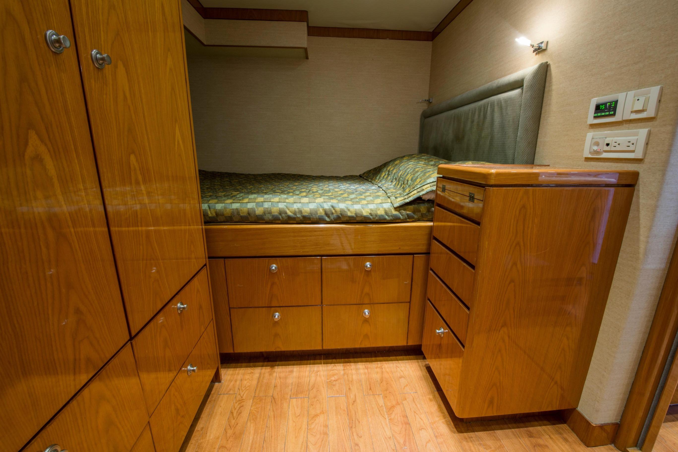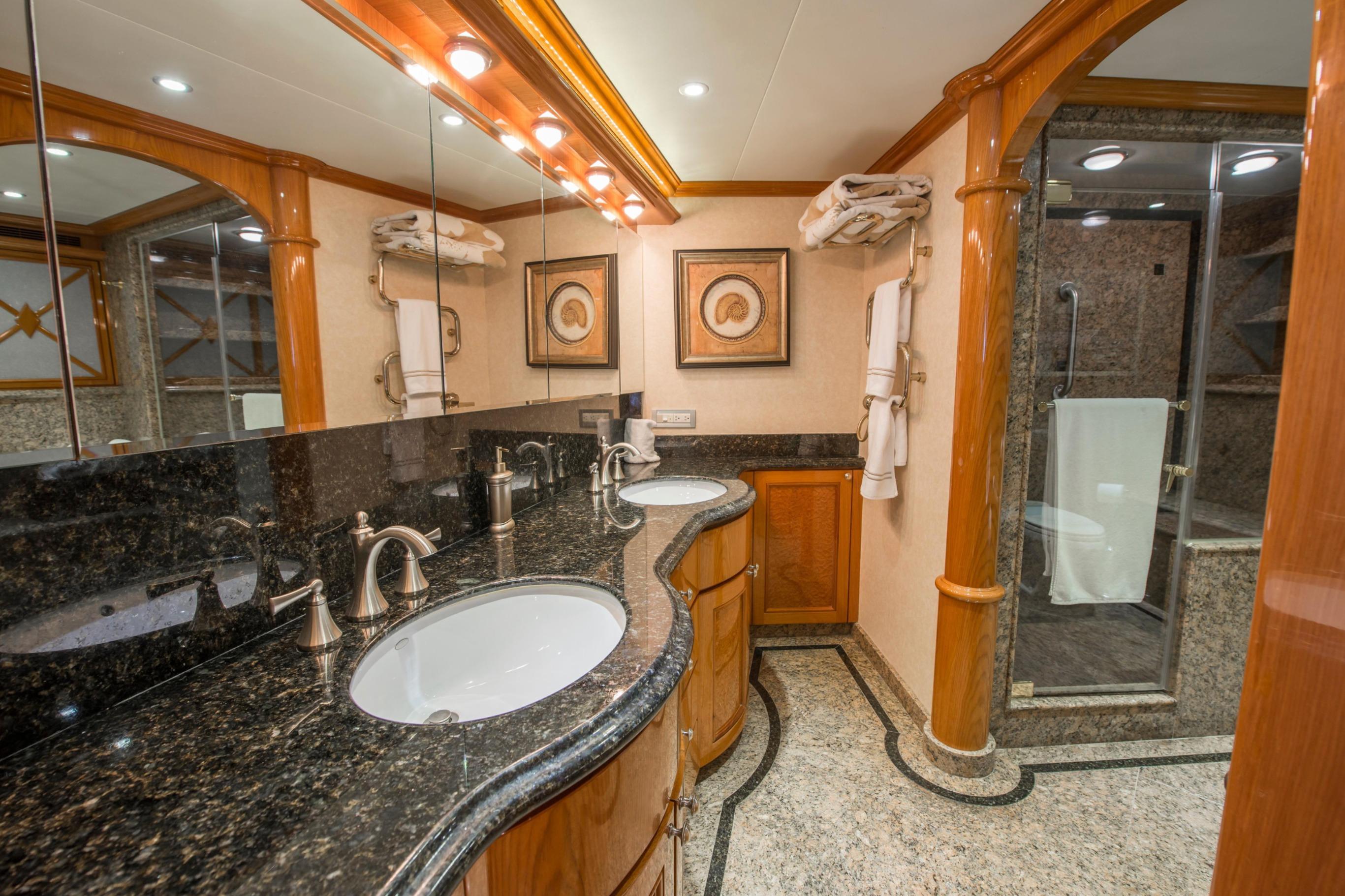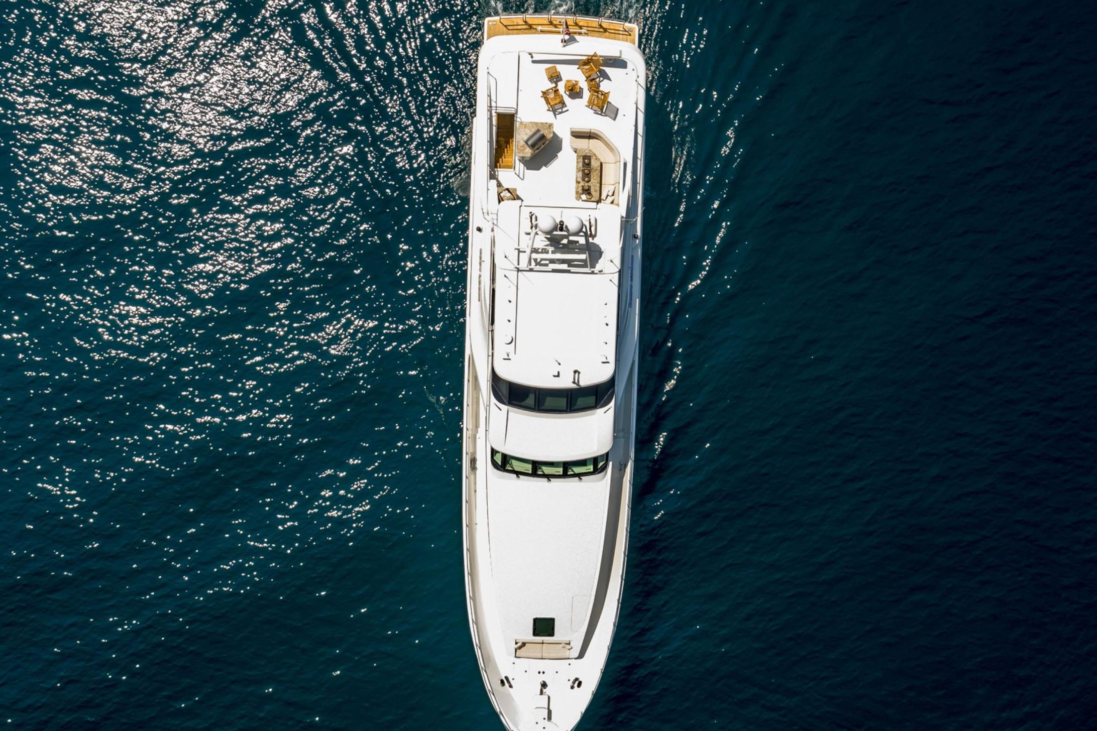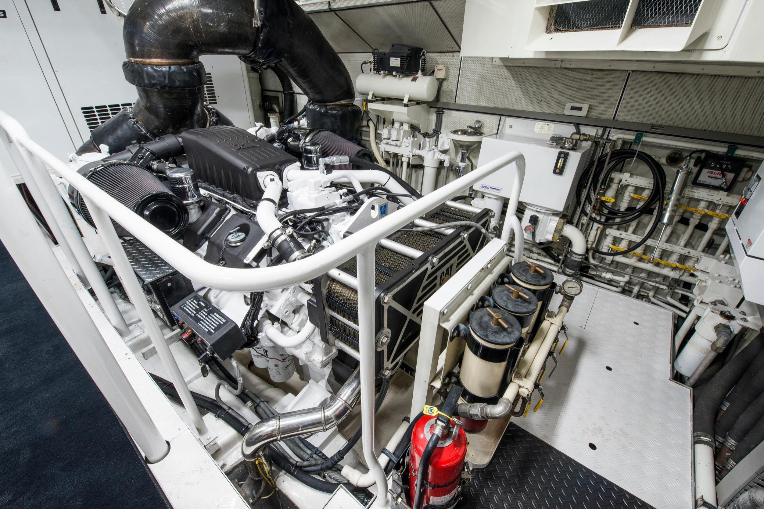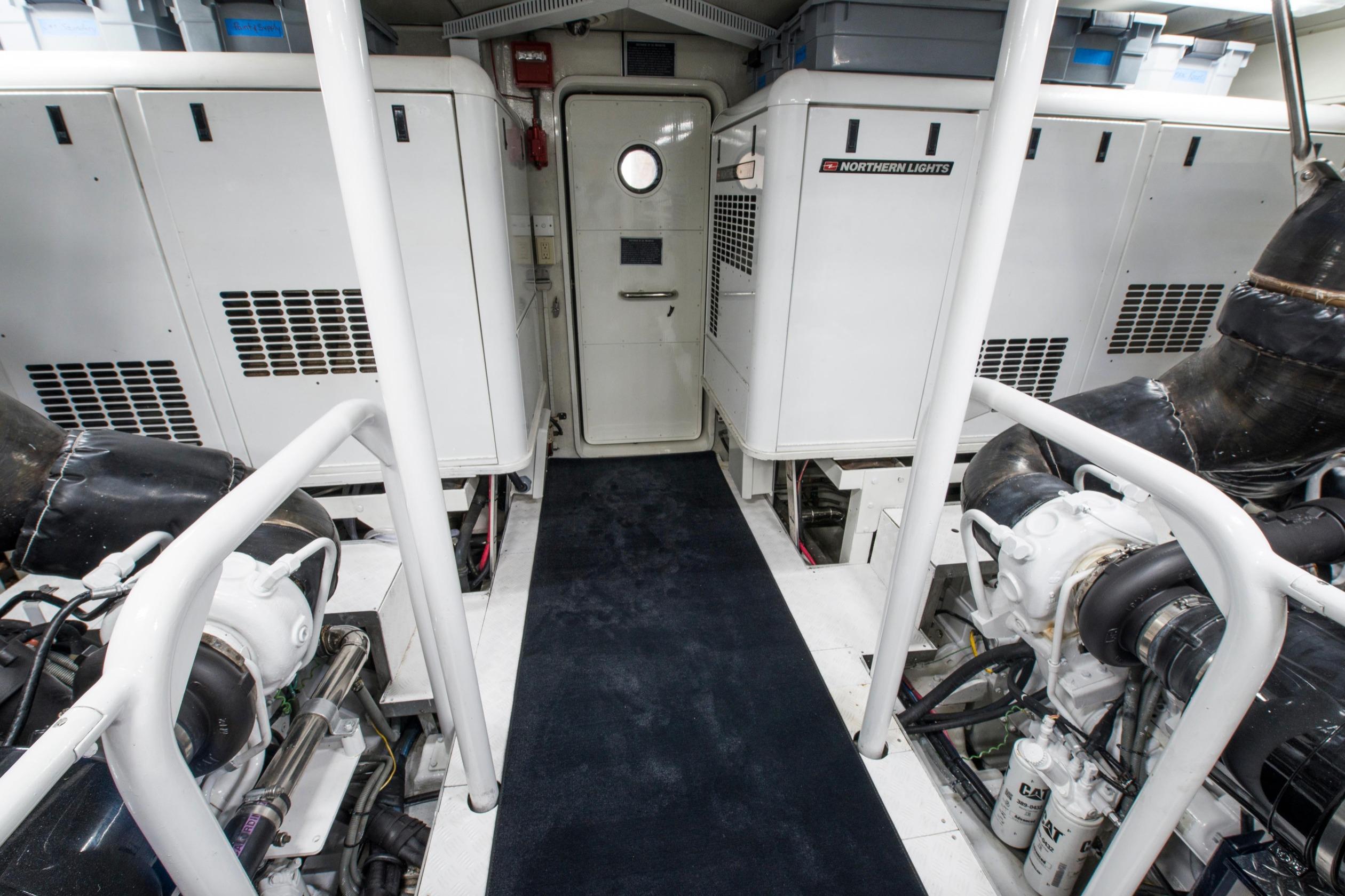 Twin Caterpillar C32 diesels (1,652 HP each, total 3,304 HP) power FOOTLOOSE to a thrilling 26-knot top speed and efficient 18-knot cruise. Her 5,300-gallon fuel tanks yield a 1,267-nm range, ideal for transoceanic runs or island-hopping. Quantum zero-speed stabilizers ensure silky rides and reliability. Upgraded Garmin electronics suite includes Four Garmin 8617's, radar, autopilot, and AIS for effortless command from the raised pilothouse or flybridge helm.