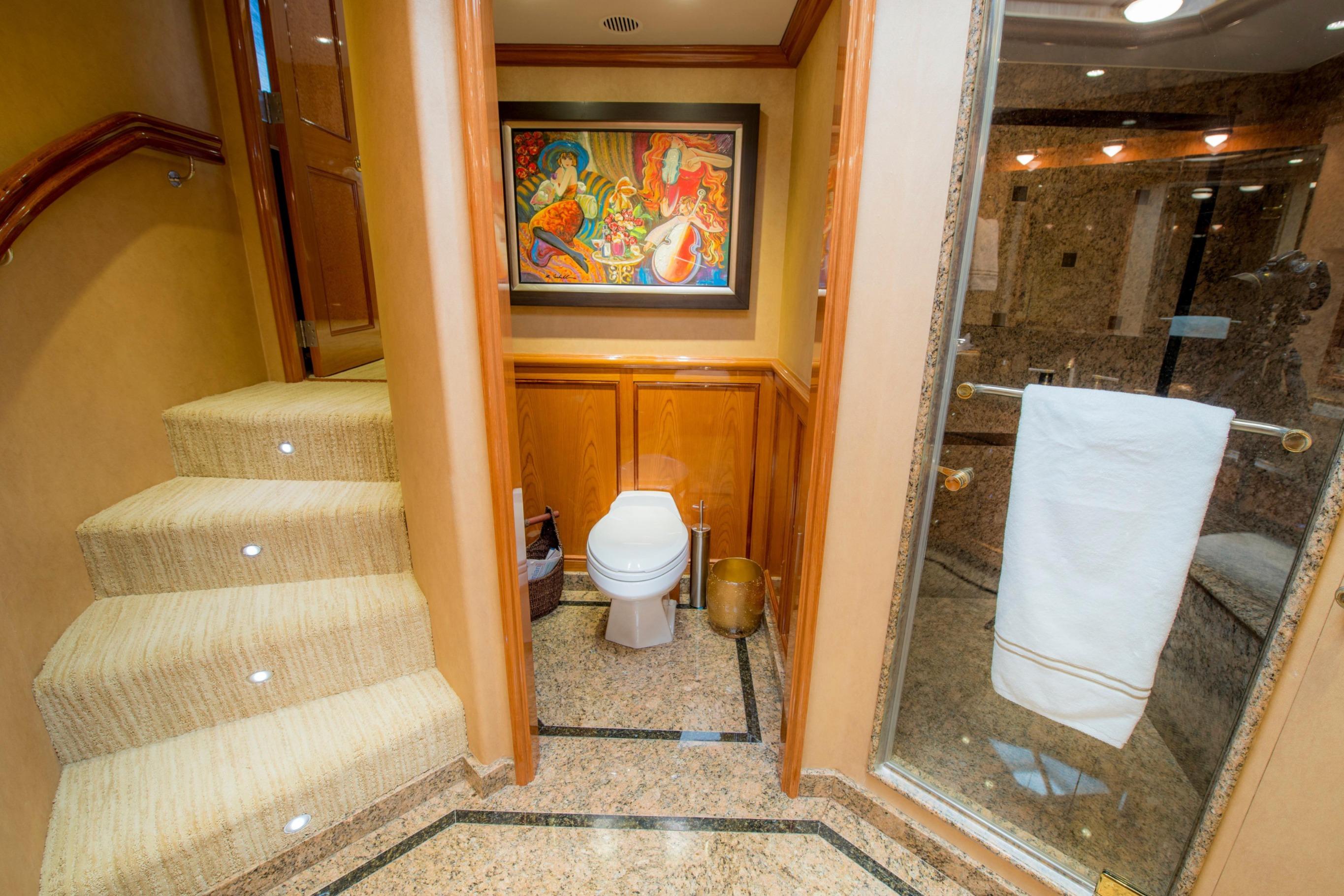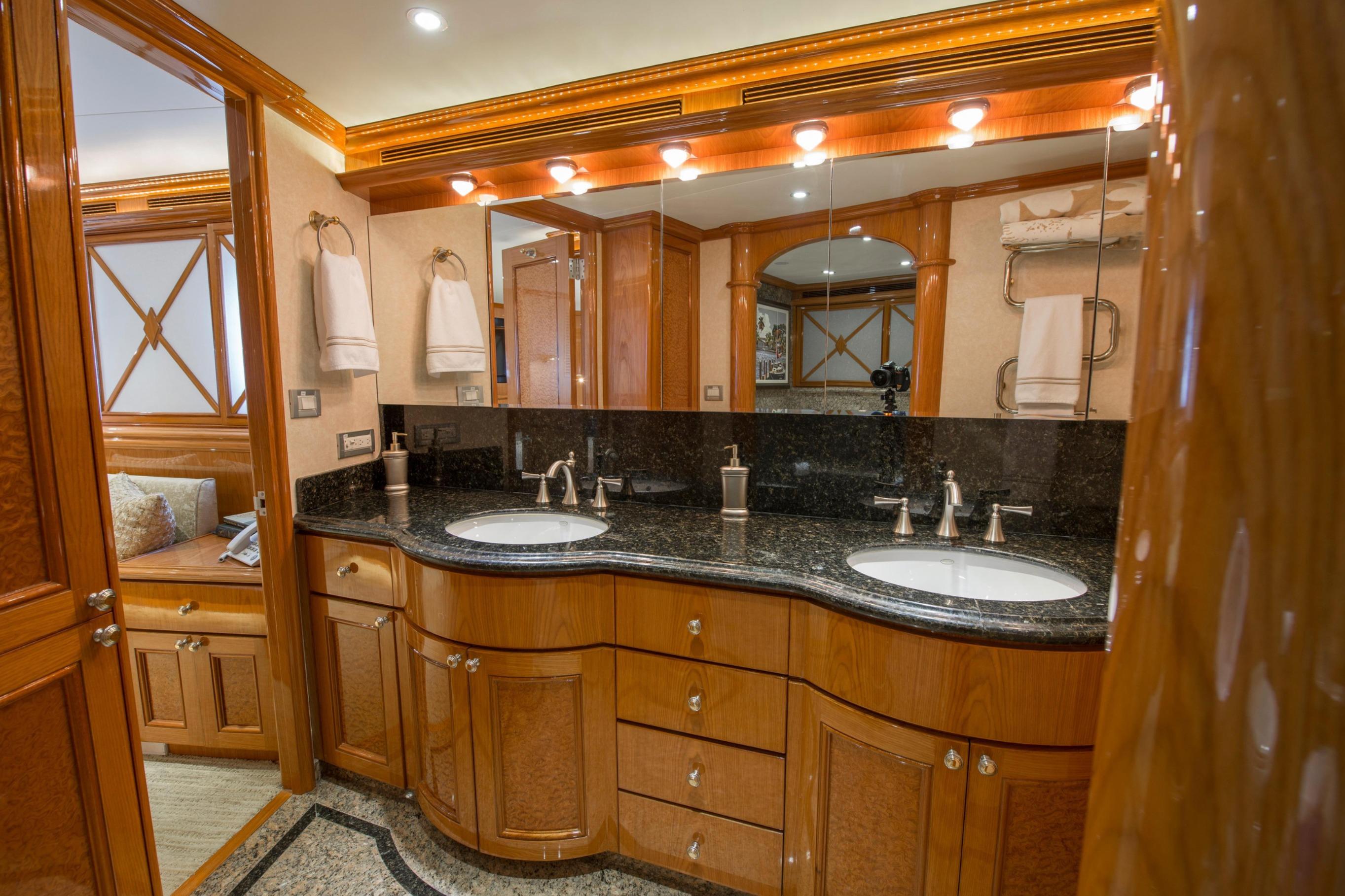 FOOTLOOSE sleeps 8 in four lavish en-suite staterooms: a full-beam main-deck master with king berth, walk-in closets, and spa bath; a forward VIP with another king; and two amidships queens. Warm teak interiors, neutral palettes, and refreshed soft goods create serene spaces. The salon-dining flows to a pro galley and wetted bar. Crew of 3-4 quarters separately with full amenities.