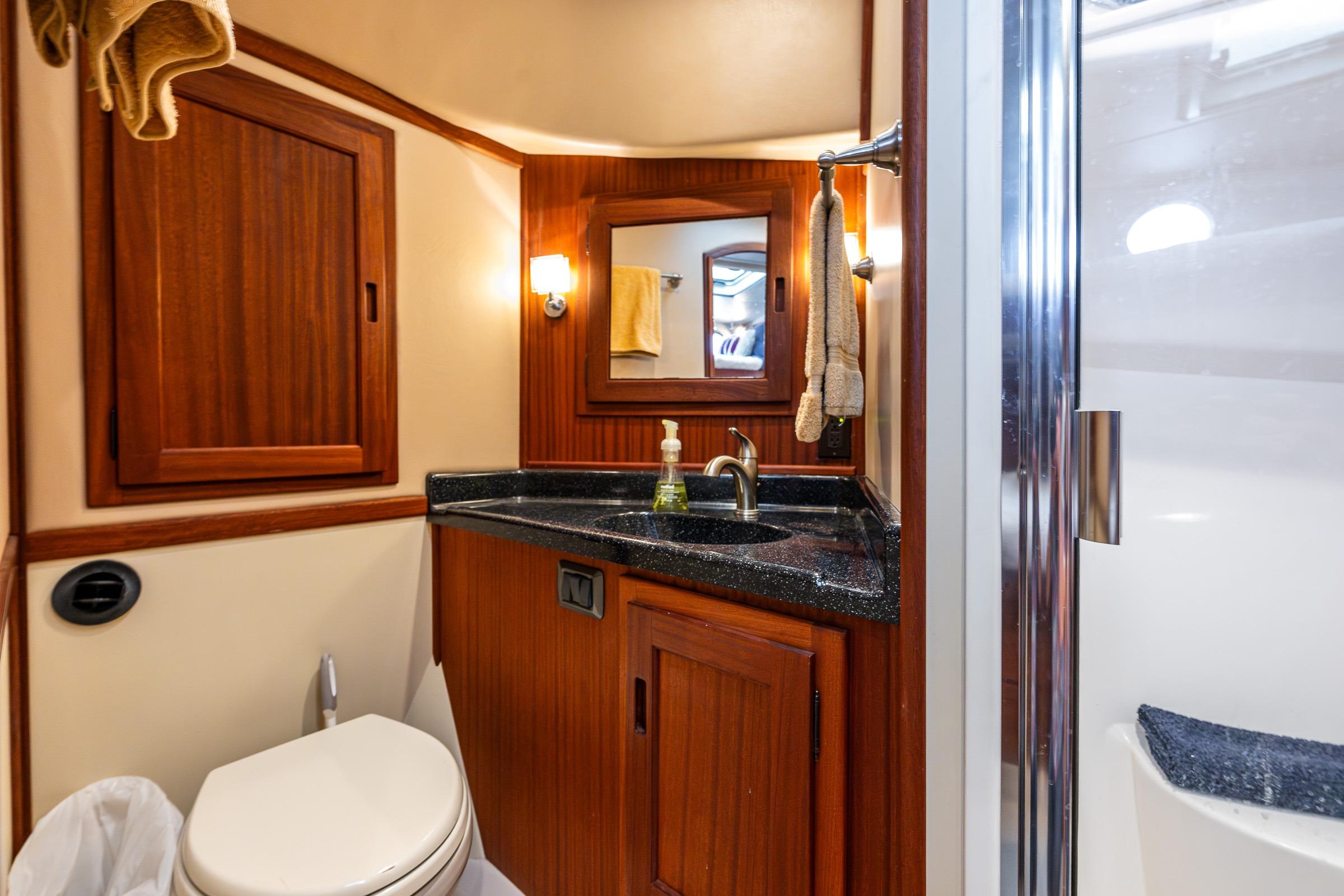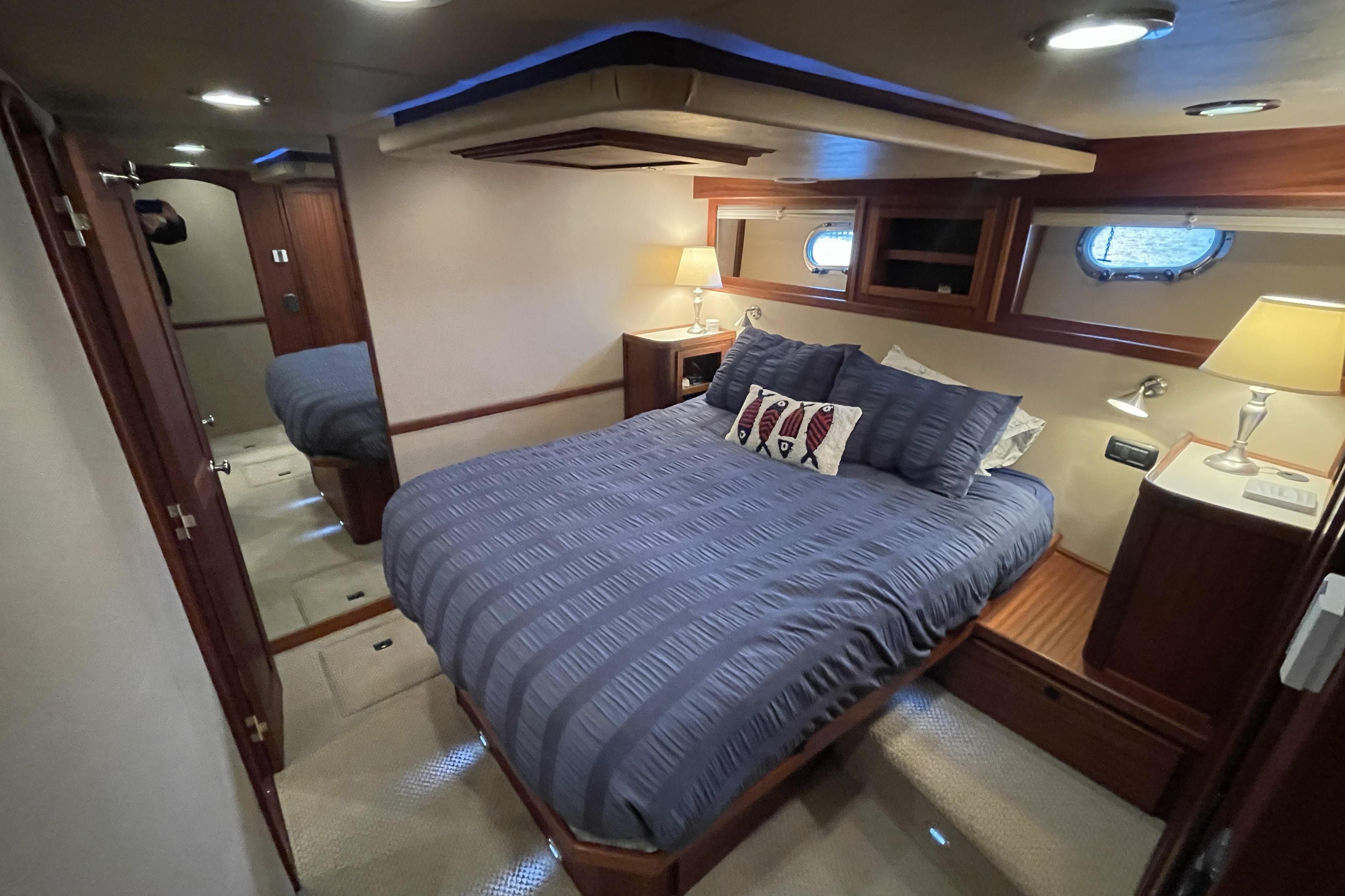The owners suite is located midship and offers a pedestal queen island bed with built-in storage, a ceiling art design that mimics the bed design with LED indirect blue lighting & a fold down ceiling TV, nightstands with GFCI protected outlets, dual stainless steel portlights, diesel heat, flooring courtesy lighting, carpeted flooring and an ensuite head with a stall shower. Note: A great bed feature is that it was designed so you can make the bed without having to tuck the sheets & comforter in between the bedframe and the nightstands as you have to do with so many other vessels.
