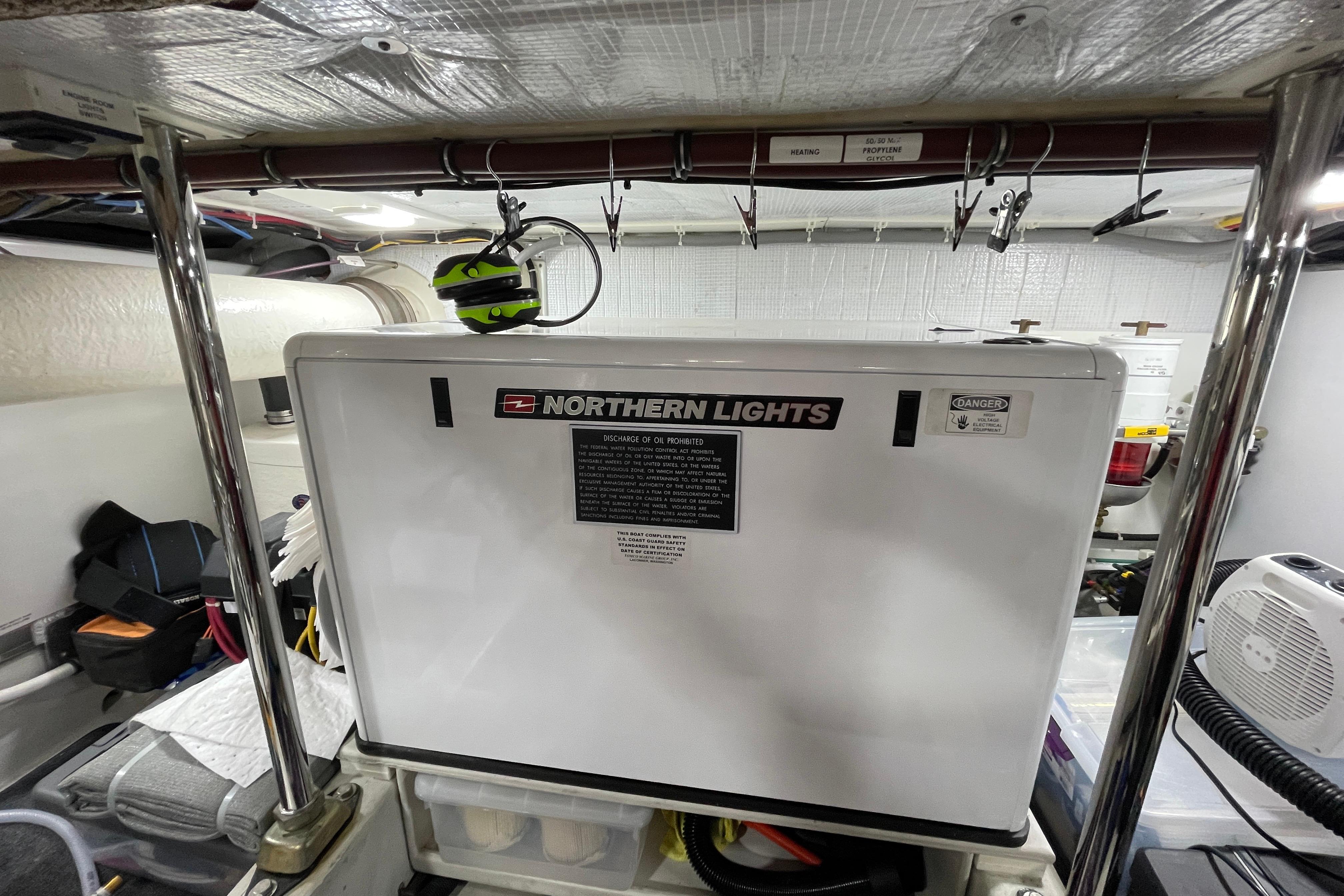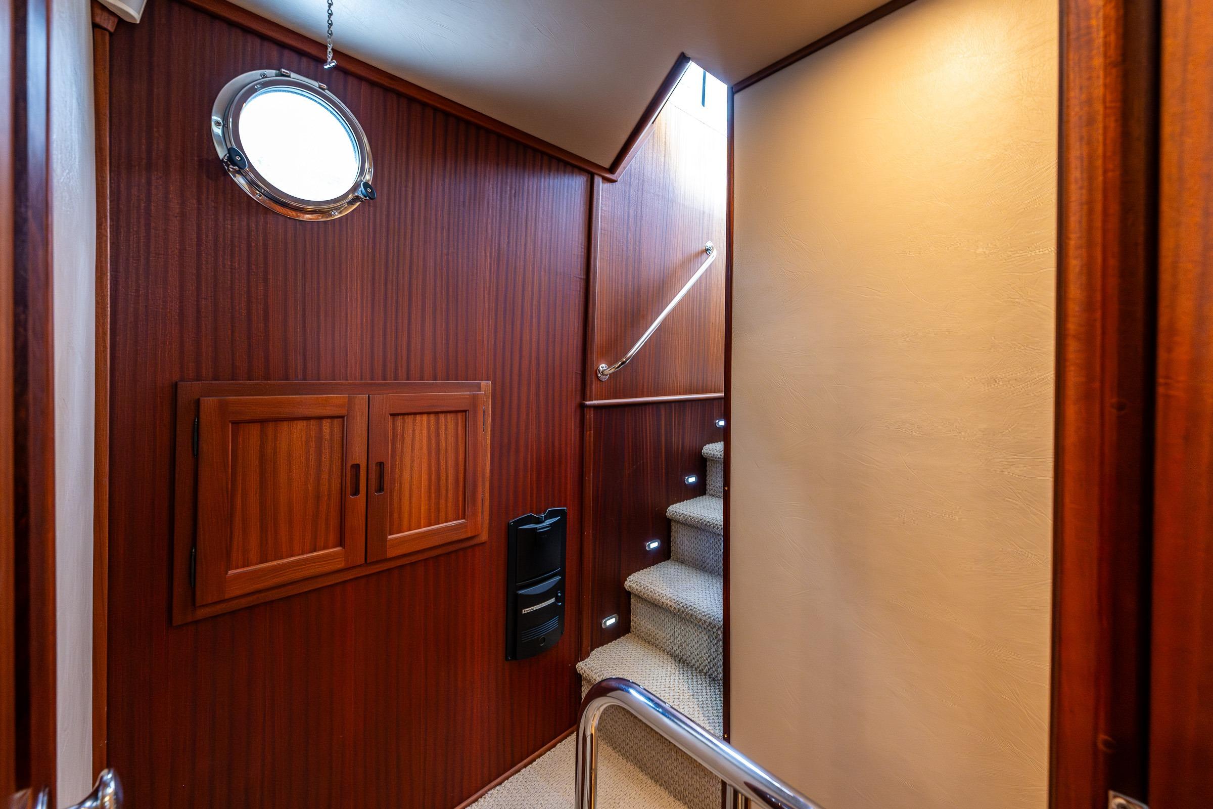 The foyer is just a couple of steps down from the pilothouse, featuring newly carpeted flooring, a central vacuum system, skylight with screen, storage cabinets, CO detector and LED lighting. A nice feature is the main overhead light is motion activated, so you can leave the light switch on and if you get up in the middle of the night to check something in the vessel the light will illuminate.