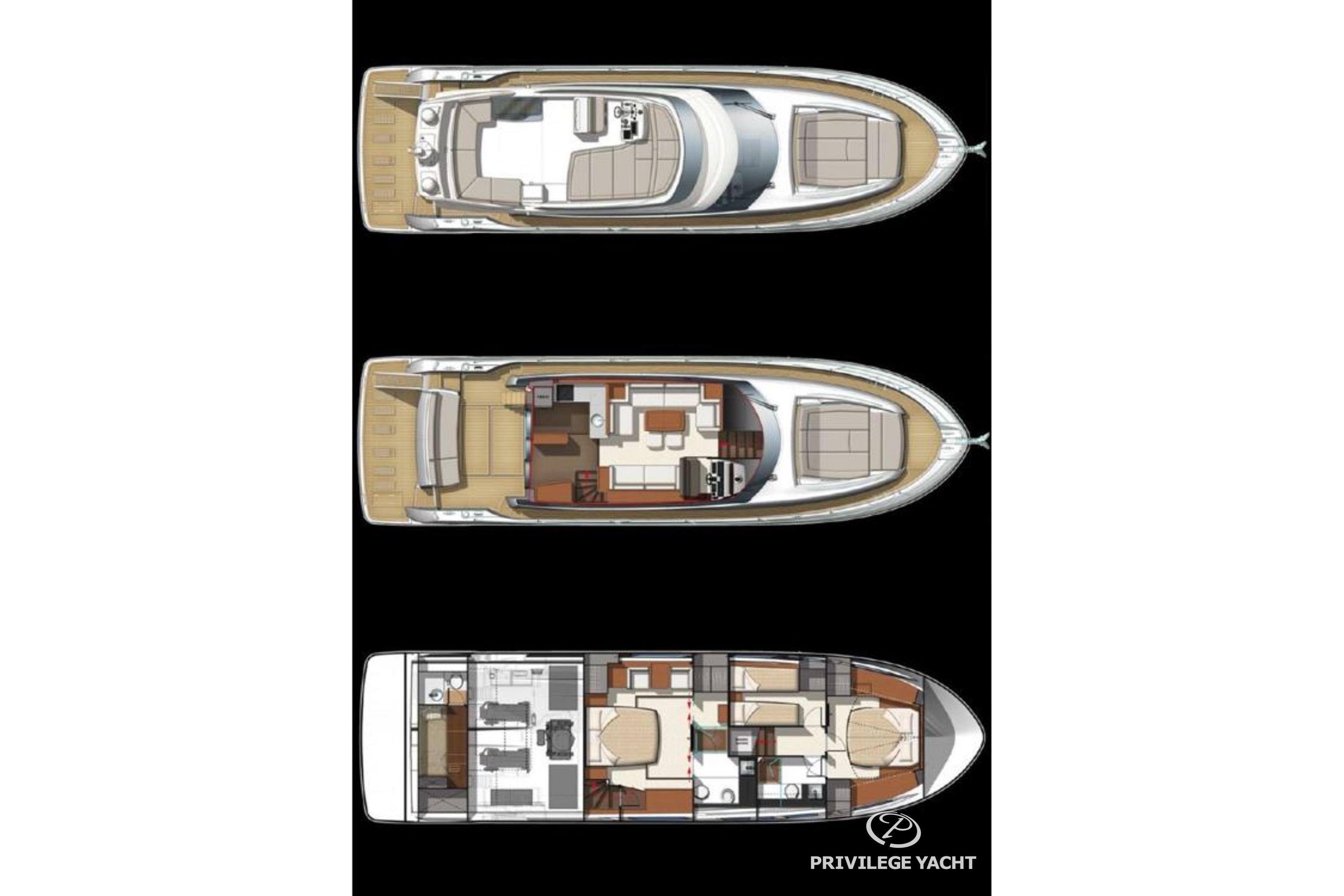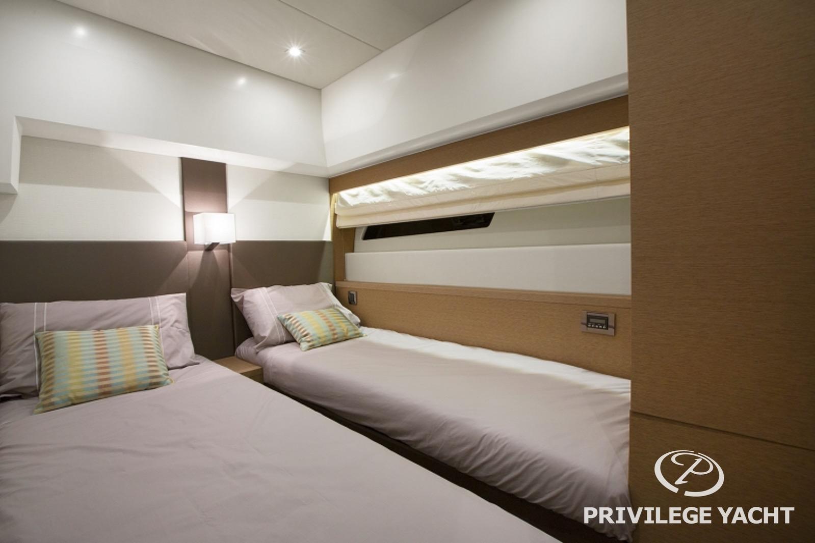 With an overall length of 17.92 meters and a beam of 4.79 meters, the Prestige 550 offers generous interior and exterior spaces. The layout features three beautifully appointed cabins and two bathrooms, along with a separate crew cabin, comfortably accommodating up to seven guests. The interior combines refined materials, warm tones, and ample natural light, creating a luxurious yet inviting atmosphere.