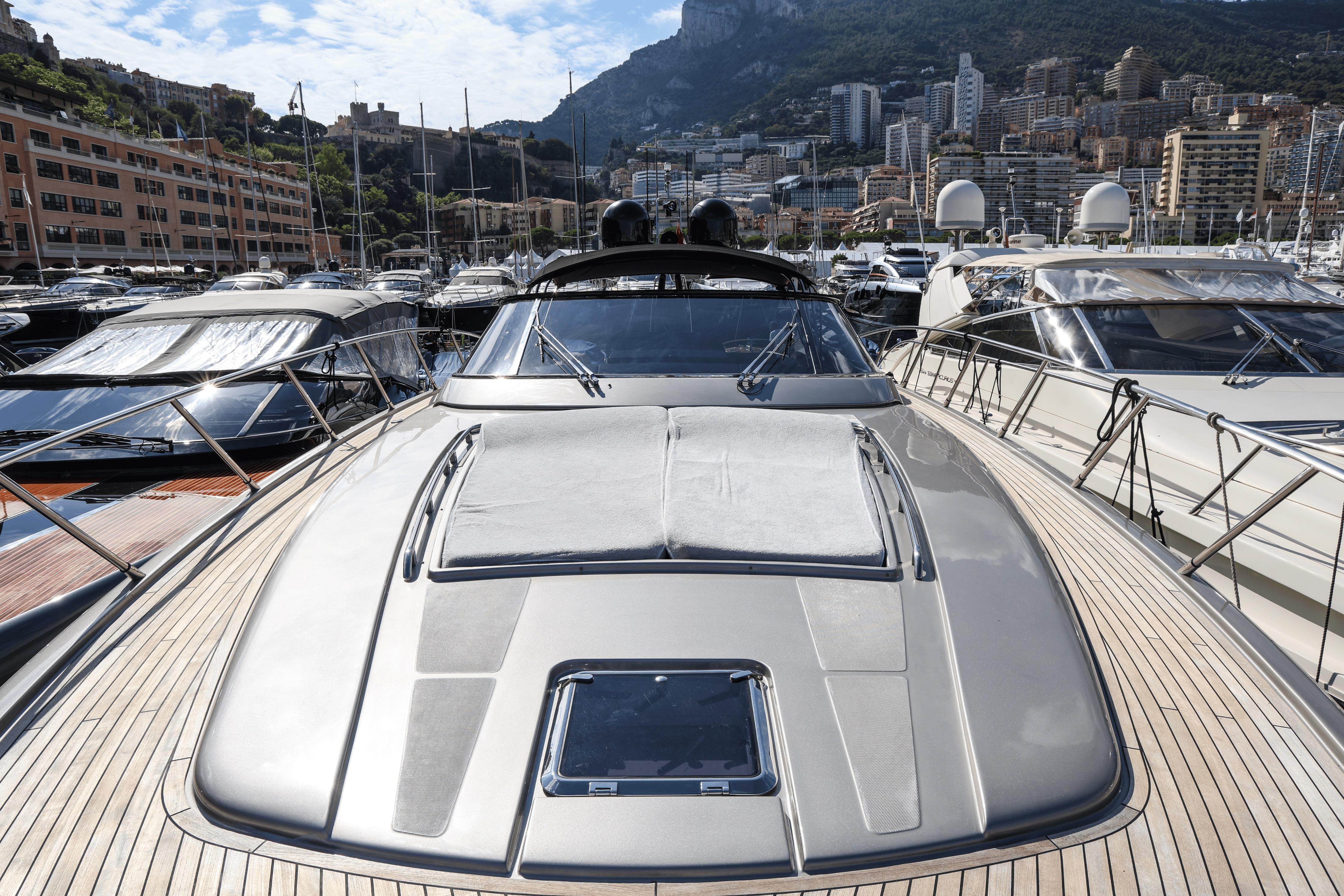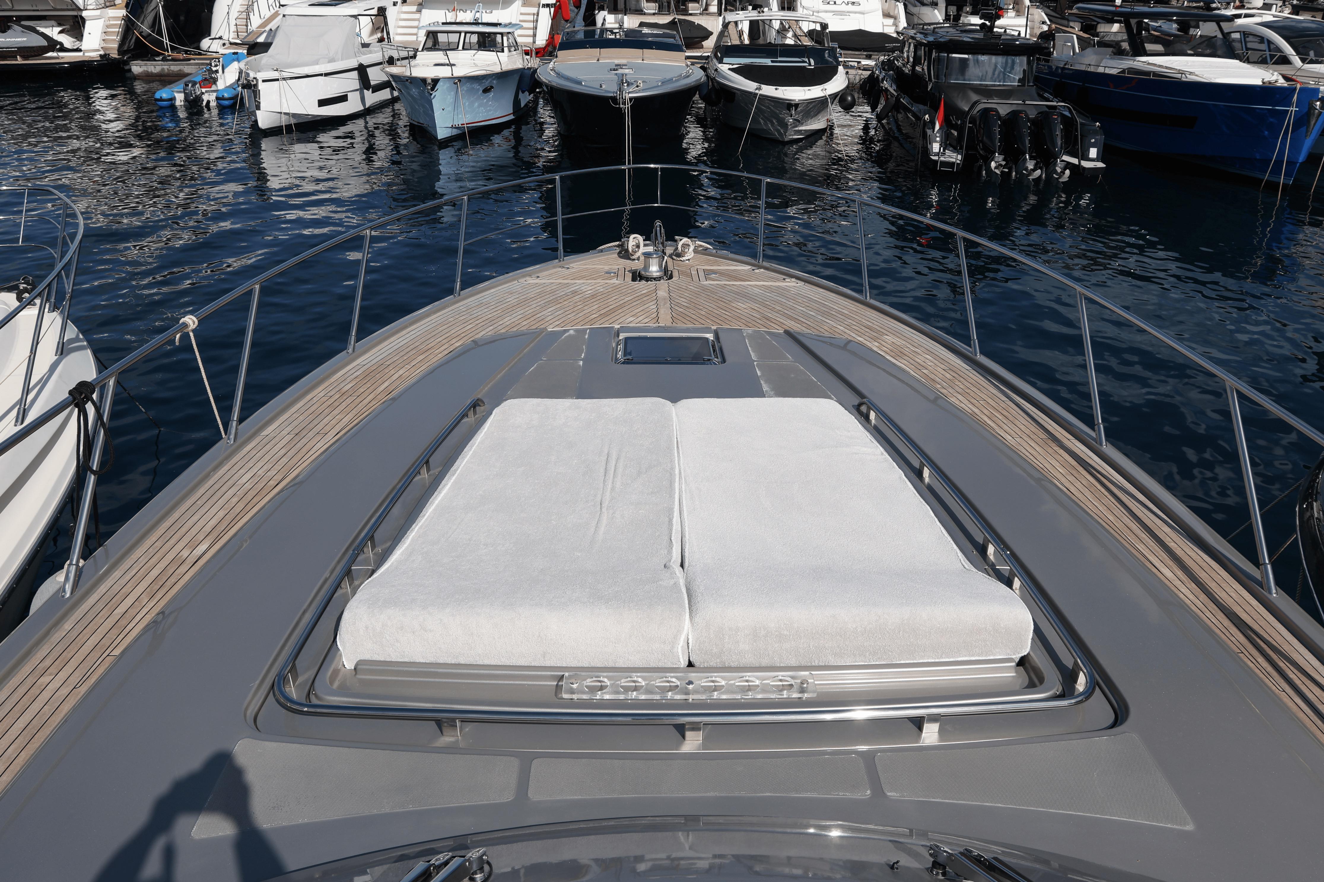 The Riva 63’ Virtus, flagship of Riva’s open line, blends Mediterranean style with timeless elegance. It offers spacious, comfortable living areas and a sleek profile highlighted by large side windows. Modern teak and stainless-steel details give it a sporty character. Powered by twin 1360 mhp MAN engines, it reaches 40 knots and cruises at 35.