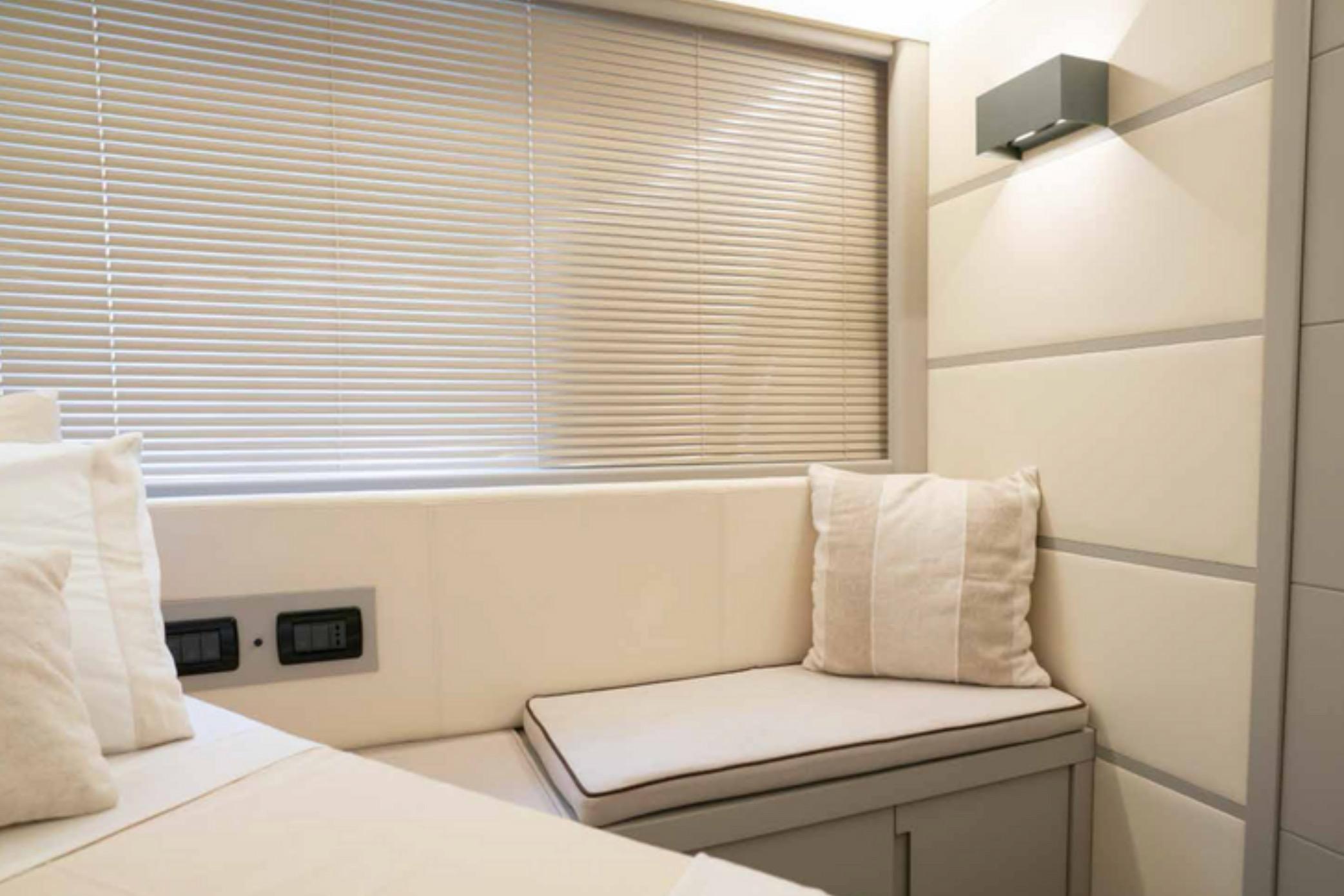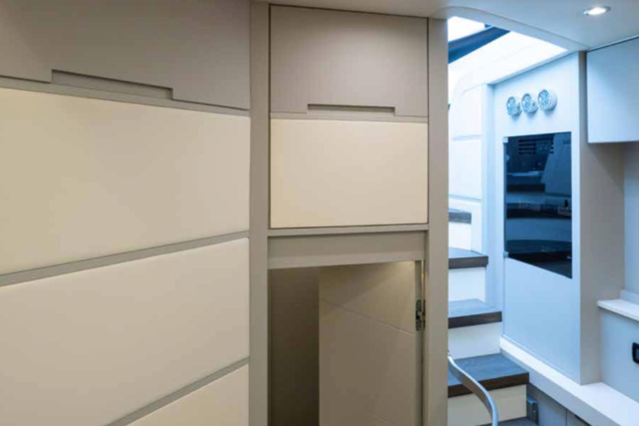 All’interno, gli ambienti sono essenziali ma raffinati, progettati con materiali pregiati e finiture su misura. La domotica integrata controlla luci, clima e intrattenimento, mentre la cucina è funzionale e completa, con piastra a induzione, forno multifunzione, frigorifero e freezer capienti e una dispensa ottimizzata.