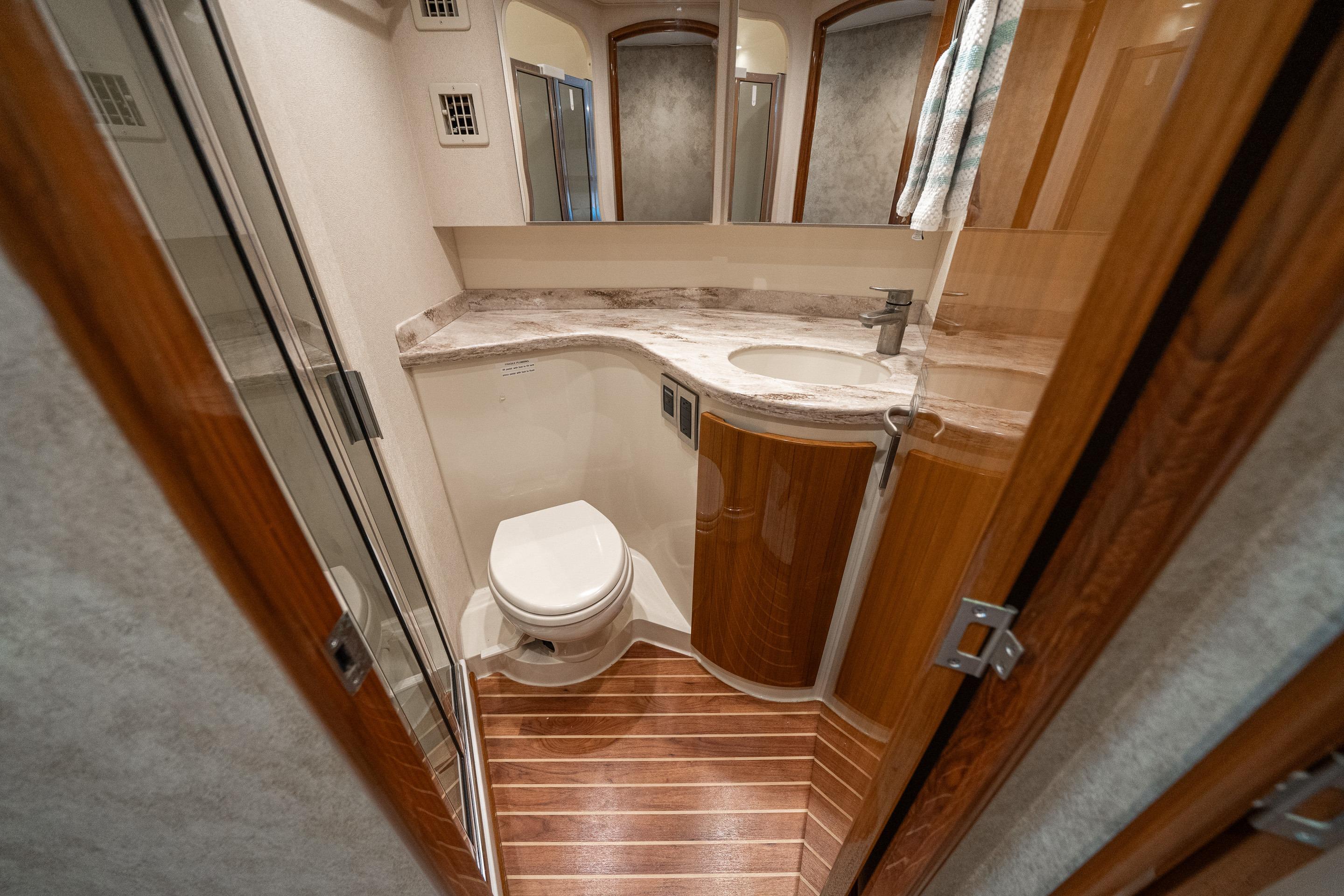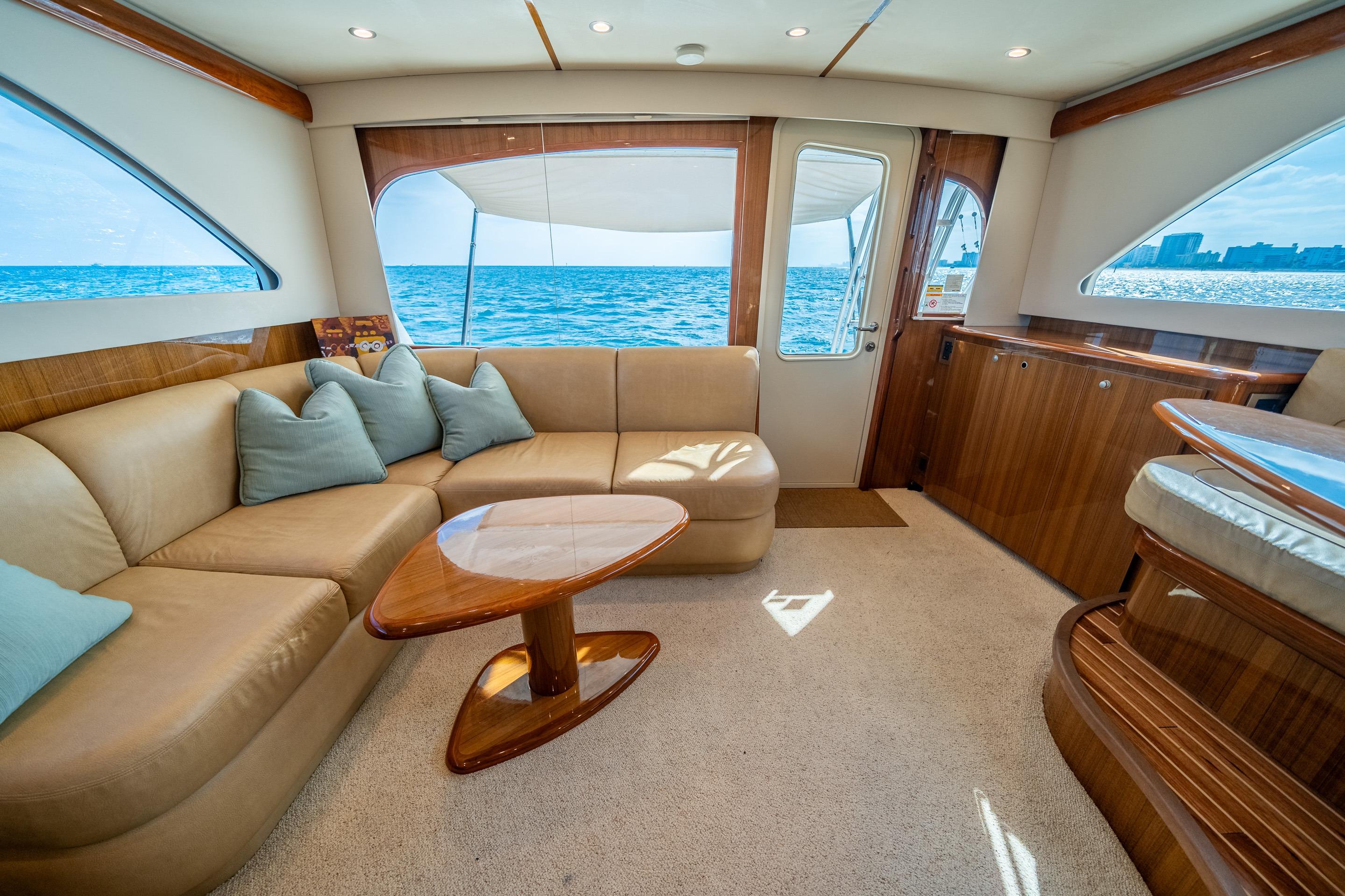 Standing in the cockpit you have access to the engine room, flybridge and interior. Engine room access is located centerline, under the mezzanine cushions, through a hatch. Flybridge is accessible by ladder located in the cockpit, port side fwd. The main salon door is just off center to port. In the main salon you have an L shaped sofa to stbd and a raised dinette port side fwd. There are two bar stools in the stbd forward salon with a raised Corian countertop overlooking the sunken galley. Two steps down centerline you have open access to stbd galley arrangement. The centerline hallway will lead us forward to our two stateroom two head arrangement. The guest bunk room is port side midships. The full guest head is forward of the stateroom with day head access from the hallway. In the fore peak of RING GAME is the master stateroom. It features an en suite head on the stateroom’s stbd aft bulkhead.