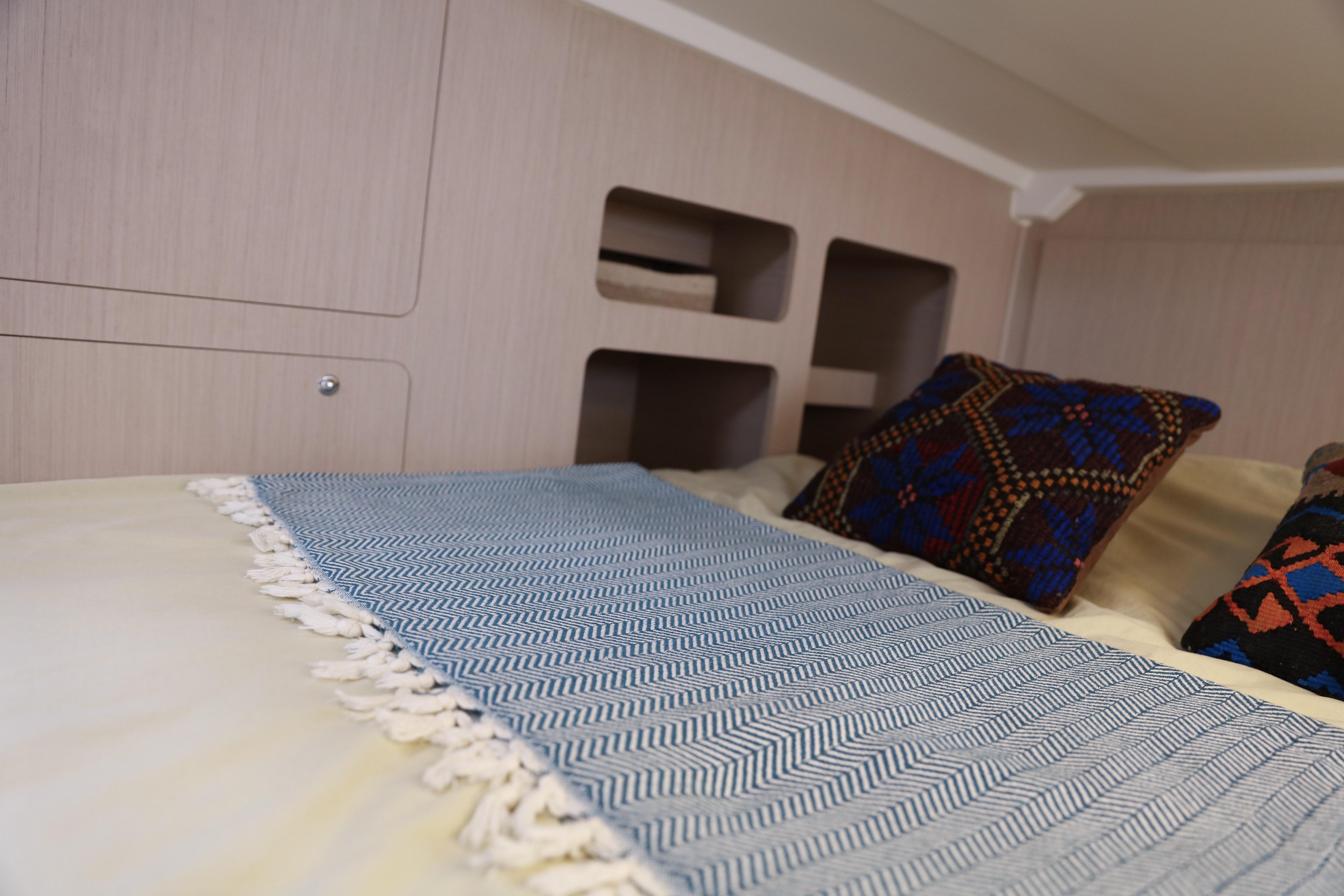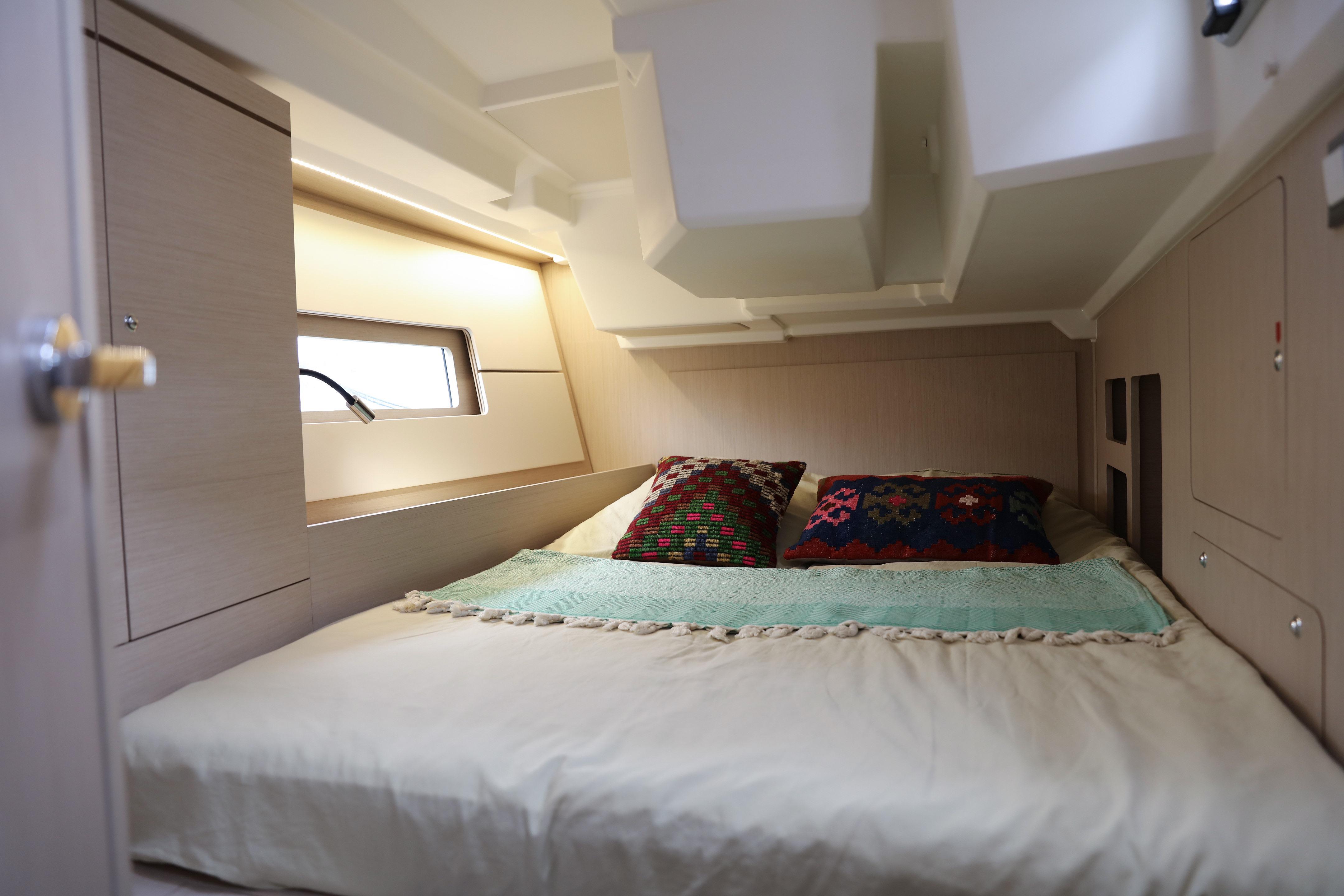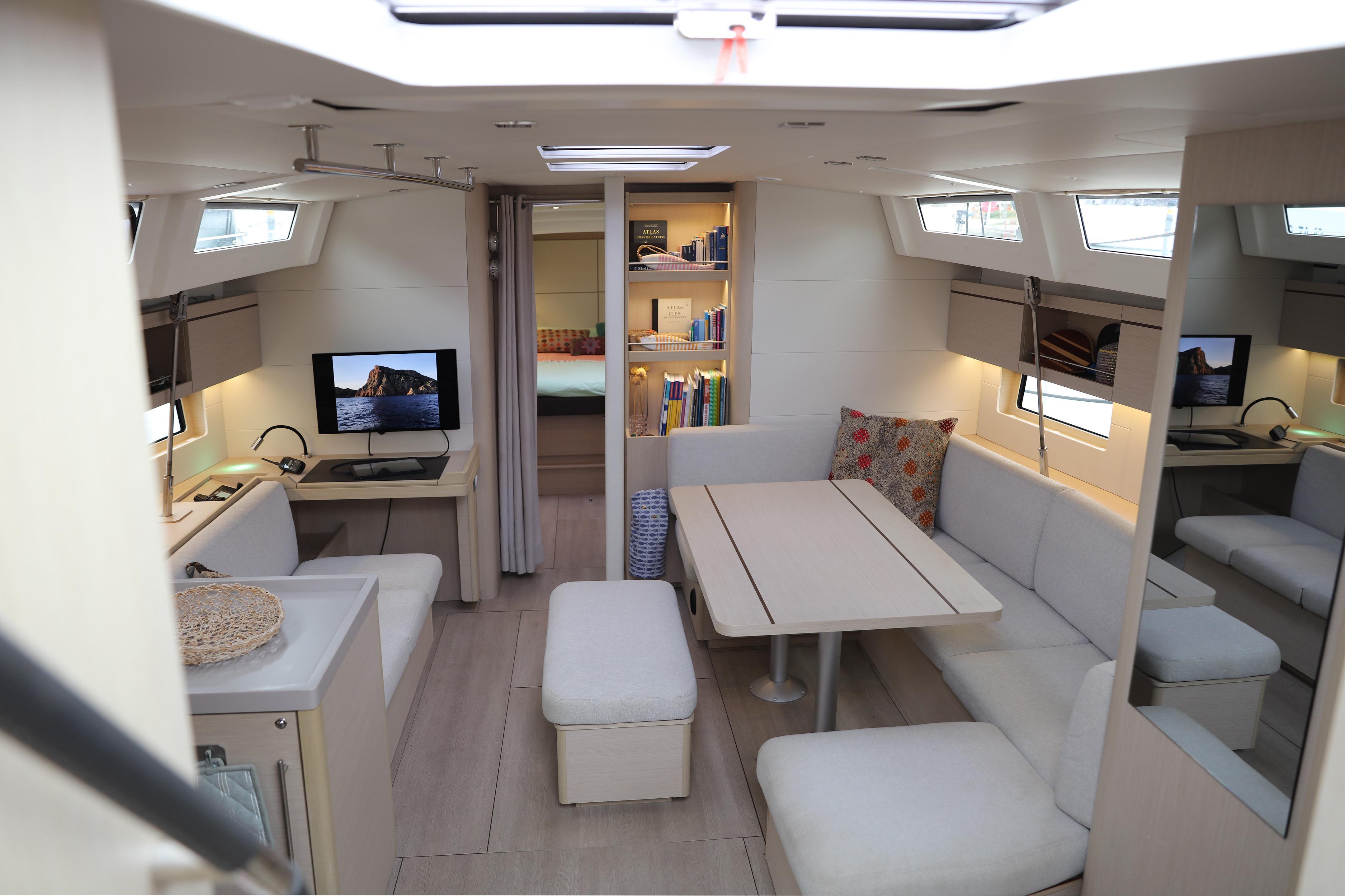 À l’intérieur, le Beneteau Oceanis 46.1 propose 3 cabines et 2 salles d’eau, avec un aménagement chaleureux et fonctionnel.