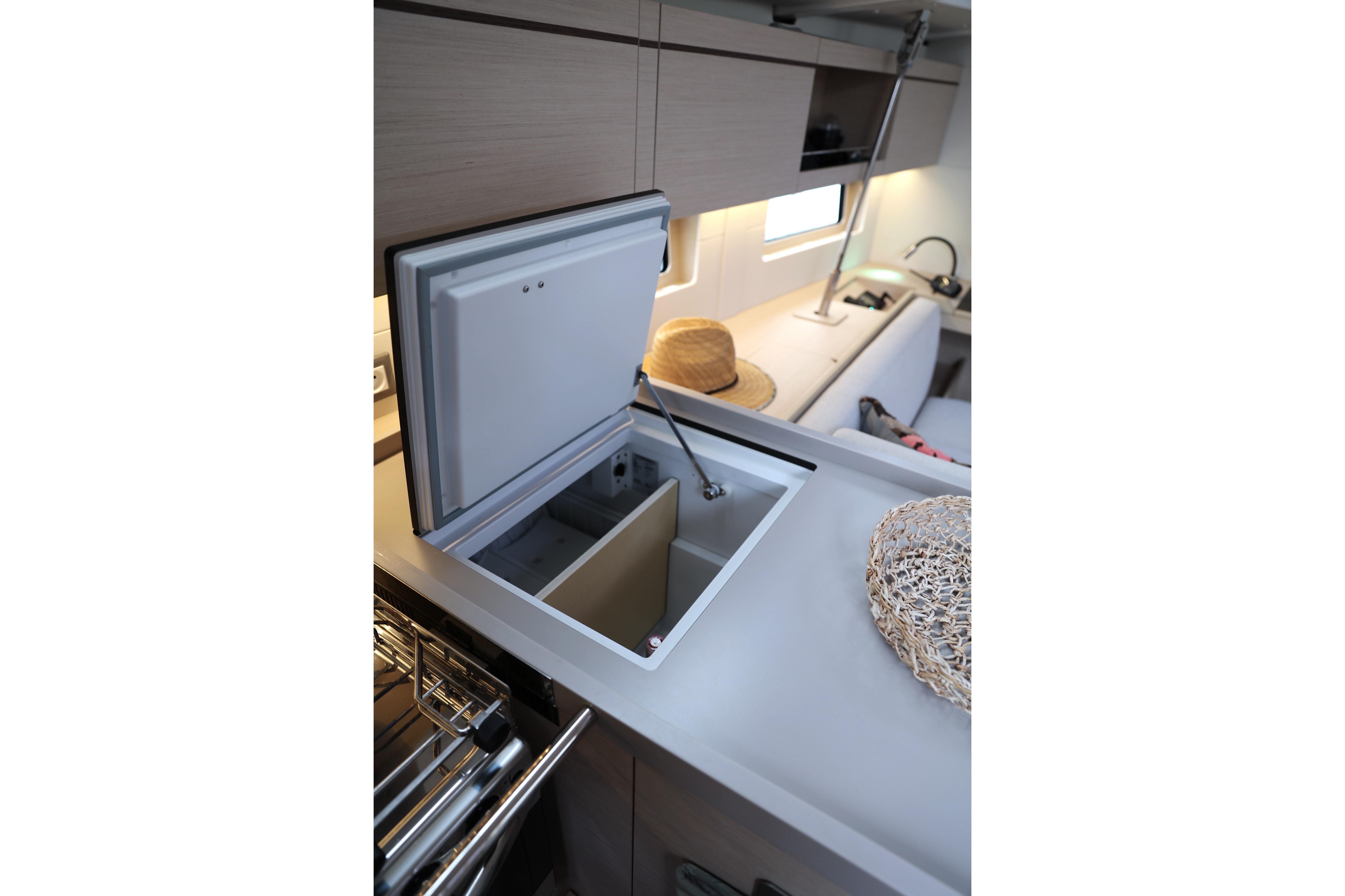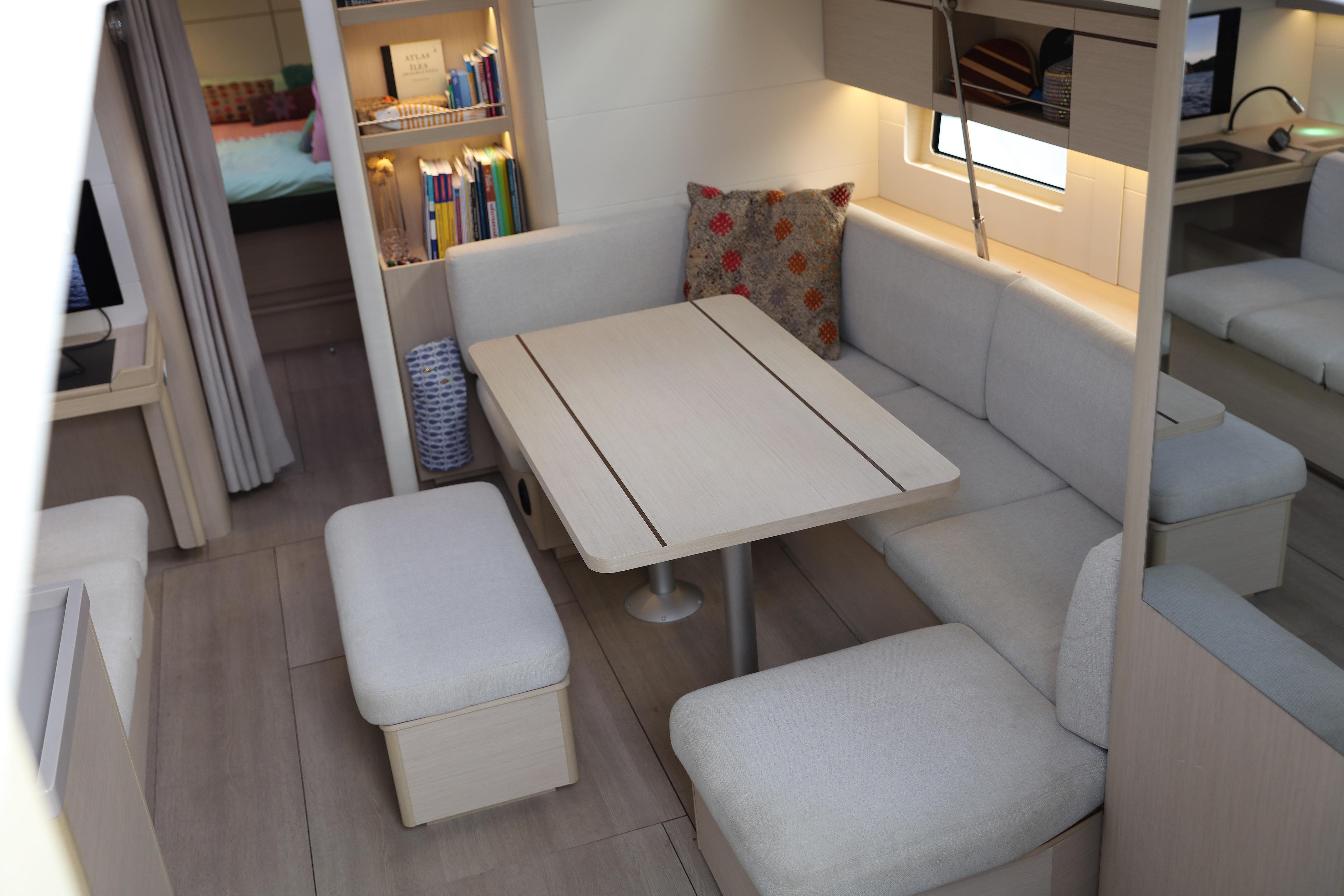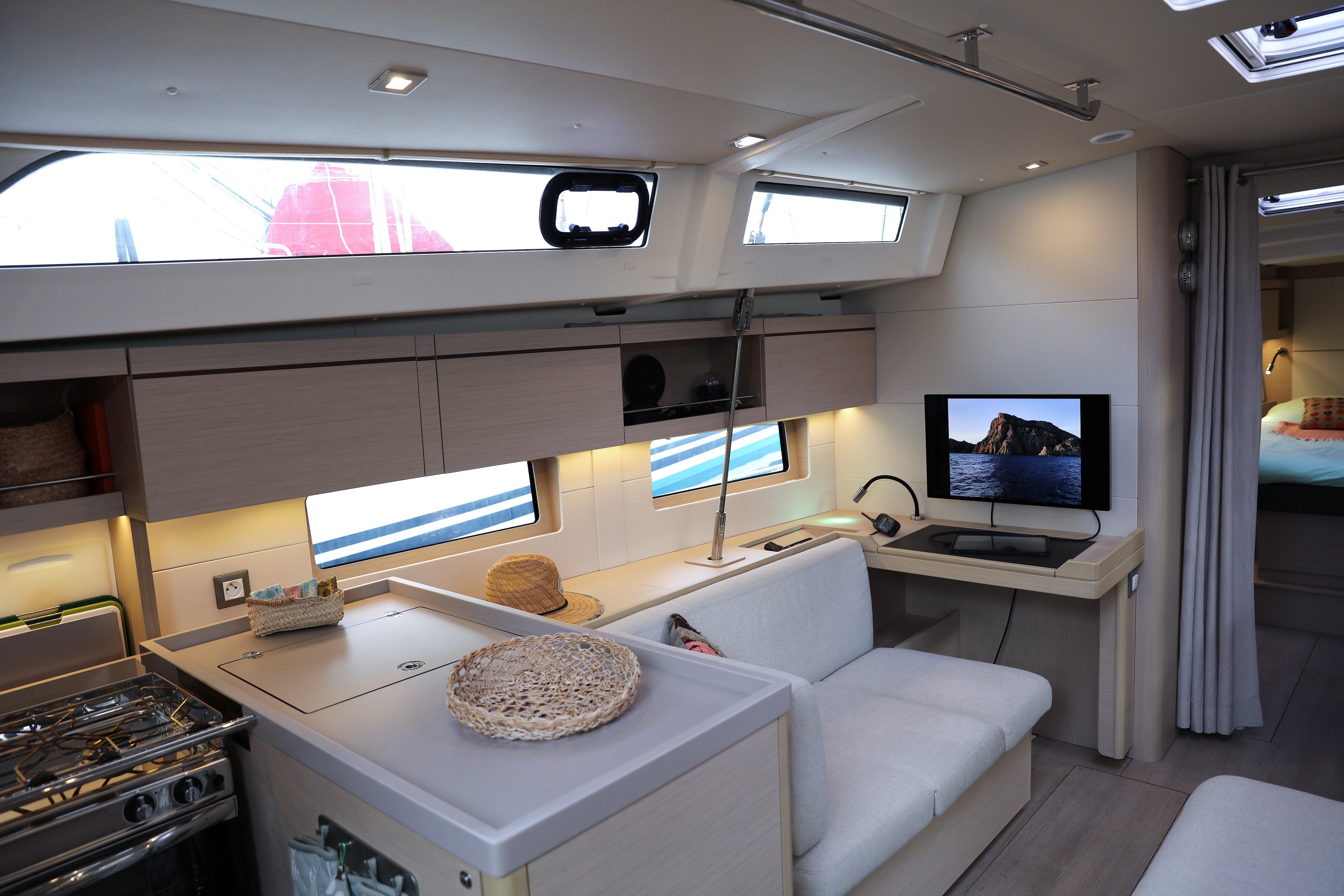 La cuisine en L, le carré lumineux et les nombreuses solutions de rangement créent une atmosphère accueillante, typique du savoir-faire Beneteau.