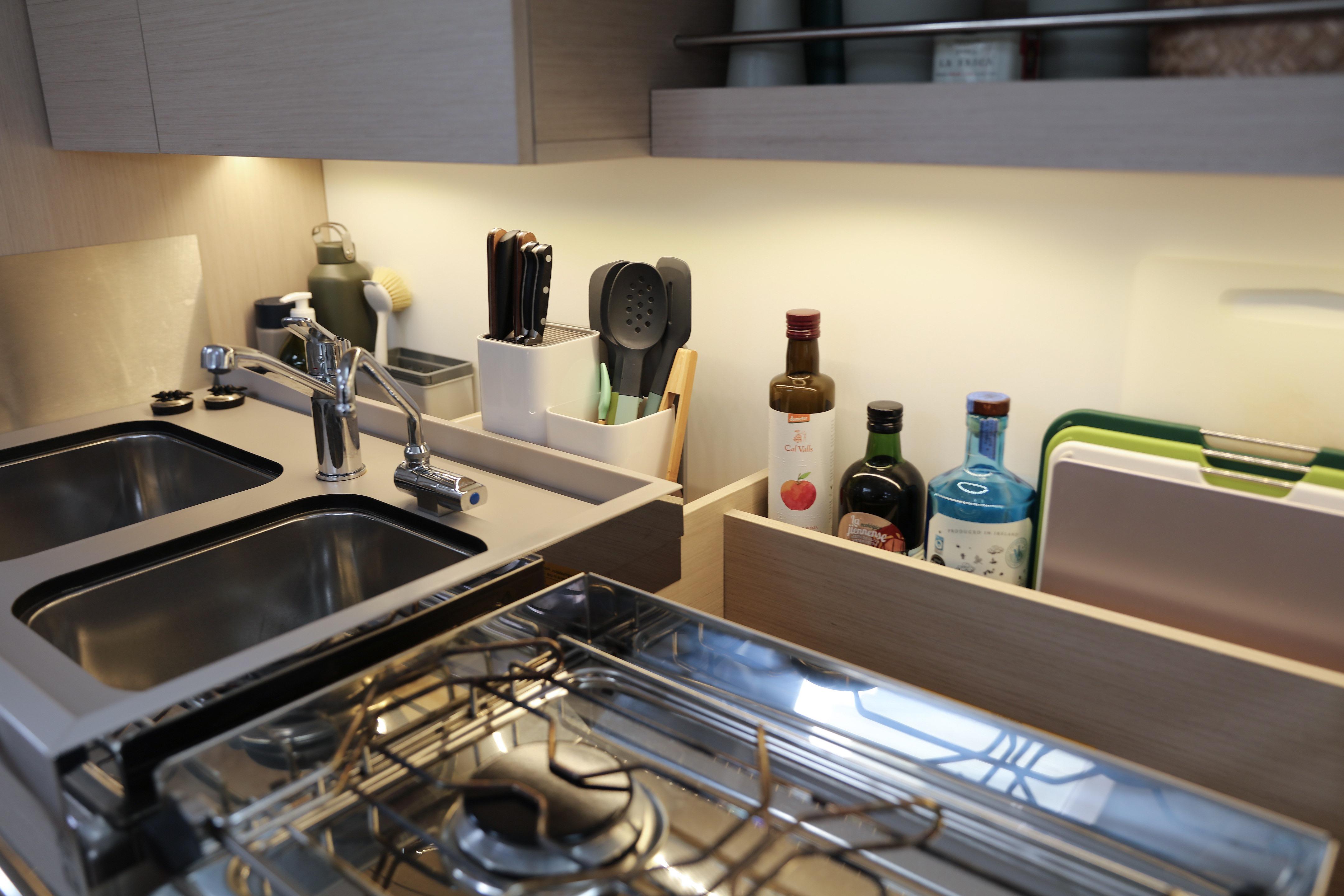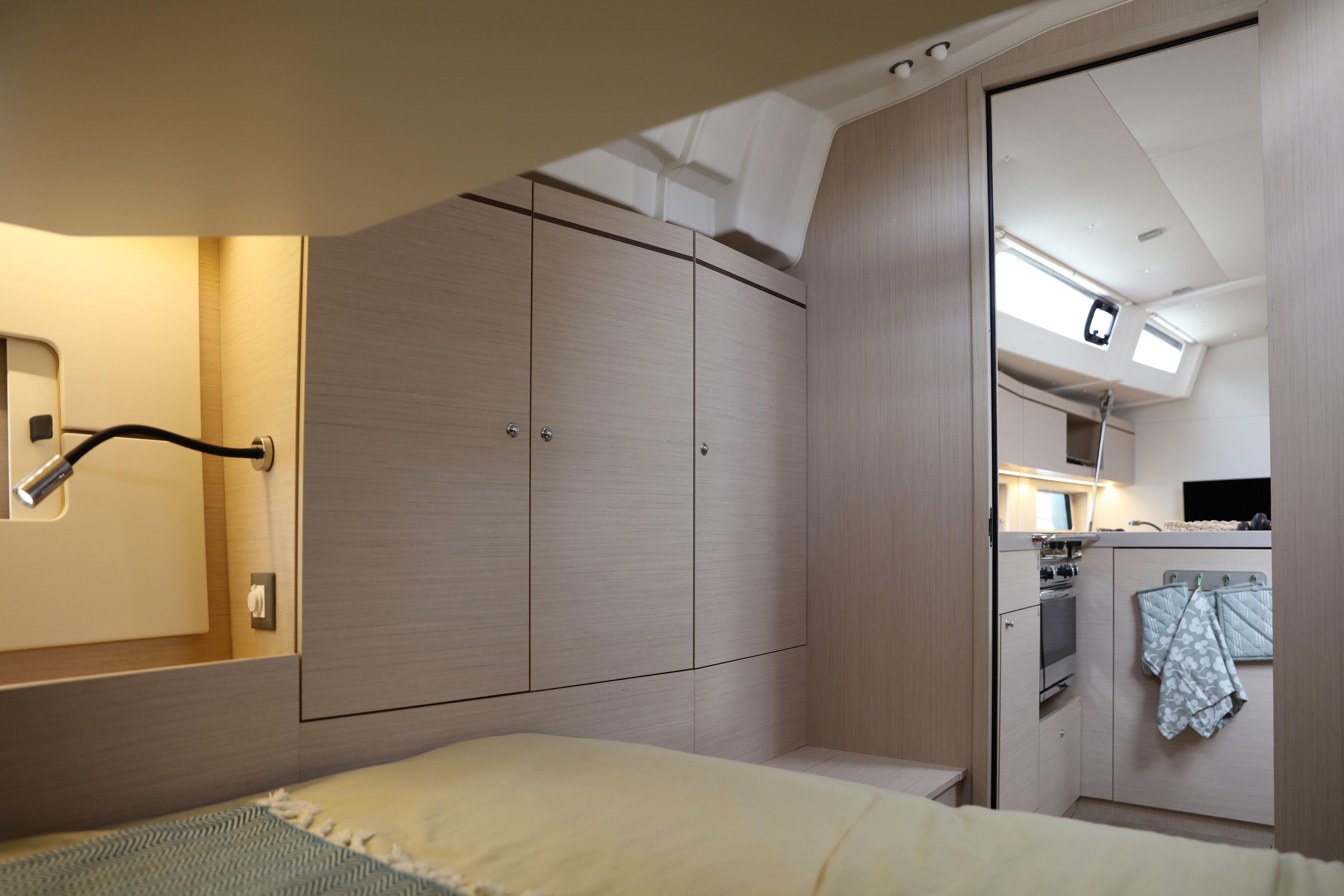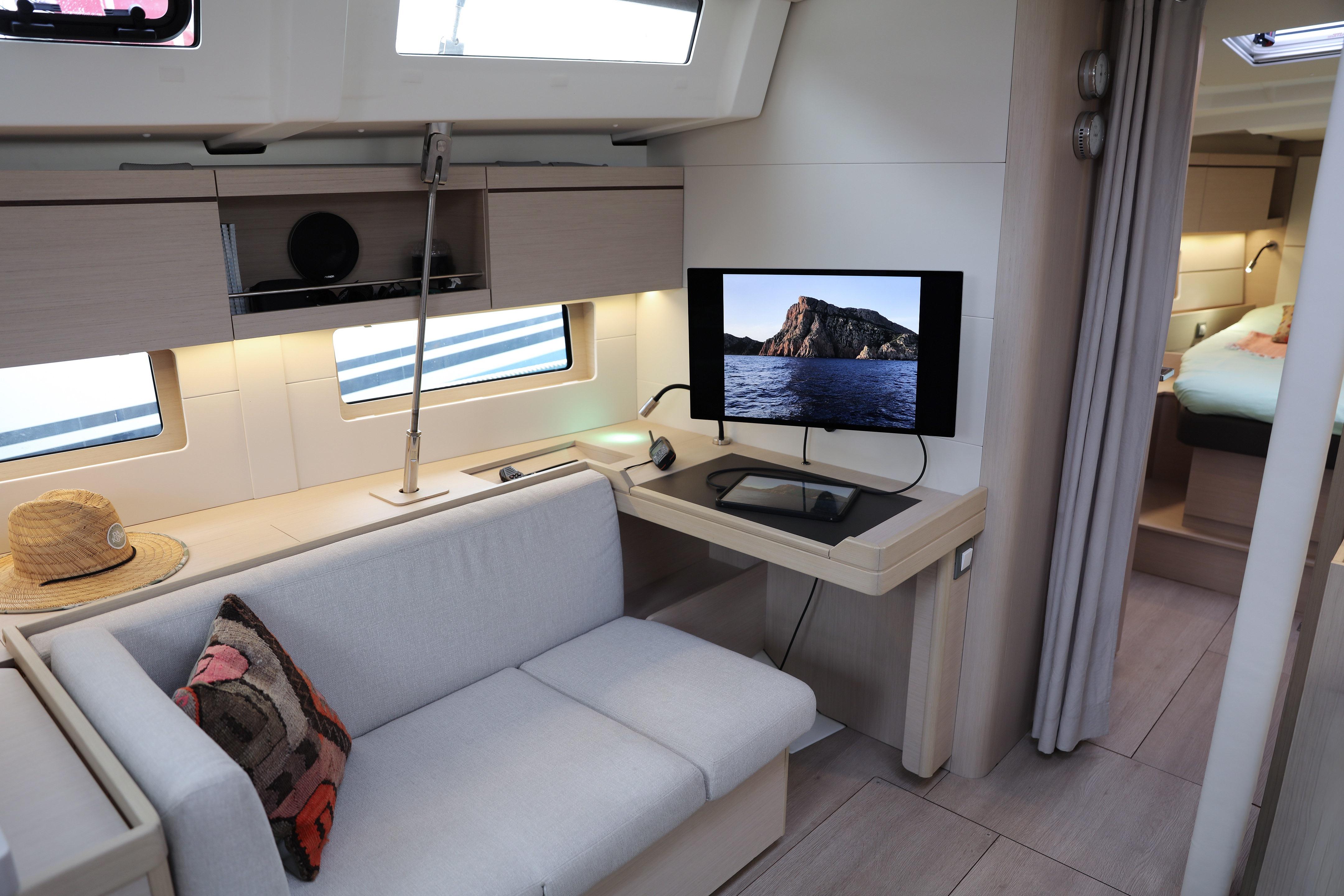 La cuisine en L, le carré lumineux et les nombreuses solutions de rangement créent une atmosphère accueillante, typique du savoir-faire Beneteau.