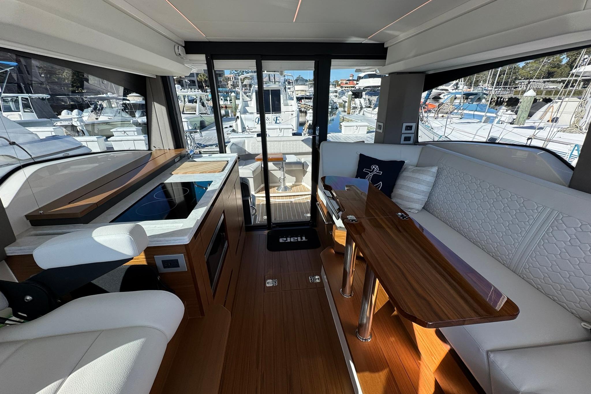 - Aft Cockpit: The social heart of the boat features a versatile, rotating U-shaped lounge seat that can face forward, aft, or towards the portside fold-down hull side terrace, which opens to expand the cockpit space.