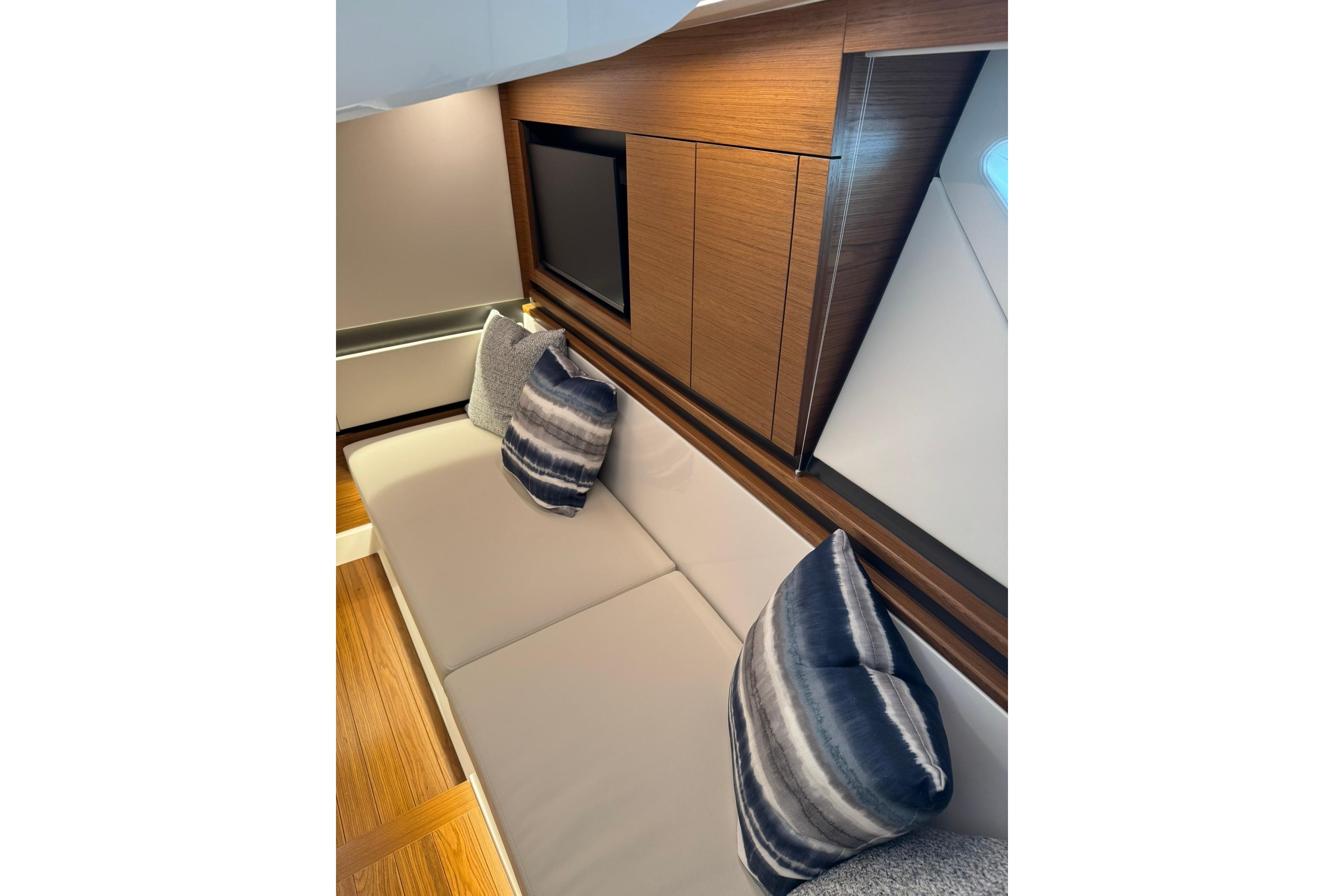 - Helm: The helm station is well-equipped with Garmin electronics, joystick piloting for easy maneuverability, and an optional Seakeeper SK6 Gyro Stabilizer to reduce rolling.