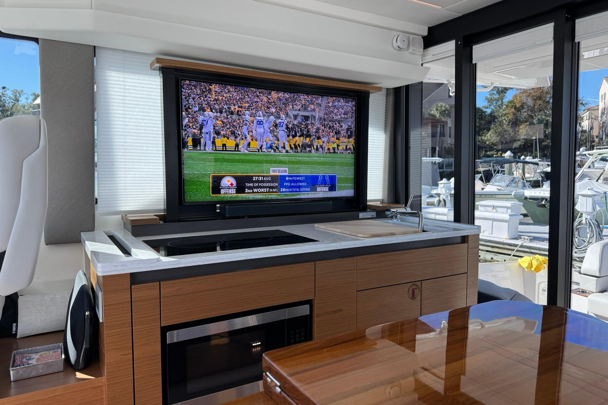 • 43" TV Mounted on Hi-lo Actuator in Starboard Galley, Concealed When Not in Use