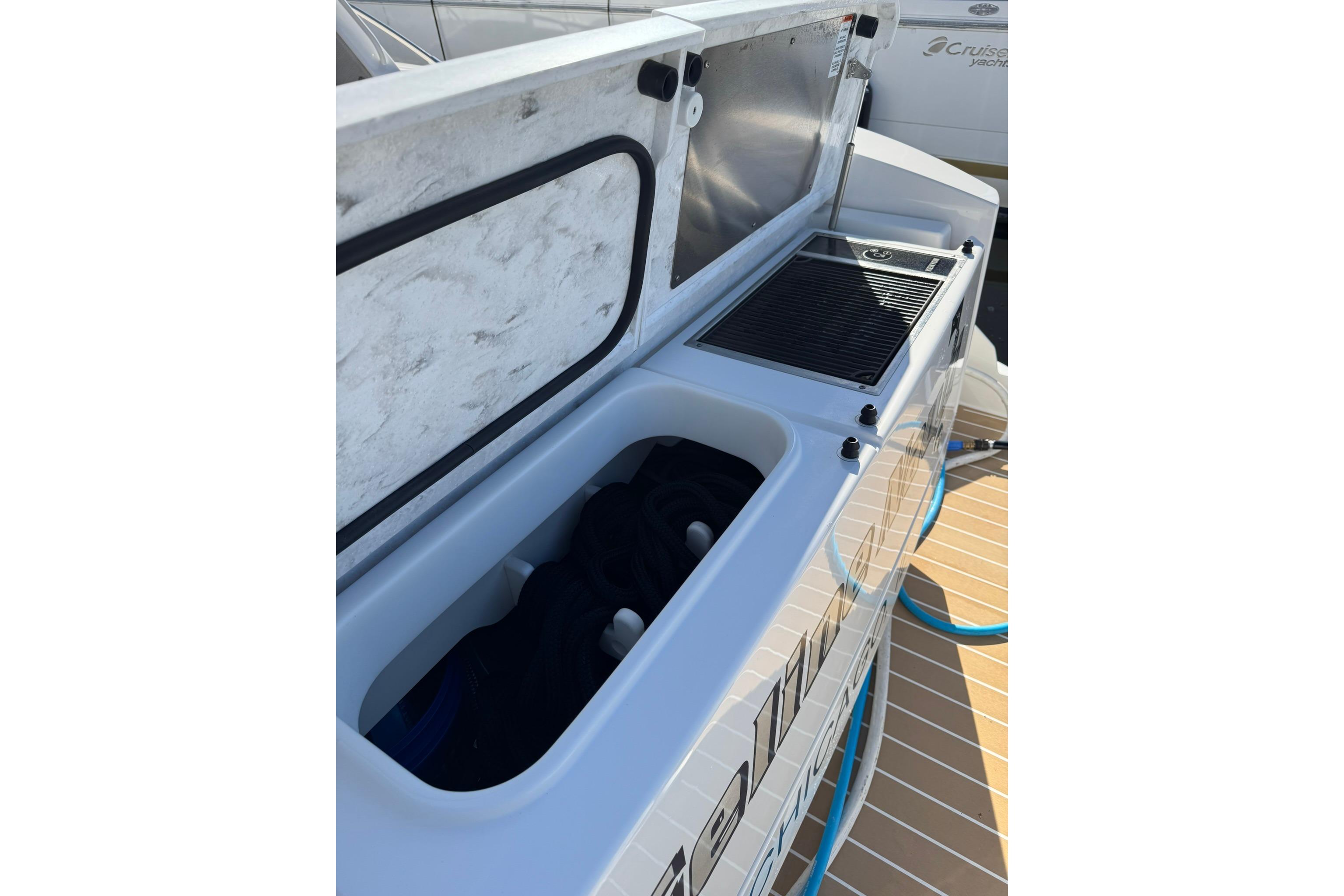 • Anchor Locker with Flush Mounted Fiberglass Lid, Overboard Drain and Fresh Water Washdown